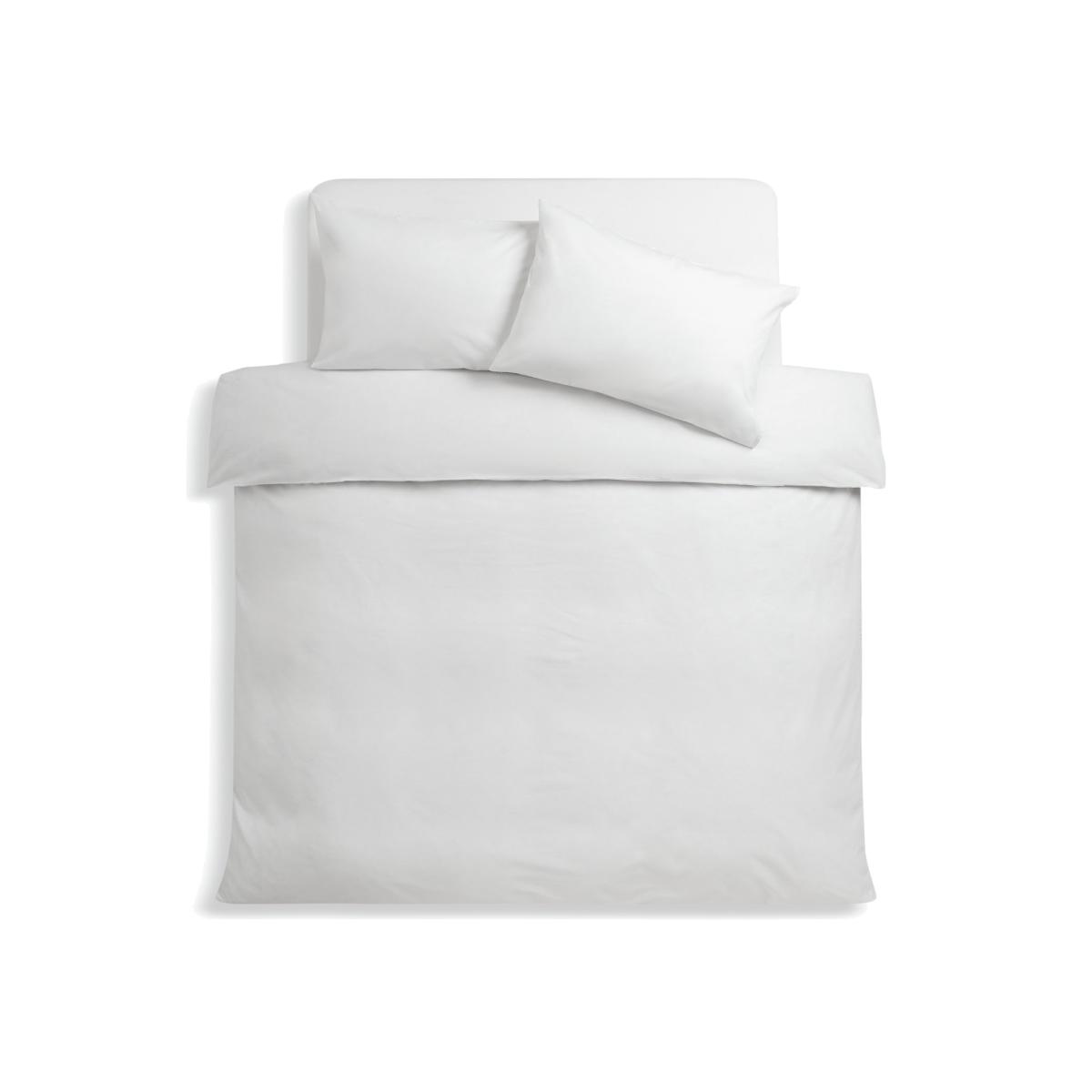 Plain white bedding goes with everything. You can't go wrong with our Easycare bedding bundle. It contains a fresh white duvet cover, fitted sheet and 2 pillowcases. Easy to use, easy to sleep in, easy to live with. This item carries the STANDARD 100 by OEKO-TEX logo, which means you can be certain that every component has been tested for harmful substances and is therefore harmless to human health. 52% recycled polyester, 48% cotton. 144 thread count. Set includes 1 duvet cover, 1 pillowcase and 1 sheet. Bed size: double. Length 200cm, Width 200cm. Buttons for fastening. Standard pillowcase (s). Pillow case length 75cm, Width 50cm. Machine washable at 40 C. Suitable for tumble drying.