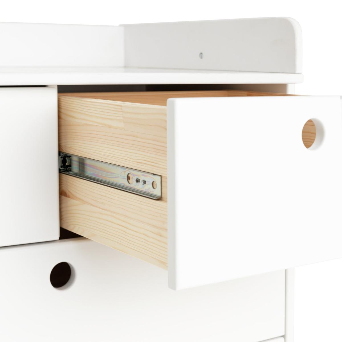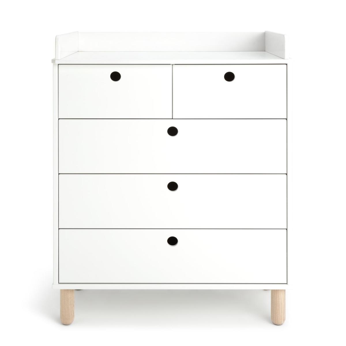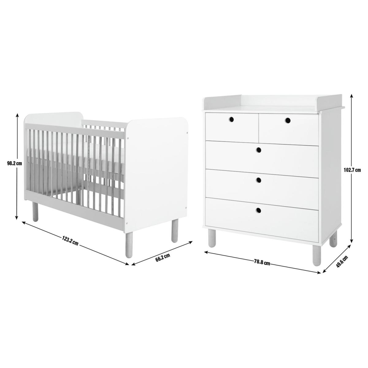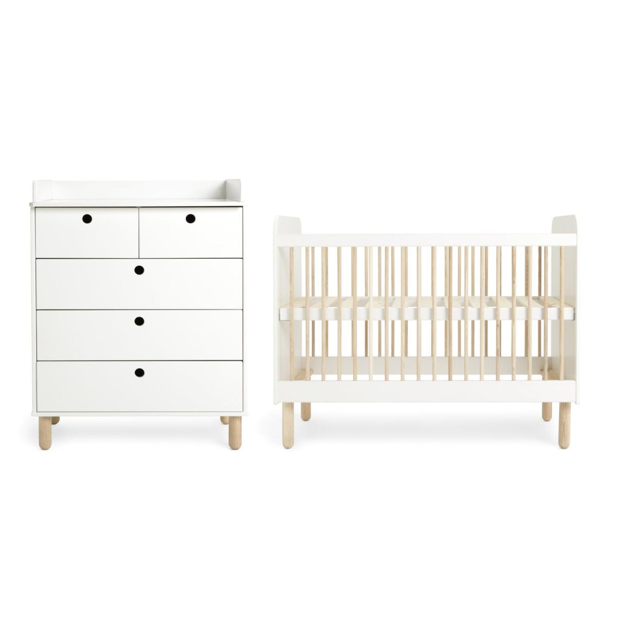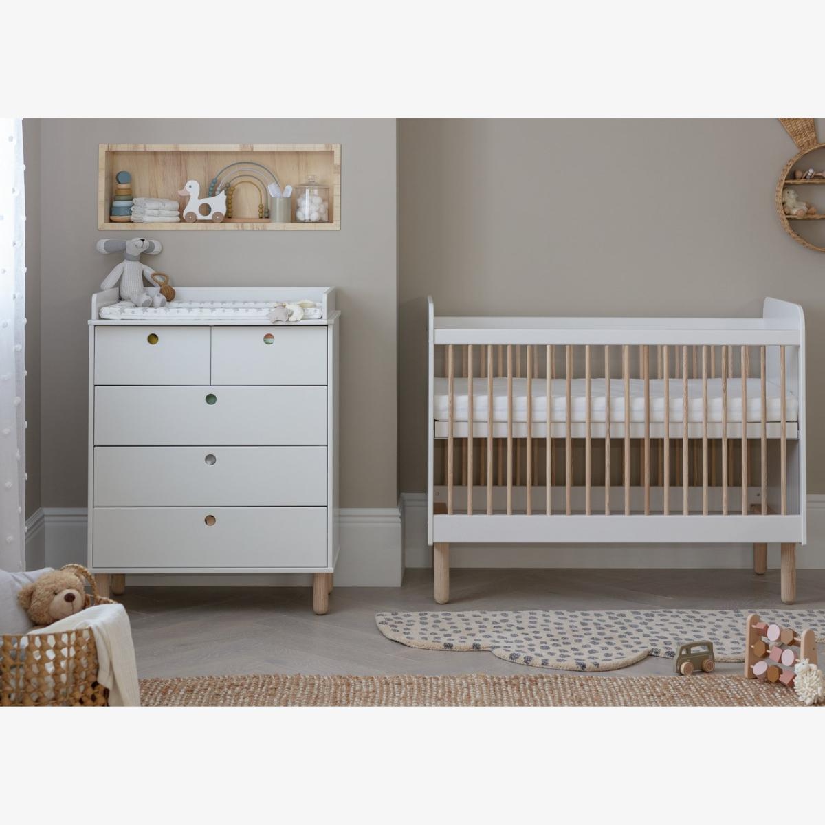 Our Eden nursery furniture set is a must have for new parents. A cot, changing table and storage chest, all designed to be updated in line with your developing child. The changing top lifts off once your baby grows, leaving a fab 5-drawer chest with plenty of storage intact. While the airy cot is suitable from birth and offers adjustable mattress levels. High to keep your newborn in easy reach. Low as baby learns to sit and stand. Smart stuff. Cut out handles make the drawers easy for young fingers to use. Made in solid pine with ash wood detail and finished in fresh white. Part of the Eden collection. Chest of drawers: Size H102.7, W78.8, D49.6cm. Internal drawer size H15.3, W32.5, D33.6cm. Packed flat - requires 1 person (wall fixings included). Bedside table: Packed flat. Bed: Cot bed. Size H98.2, W66.2, L123.2cm. Weight 26.9kg. General information: Made from MDF. If this product is over 60cm high it must be securely attached to the wall to prevent overturning. Additional handles not included. Drawers in this unit have metal runners. We are excited to be welcoming some of our favourite HOME products into the Habitat range. Your product may arrive in Habitat or HOME packaging. Manufacturer's 1 year guarantee.