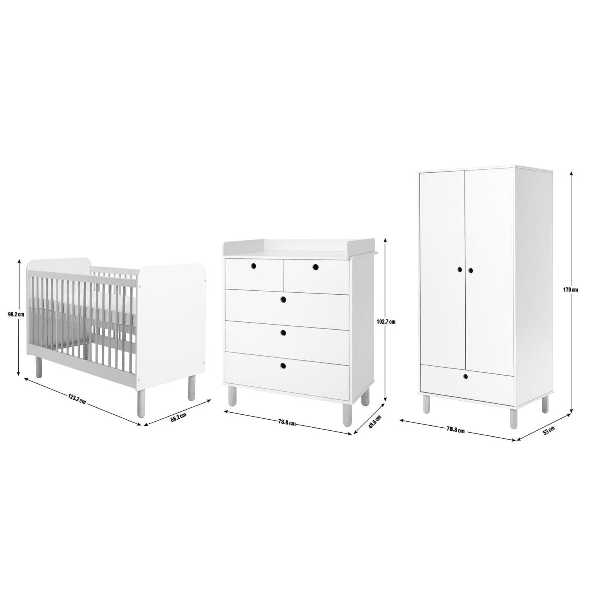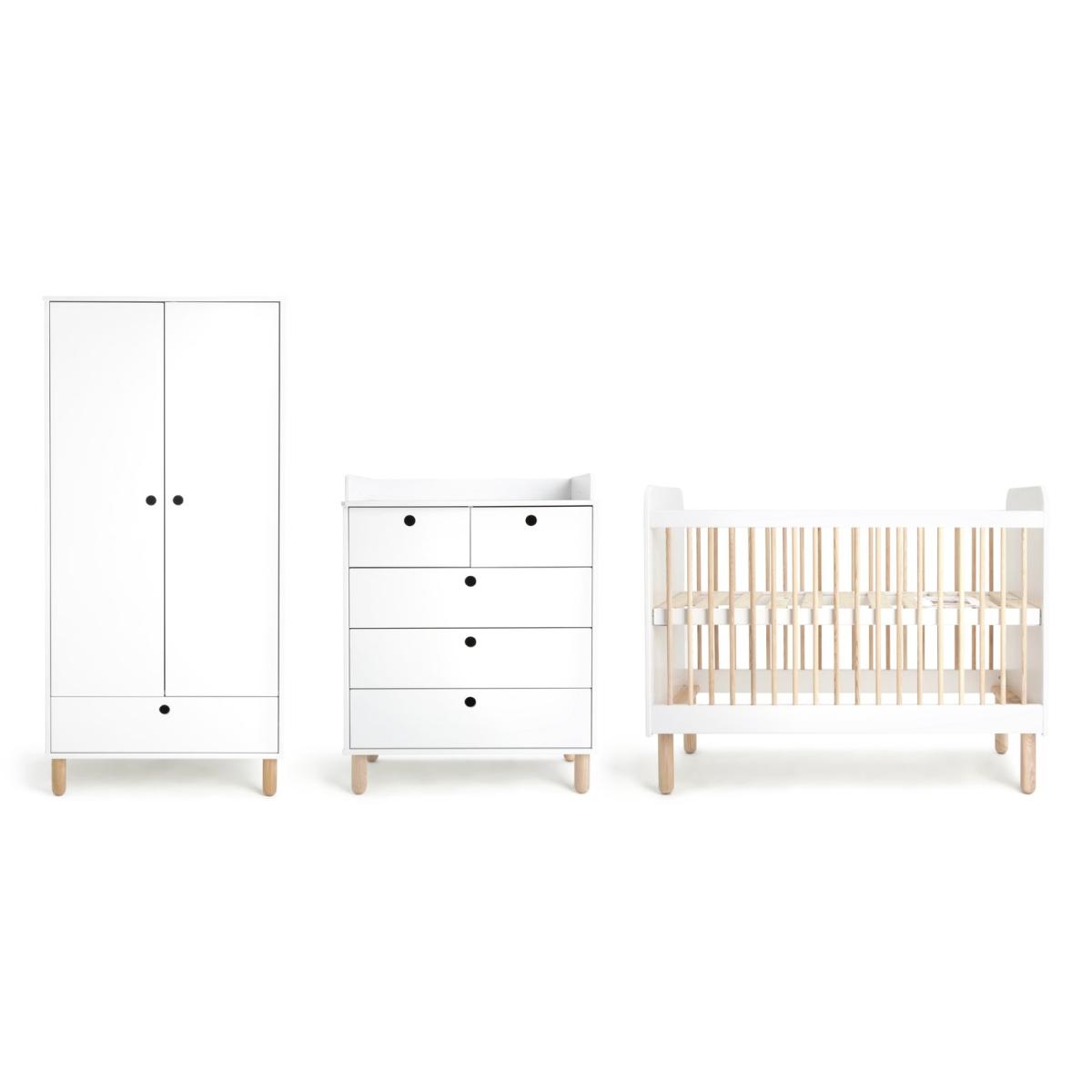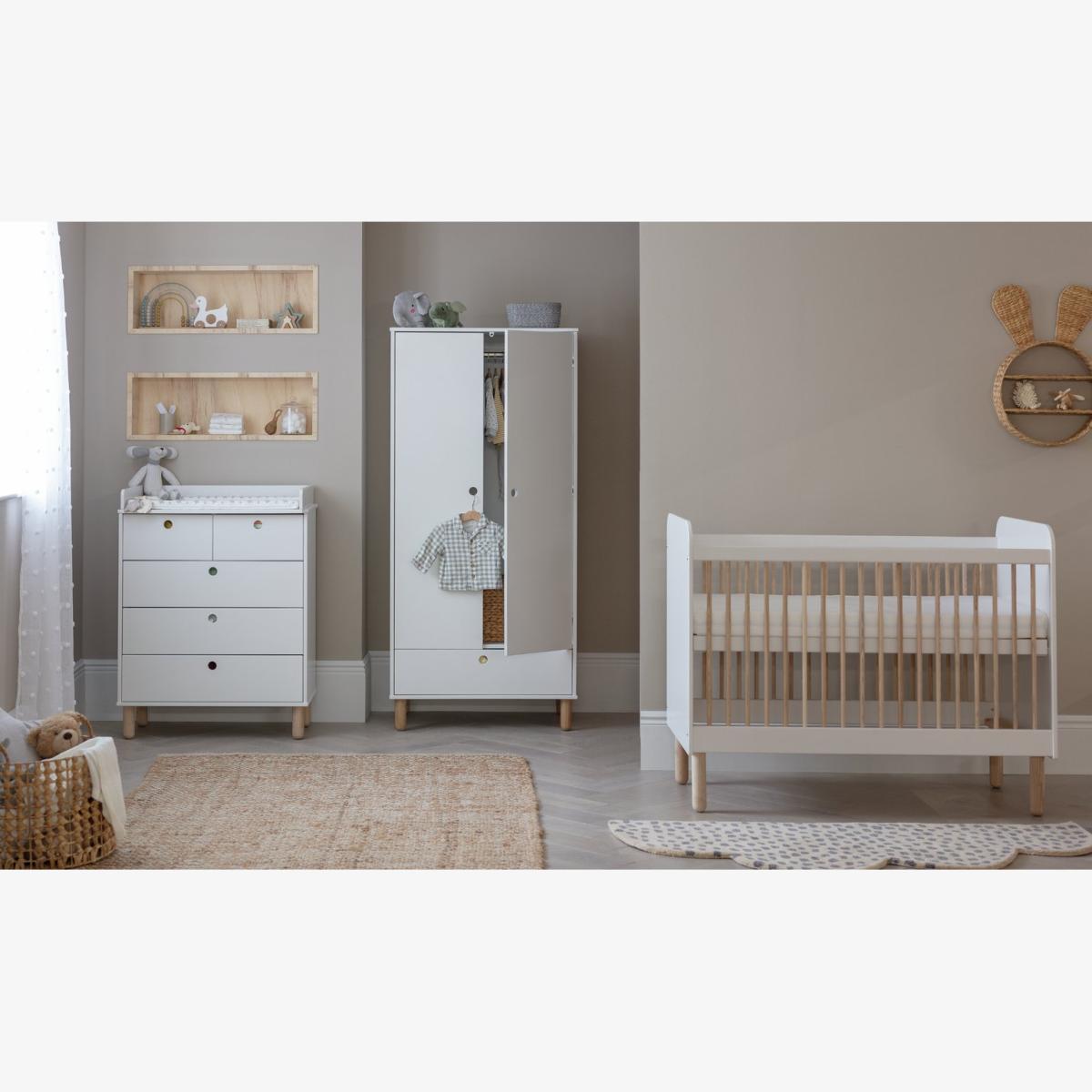 Our Eden nursery furniture set is a must have for new parents. A cot, wardrobe, changing table and storage chest. The changing top lifts off once your baby grows, leaving a fab 5-drawer chest with plenty of storage. While the airy cot is suitable from birth and offers adjustable mattress levels. High to keep your newborn in easy reach. Low as baby learns to sit and stand. A clever set that you can update with the growth of your baby. Cut out handles make the drawers and wardrobe easy for young fingers to use. Made in solid pine with ash wood detail and finished in fresh white. Part of the Eden collection. Wardrobe: Size H170, W78.8, D53cm. Internal hanging space H142.8, W74.1, D51cm. 1 fixed hanging rail. Rail holds up to 15kg. Wardrobe has 2 doors and 1 drawer. Packed flat - requires 2 people (wall fixings included). Weight 56kg. Chest of drawers: Size H102.7, W78.8, D49.6cm. Internal drawer size H15.3, W32.5, D33.6cm. Packed flat - requires 1 person (wall fixings included). Weight 37.9kg. Bed: Cot bed. Size H98.2, W66.2, L123.3cm. Mattress not included. Weight 26.9kg. General information: Made from MDF and pine. If this product is over 60cm high it must be securely attached to the wall to prevent overturning. Additional handles not included. We are excited to be welcoming some of our favourite HOME products into the Habitat range. Your product may arrive in Habitat or HOME packaging. Manufacturer's 1 year guarantee.