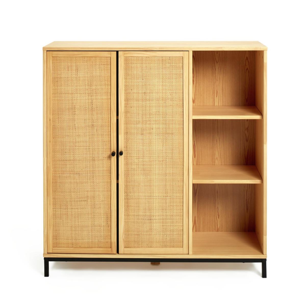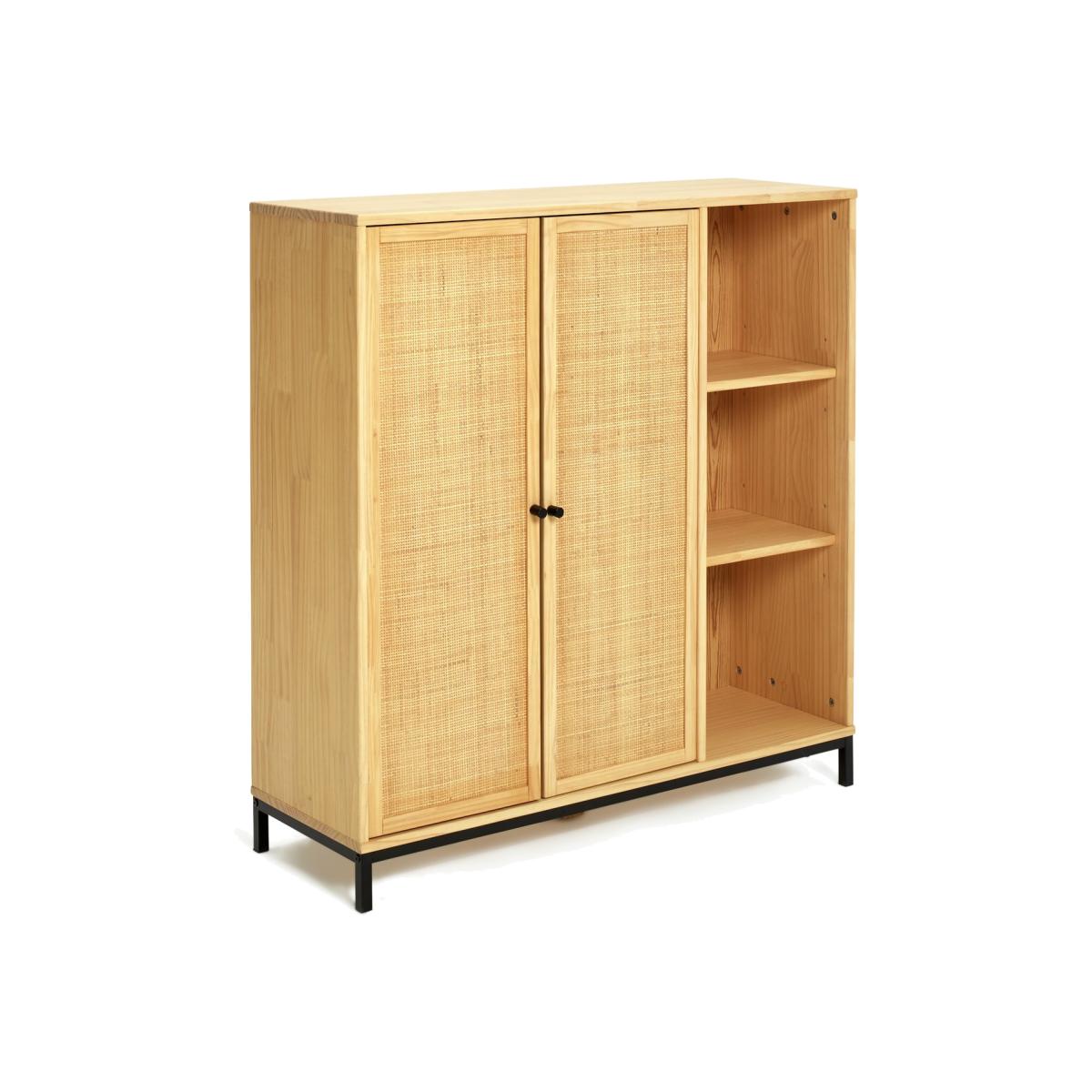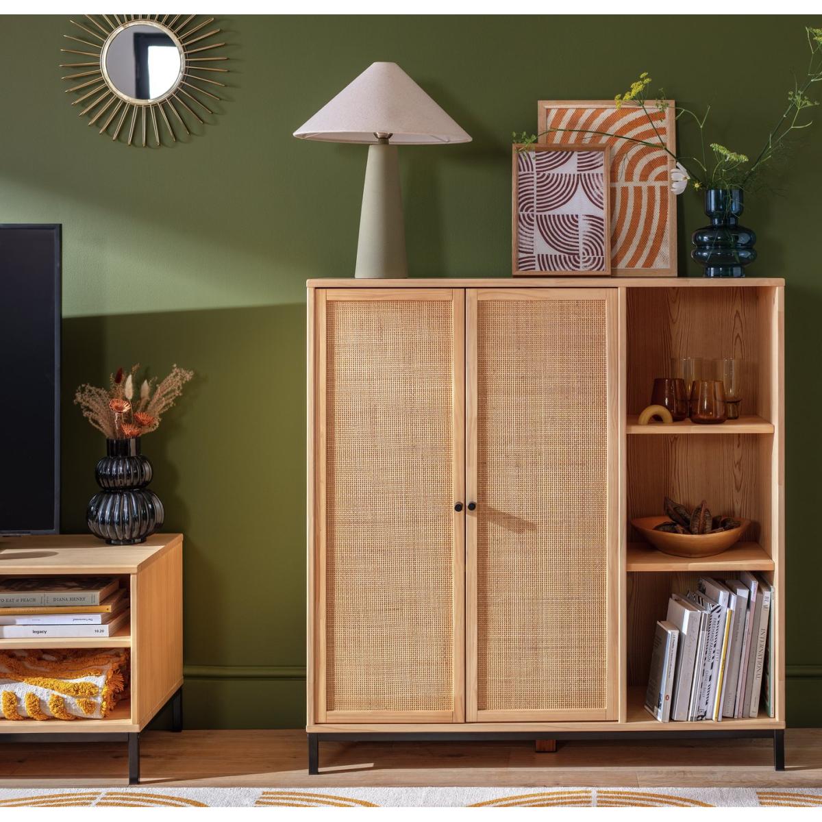 Want an eye-catching bookcase to give you storage and get you compliments? Well, meet Elaina. Industrial design meets boho, resulting in a fantastic and timeless style. This warm oak-coloured living room piece has space for your own curated library. The rattan doors open to reveal 4 adjustable shelves for all your books. The open shelves provide more book space, or an excuse to show off photos, ceramics, or a plant or two.