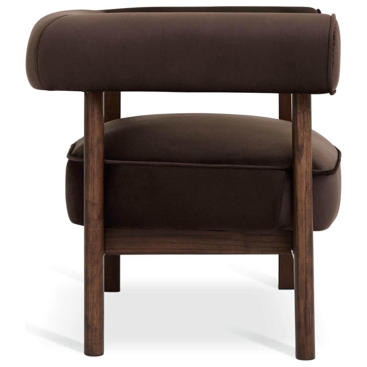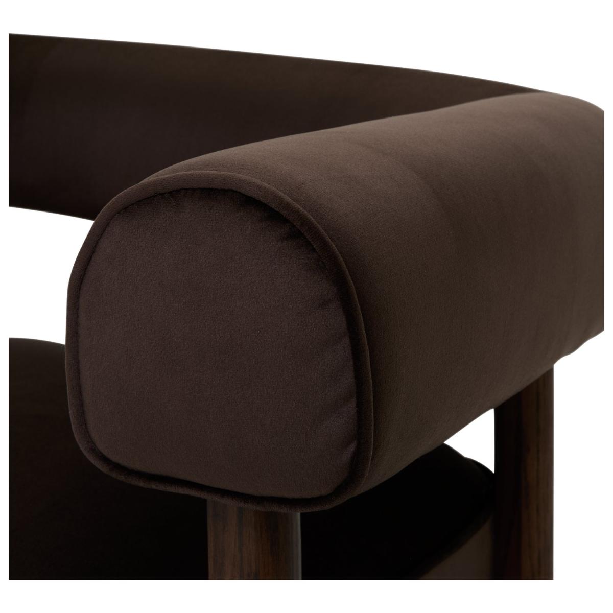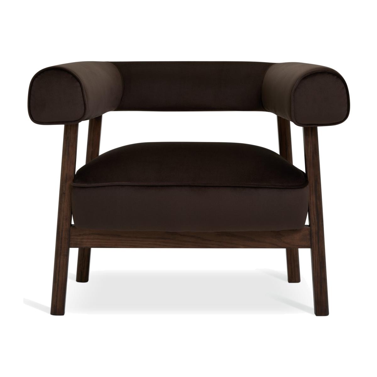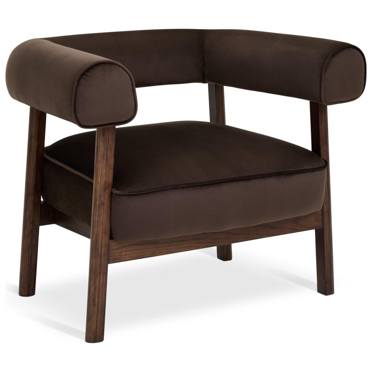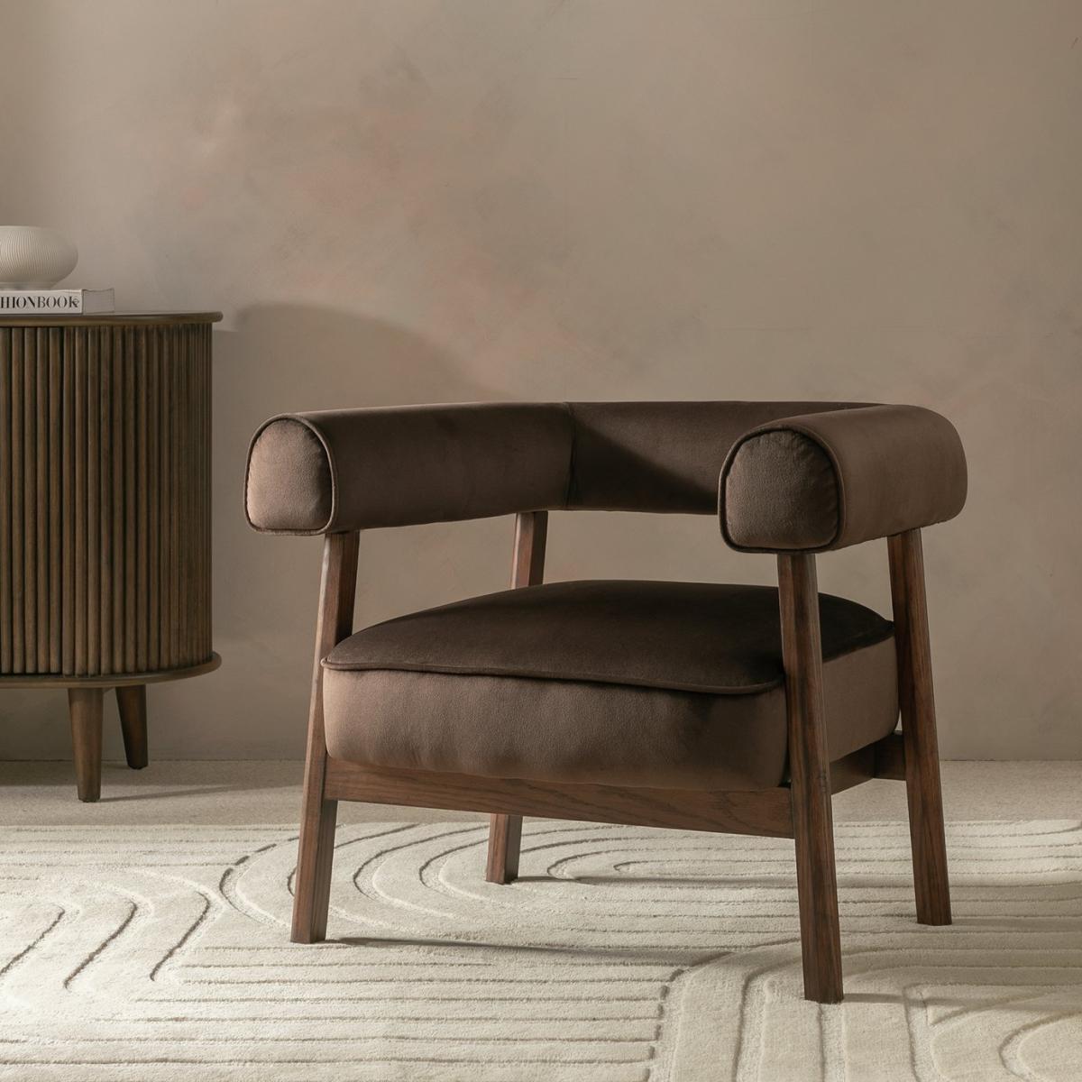 Embrace Elio. A masterclass in modern mid-century design. Wrap around comfort and strong looks are the keynotes of this handsome piece. The softly sweeping elevated cushioned back. The rich tone of the brown velvet fabric against the dark stained solid oak frame. The overall airiness of the design. With its roots in retro Elio also feels freshly contemporary. A chair that's built to please. Whether sitting down and enjoying or standing back and admiring. Part of the Elio collection. Material: Made from 100% polyester. Wooden feet. Fixed seat with foam filling. Fixed cushion(s) with foam filling. Dimensions: Size H67.5, W84, D63cm. Floor to seat height: 44cm. Depth of seat: 53cm. Width of seating area between arms: 66cm. Height of arm rest: 67cm. Weight: 20kg. Packaged dimensions: Package size H43, W85, D43cm. General information: FSC certified meaning the materials used for this product are responsibly sourced. Wipe clean or lightly vacuum. Self-assembly. Maximum individual user weight 130kg. Manufacturer's 2 year guarantee.