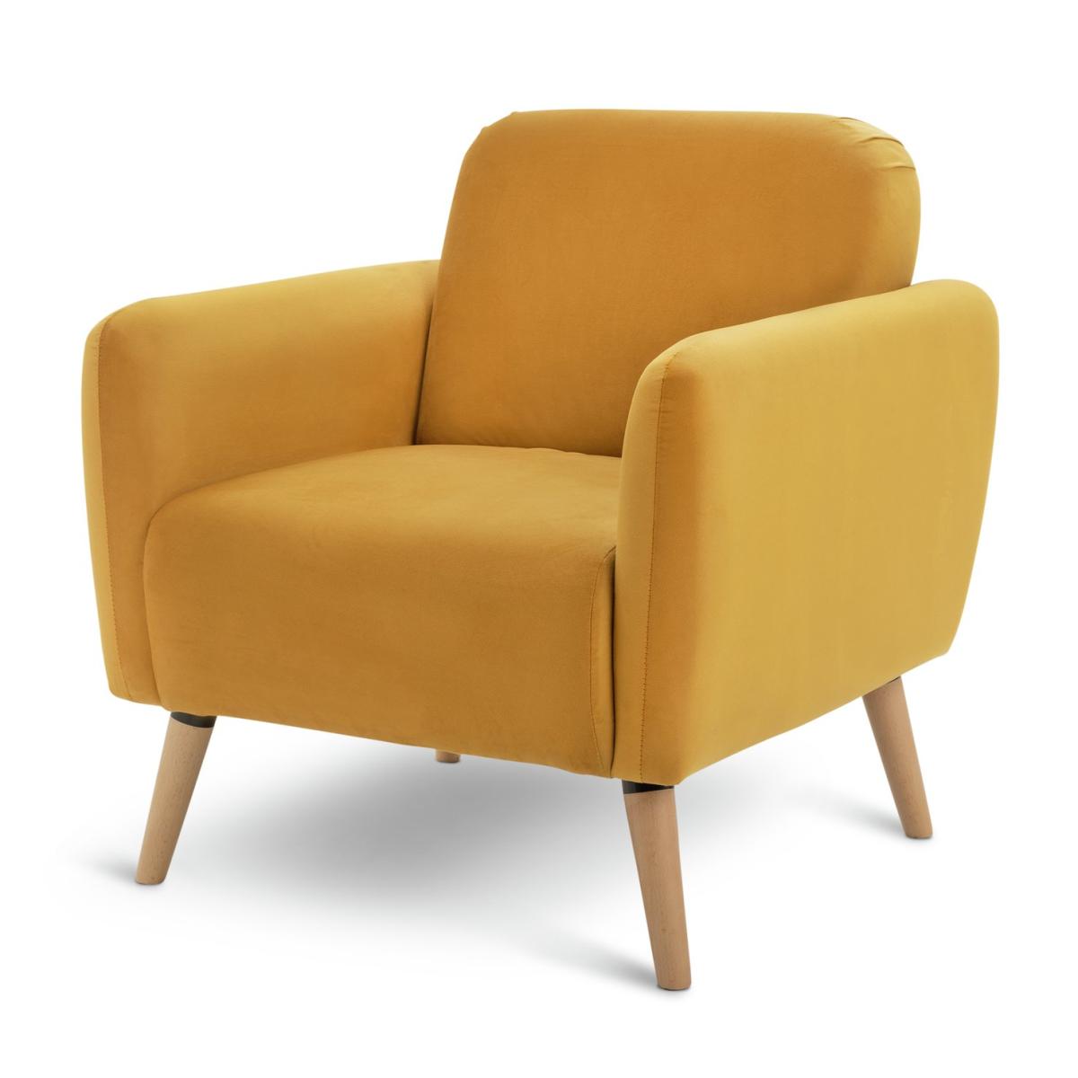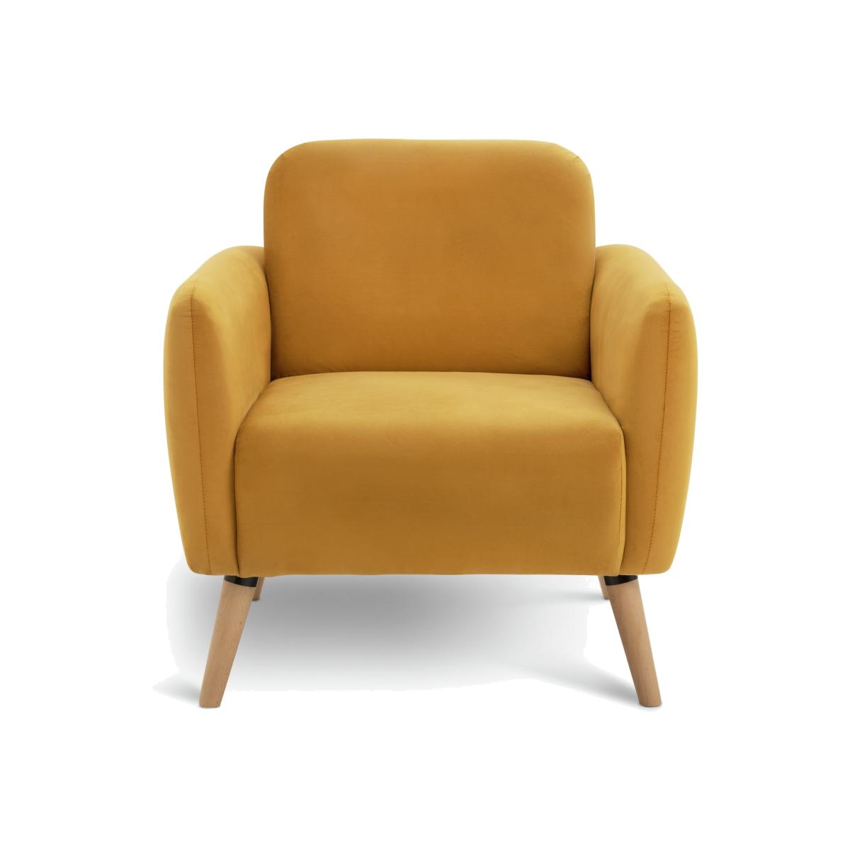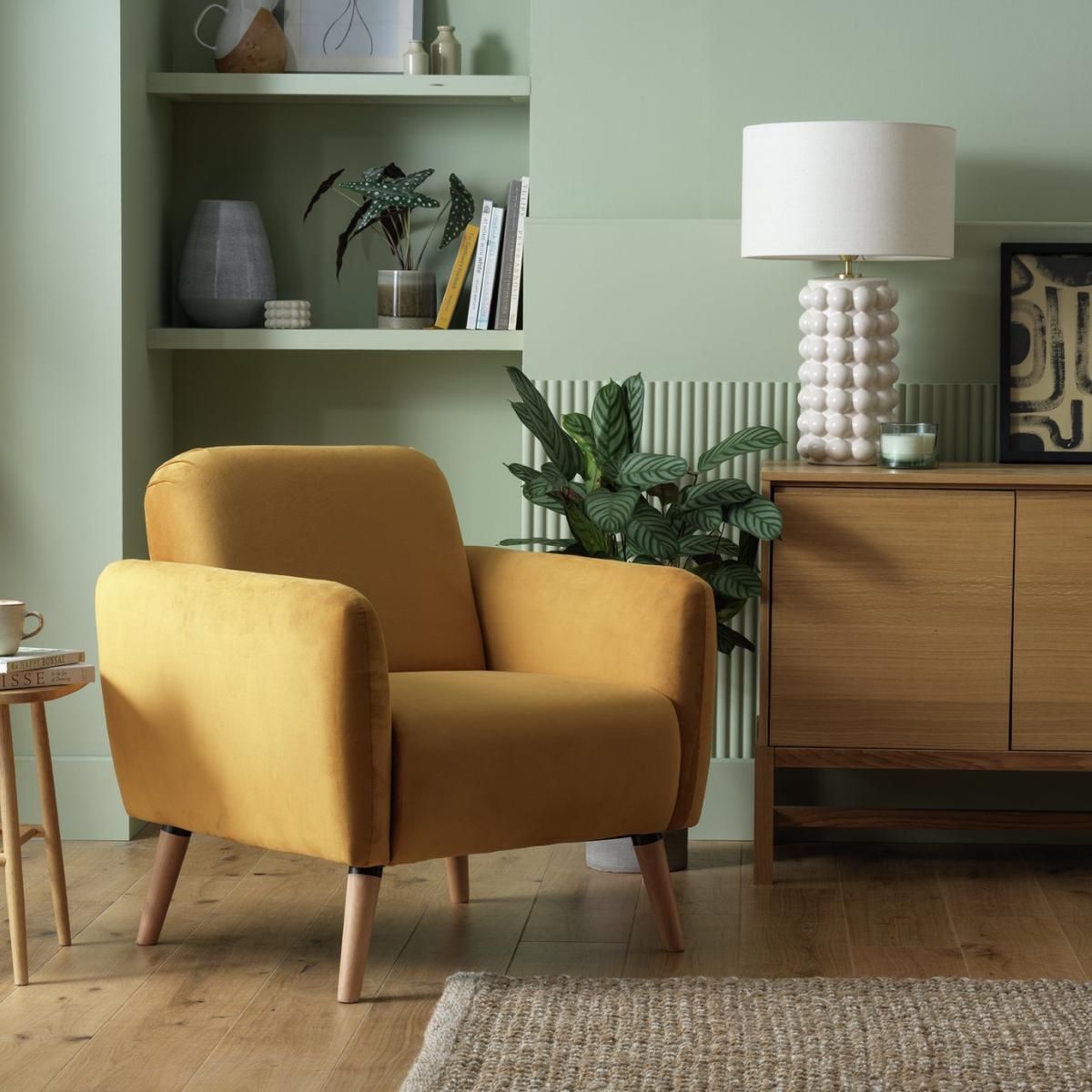 Elsie is the total package when it comes to Scandi-style comfort. A deep cushioned seat, plump padded back and armrests. Splayed wooden legs complete the look. Upholstered in a warm mustard velvet, it adds a pop of contemporary colour to a room. And this chair arrives in one box. So that's easy. Part of the Elsie collection. Material: Made from 100% polyester. Wooden feet. Fixed seat with foam fibre wrap filling. Fixed cushion(s) with foam fibre wrap filling. Free fabric swatch available on this line. Dimensions: Size H80, W76, D72cm. Floor to seat height: 44cm. Depth of seat: 48cm. Height of seat back: 36cm. Width of seating area between arms: 76cm. Weight 44kg. Professional clean only. Plump cushions regularly to maintain shape. Self-assembly. Maximum individual user weight 120kg. Packaged dimensions: Package size H44, W77, D72cm. FSC certified meaning the materials used for this product are responsibly sourced. General information: We are excited to be welcoming some of our favourite HOME products into the Habitat range. Your product may arrive in Habitat or HOME packaging. Manufacturer's 2 year guarantee.
