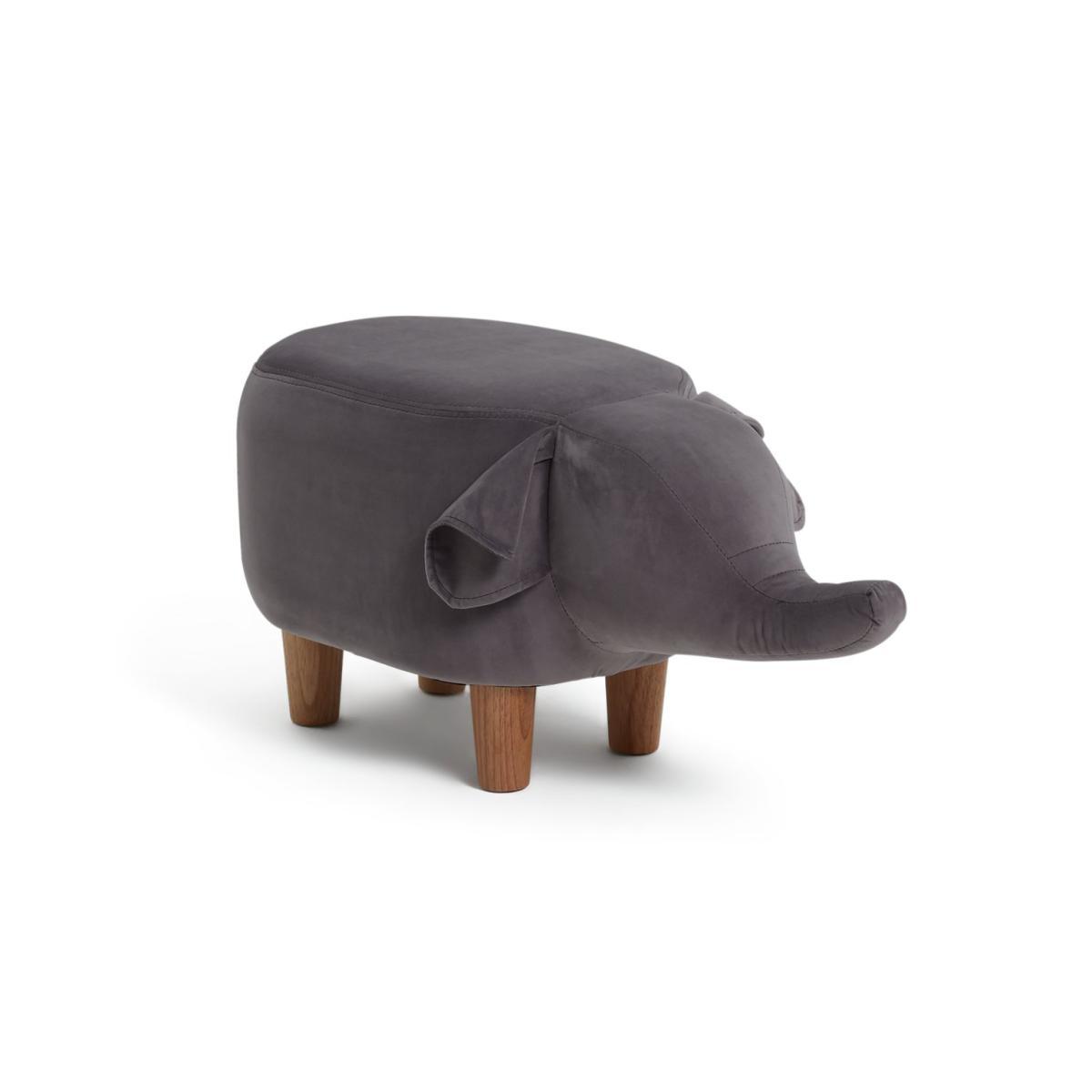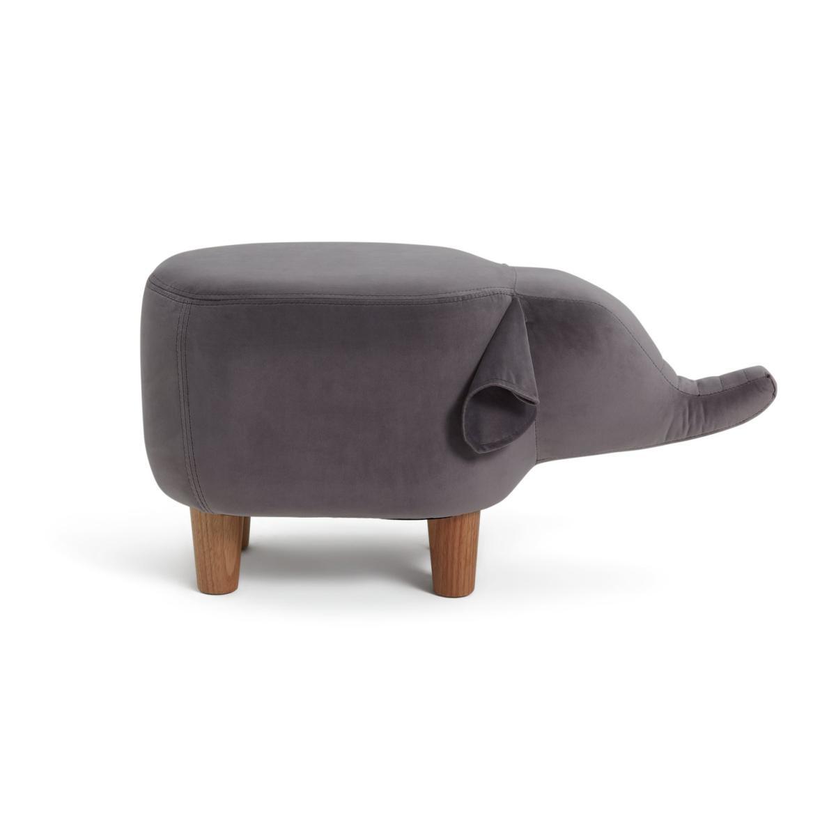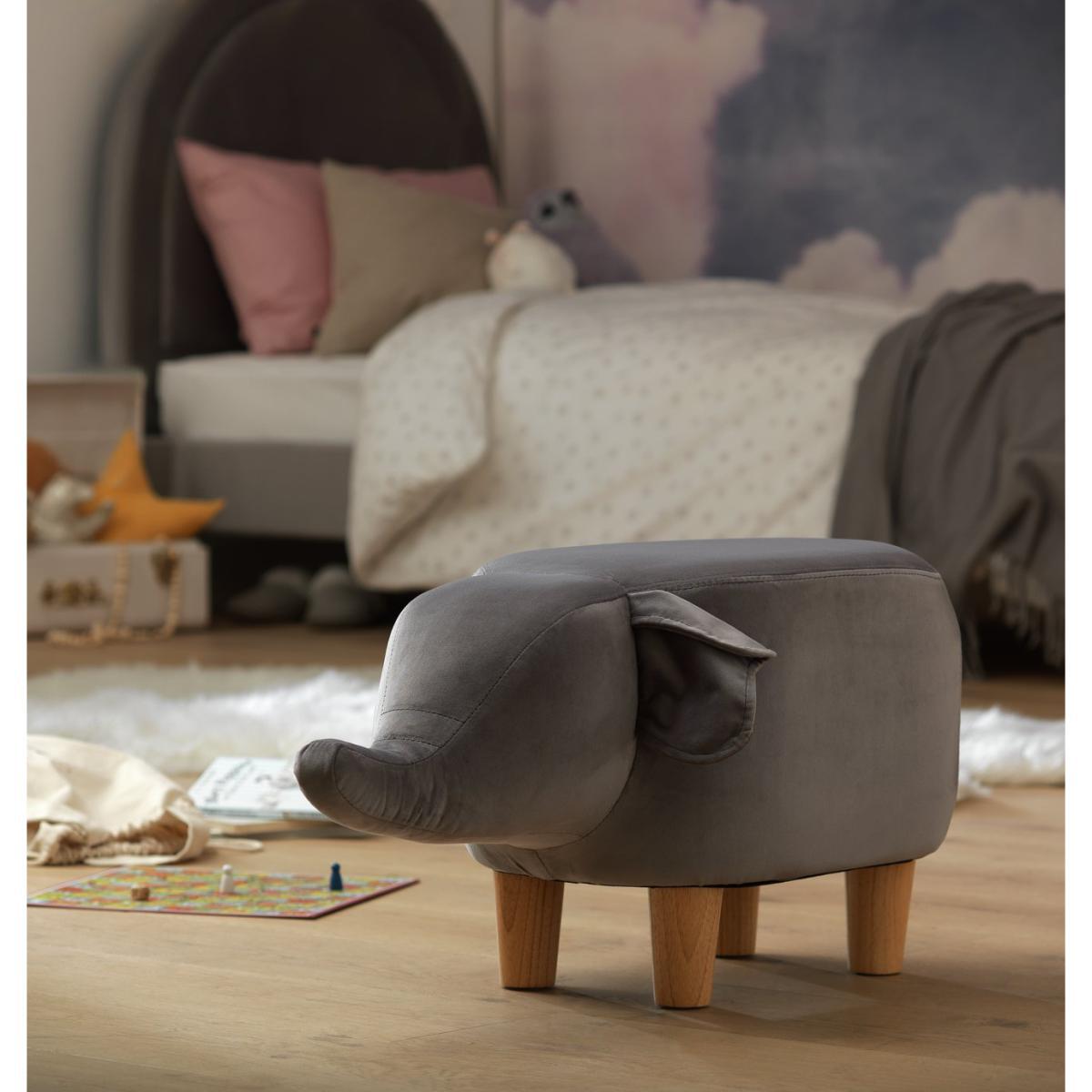 Elton the elephant has come to play! The perfect pal for playtime or for sitting on when it's time for putting on shoes, this fun little elephant stool makes a great accessory for any kid's bedroom or playroom. Soft and cushioned for a cuddly feel, it's covered in sumptuously touchable grey velvet and features chunky wooden legs.