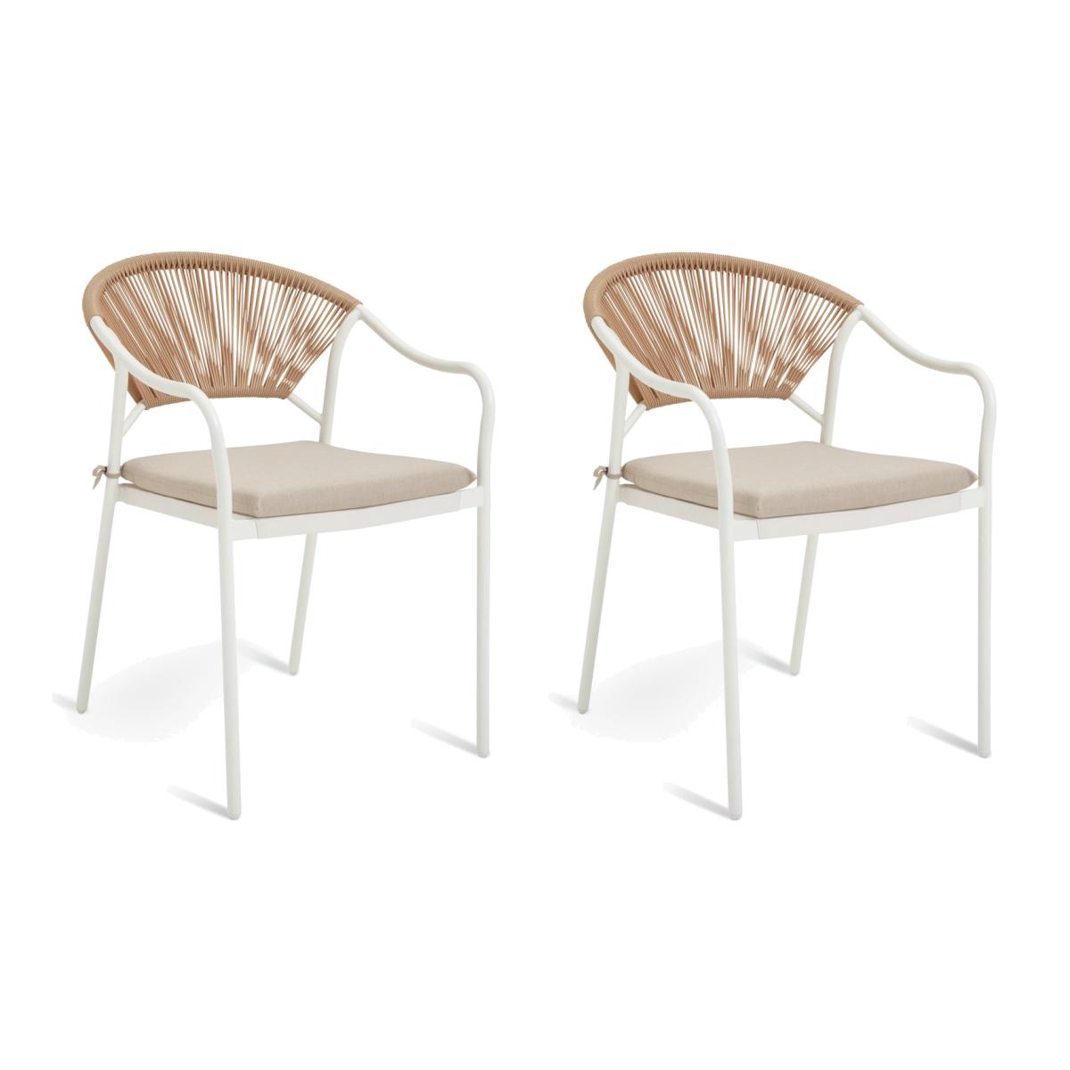 Good things come in pairs. And this pair of patio chairs is really good. Yes they look stylish. Yes they're comfortable. And yes they're practical. The striking rattan style woven back and white coated metal frame can put up with whatever our weather has in store. Even the tie-on seat pad is showerproof. Only one question. Is 2 enough? Our Elvas chairs are neatly stackable. So that's a space saving storage solution. Metal frame. Chair seat and back made from rattan effect. Does not recline to a flat position. Cushions:Polyester cushion cover. Cushions are shower proof, but should be stored inside when not in use. Dimensions:Size H84, W56, D62cm. Weight 3.6kg. Seat height from ground 50.5cm. Arm rest height from ground 67cm. Seating area size W40, D45.5cm. Maximum user weight 110kg. Package Dimensions:Package 1 dimensions: H88, W60, D64cm. Package 1 weight:14.5kg. General information:Supplied assembled. Store inside when not in use. Cover or store inside in winter months to prolong life of product. Cushion not included. Manufacturer's 1 year guarantee.