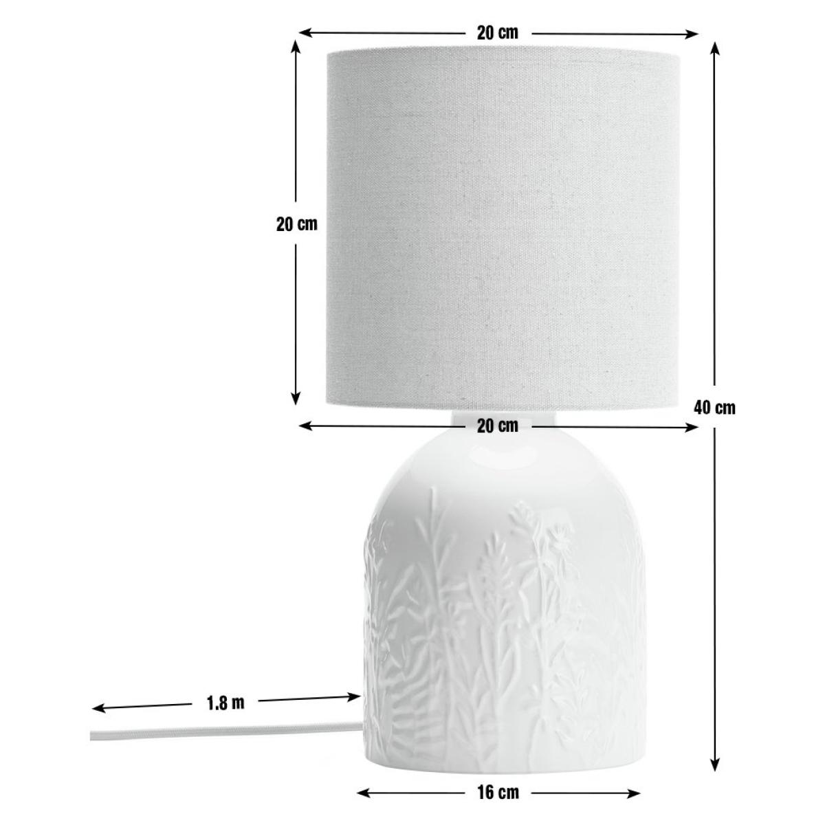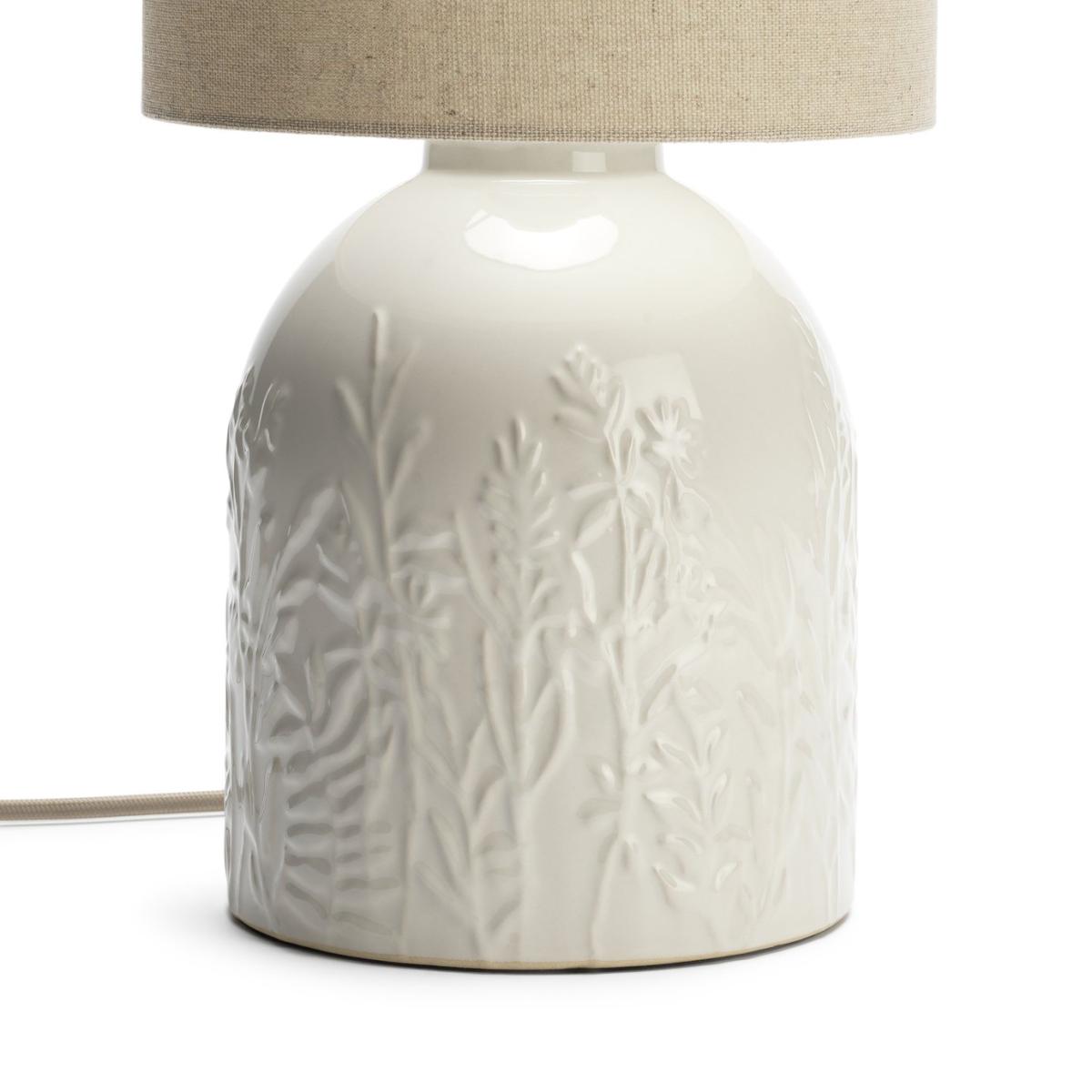 It's spring and time to spruce up your space. How's this light and airy lamp for a wowzer? With an embossed ceramic base of swaying grasses and a natural organic shade, it's a nod to nature. Reset and relax with our fresh home accessories. It's all about using easy finishing touches to fabulous effect. Dimensions: Overall size H40, Diameter 20cm. Shade size H20, D20cm. Diameter of base 16cm. Cord length 1.8m. Bulb Information: Bulbs required 1 x classic E27 edison screw LED bulb(s) (not included). Recommended maximum wattage: 15 watts. (bulb not included). General Information: Shade colour: beige. Base colour: off white. Shade material: linen. Base material: ceramic. In-line switch. IP rating 20 - not suitable for bathroom use. Minimal assembly. Product is mains powered plug in. This lighting product is a class 2 fitting. Manufacturer's 1 year guarantee.