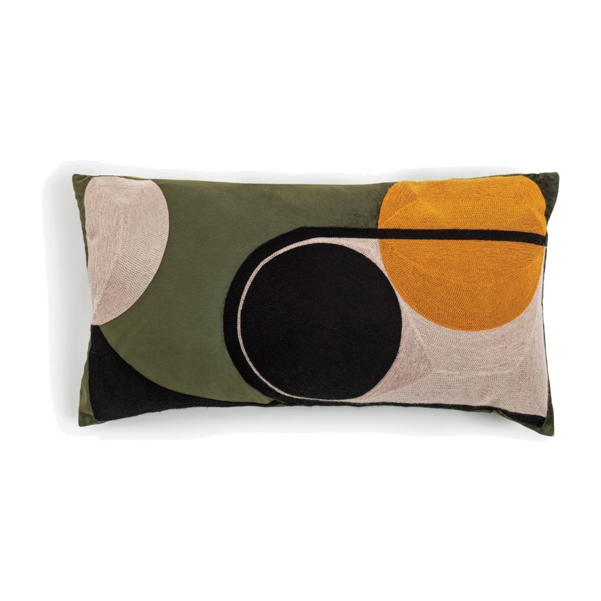 Shape up that sofa. Our geometric, rectangular cushion looks as good as it feels. Crewel embroidered circular patterns in yellow and black sit pretty on an olive green background. Arty, eye-catching and gloriously tactile. Earthy or neutral decor? This contemporary cushion pops with either. That's bold. If you're looking for couch inspo, take a peek at ours. We've got a bunch of luxurious materials and colours to choose from. Fully sewn and stuffed cushion. Zip fastening. Cover 100% polyester. Filling 100% polyester. Size L58, W30cm. This cover is machine washable.
