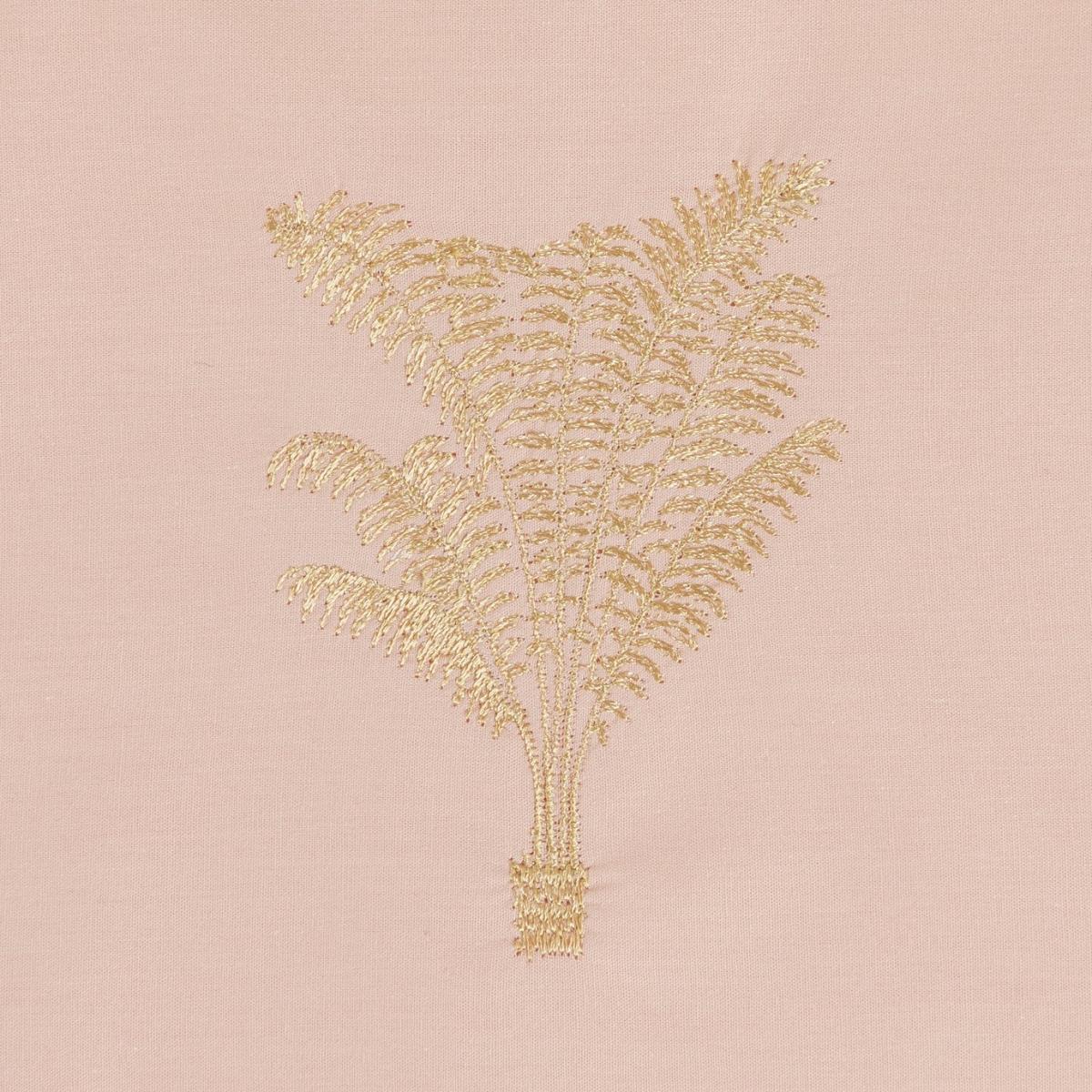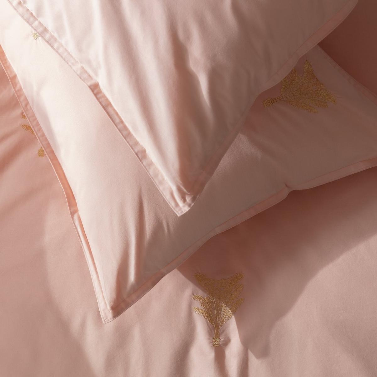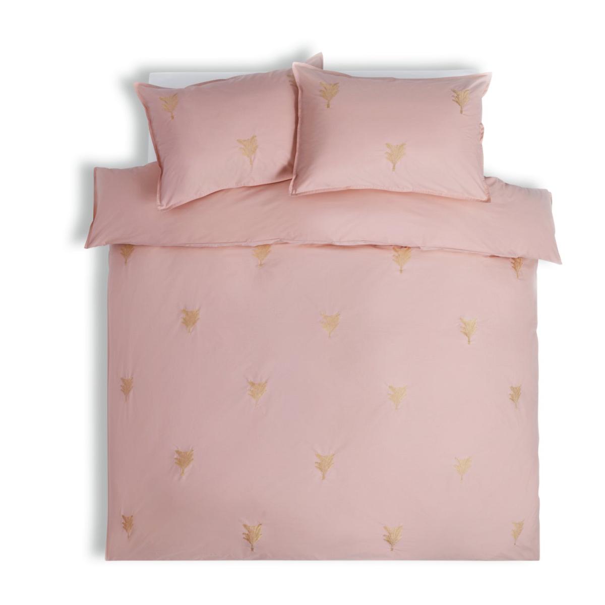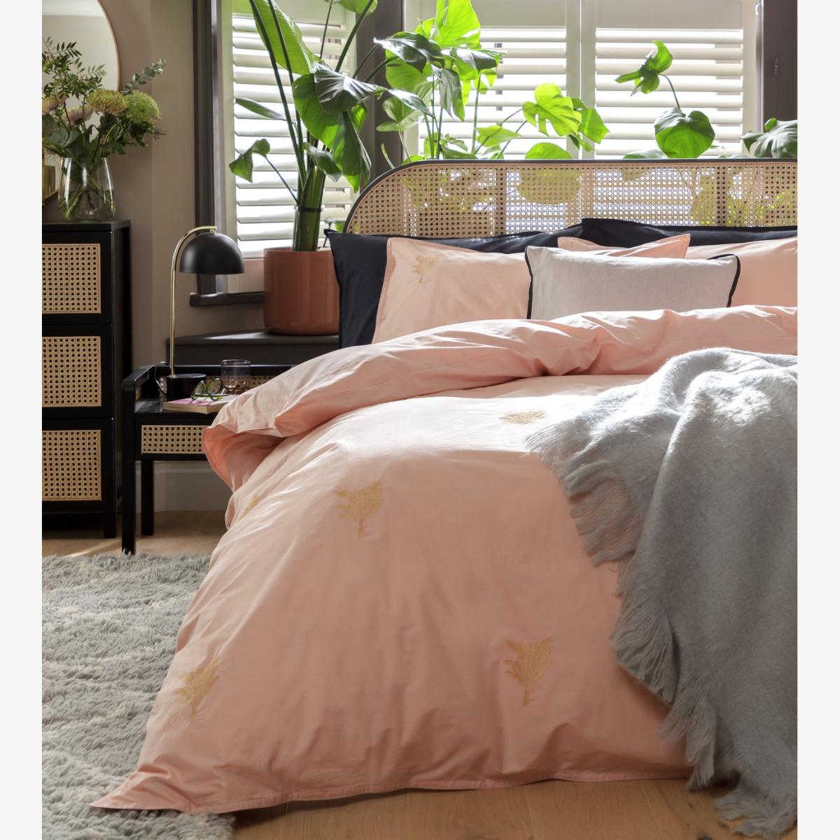 Sweet dreams. Our single bedding set is pretty pastel perfection. In soft pink embellished with embroidered golden palms, it's romantically delicate. Made from polycotton so it's easy to keep looking fresh. Snuggle in. The more the merrier. This set also comes in double and kingsize. Finish: embroidered. 50% cotton , 50% polyester. 180 thread count. Set includes 1 duvet cover and 1 pillowcase. Bed size: single. Buttons for fastening. Machine wash as synthetic at 40 C. Suitable for tumble drying.