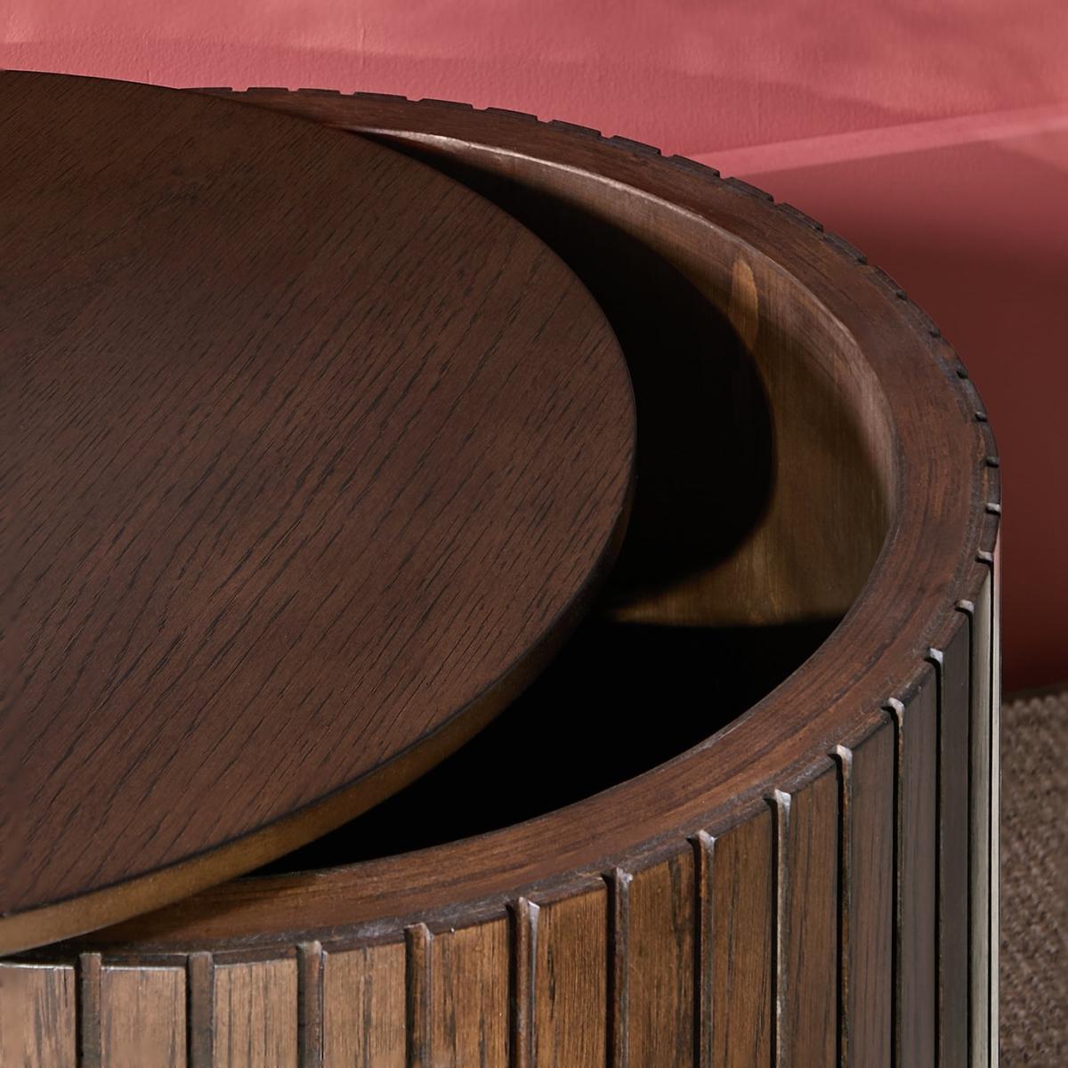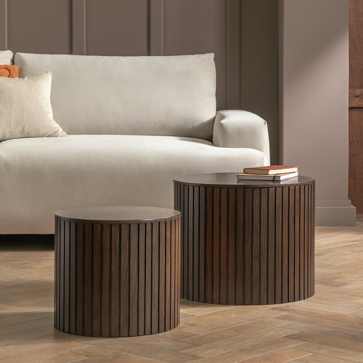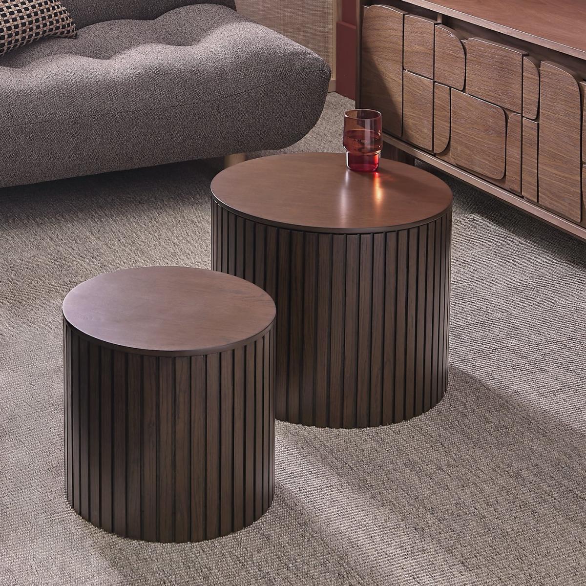 Our pair of coffee tables are doubly desirable. Not only are they an ideal spot for popping down drinks and snacks, under each round top there's loads of hidden storage space. How neat is that? Plus, the slated design and walnut veneer gives a room a contemporary vibe. It's win, win with these two. Part of the Engel collection. Made from MDF with a wood effect finish. Size of largest table H38, W47, D47cm. Size of medium table H32, W36, D36cm. Weight 11.4kg. Fully assembled. Package Dimensions: Package 1 dimensions: H47.5, W55, D55cm. General information: By choosing FSC certified products, you are supporting responsible management of the world's forests. Manufacturer's 2 year guarantee.