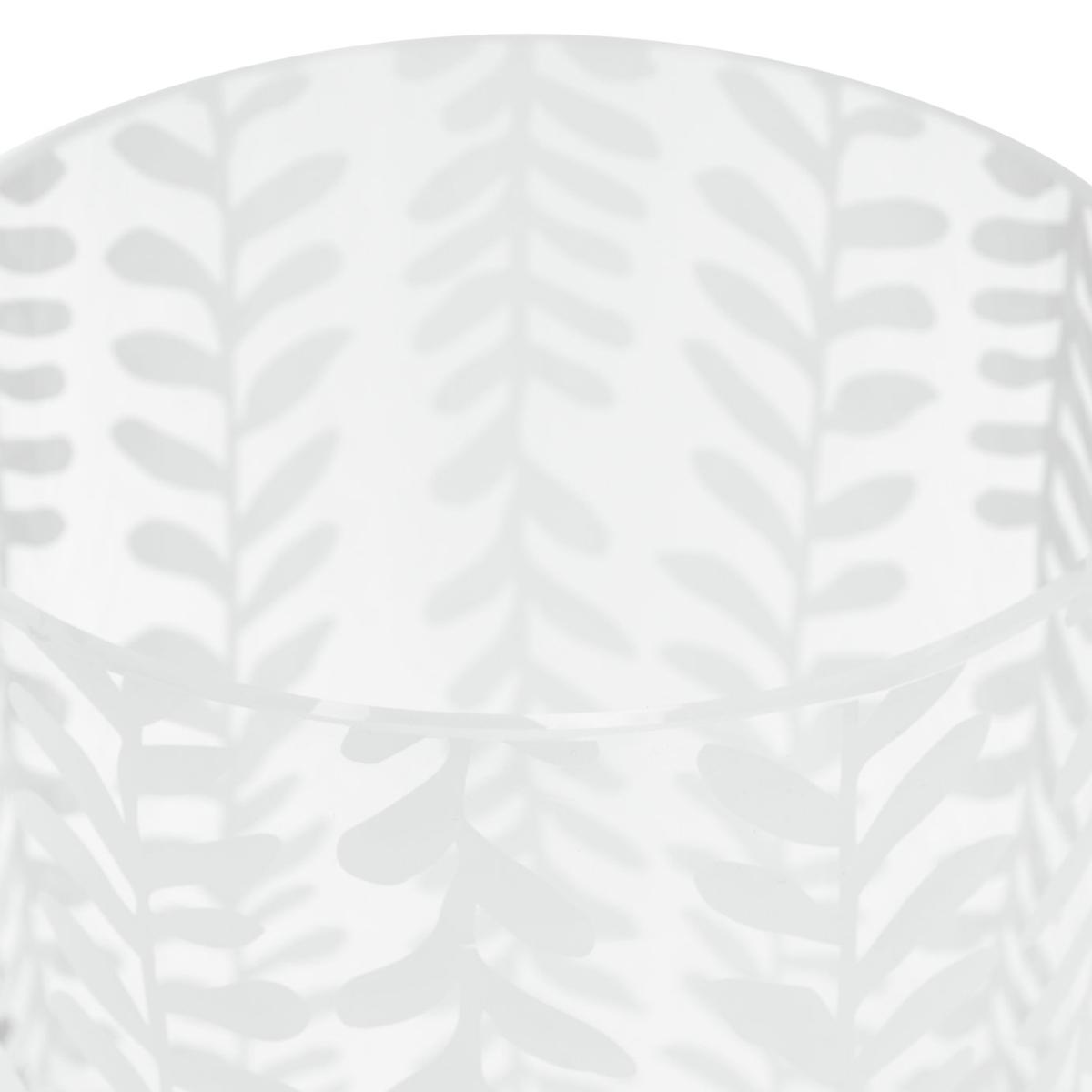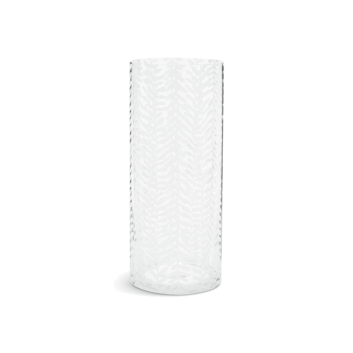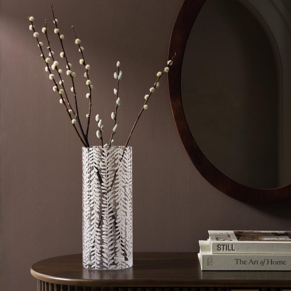 Decorated with leafy stems in a contemporary and modern style, this cylindrical clear glass vase makes a beautiful display piece for any console, sideboard or coffee table. Fill with blooms or faux flowers. A much-appreciated anniversary or wedding gift idea. Size H30, Diameter 12.5cm.
