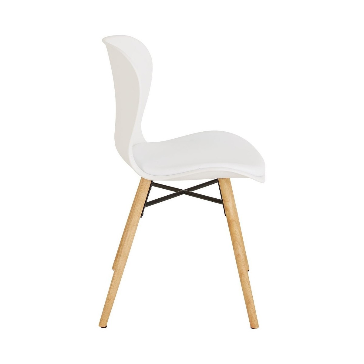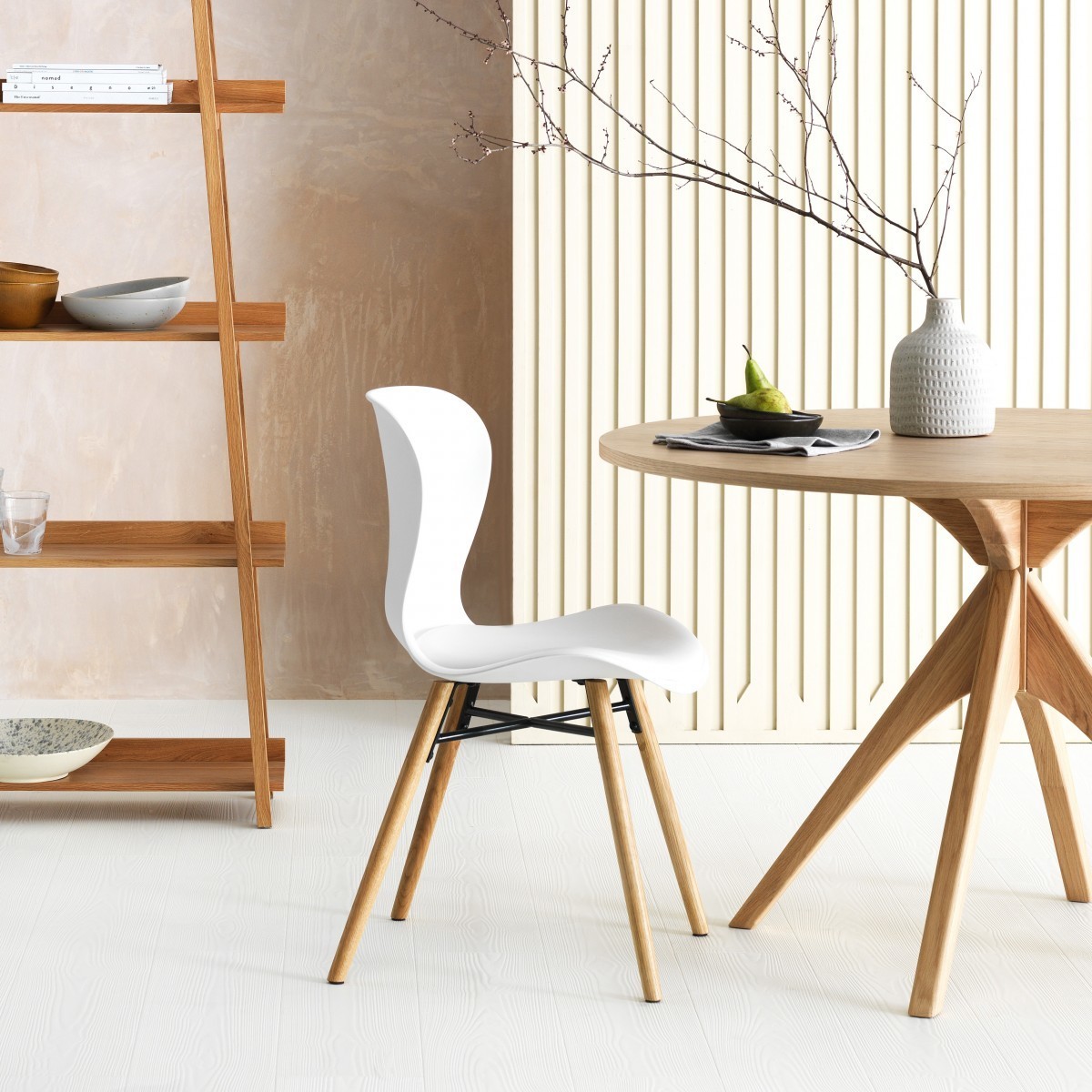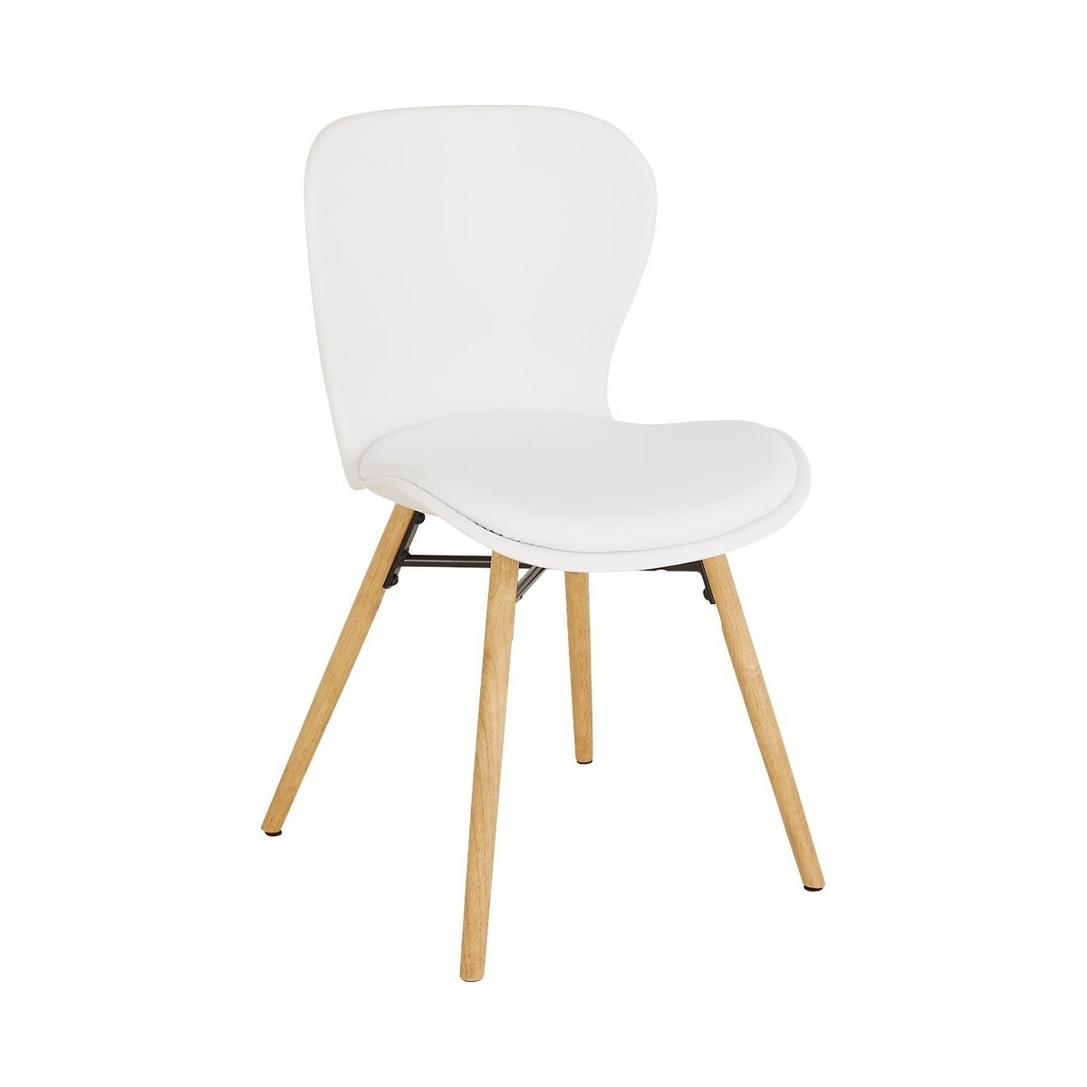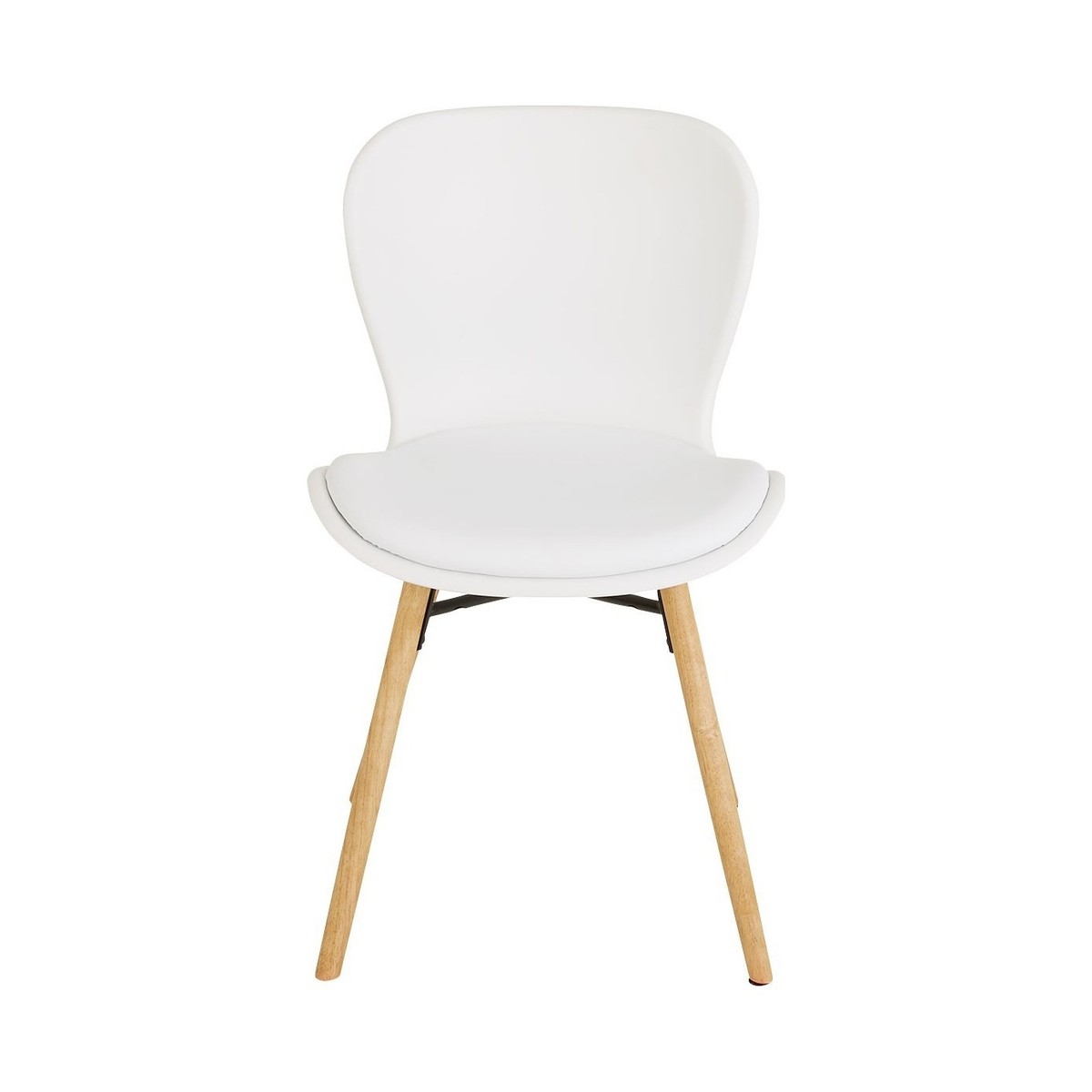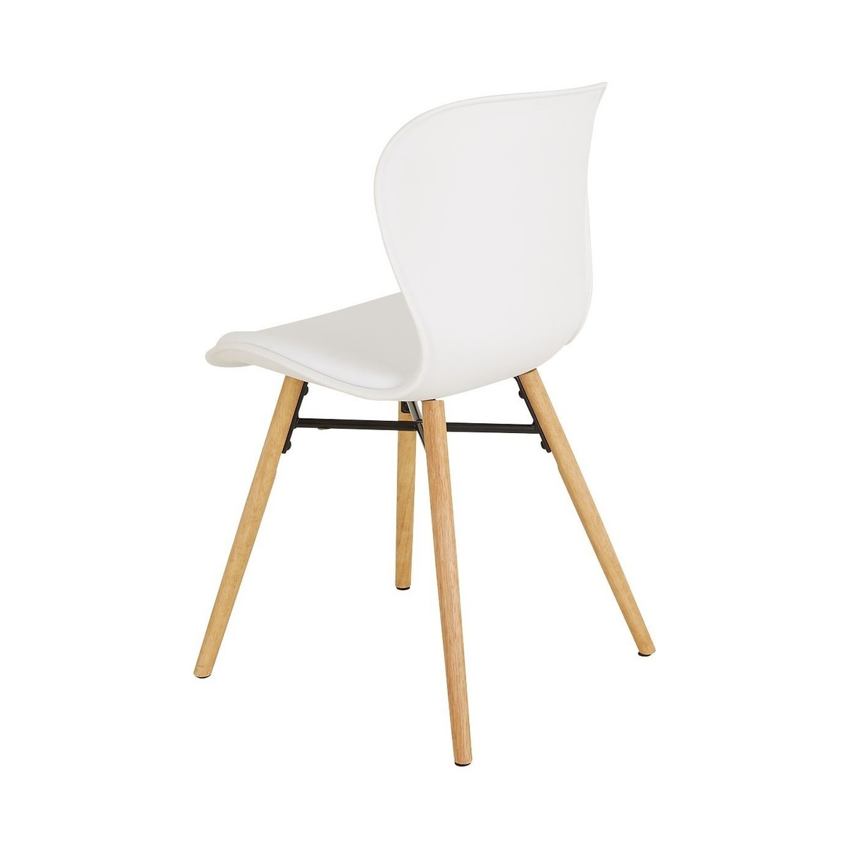 The Etta white plastic and faux leather dining chair with wooden legs has a slightly scooped seat with a curved back and rounded edges for comfort. The dining chair is the perfect complement to the Etta extending dining table. The Etta range includes a sideboard and bench, and the chairs are available in a wide choice of colours, materials and finishes.