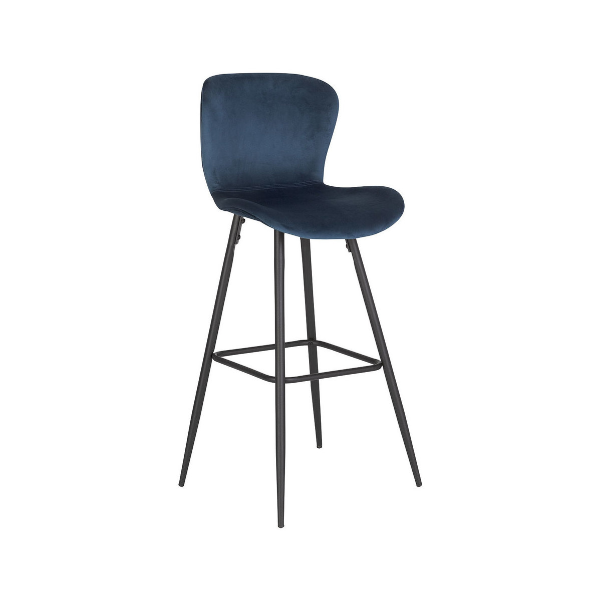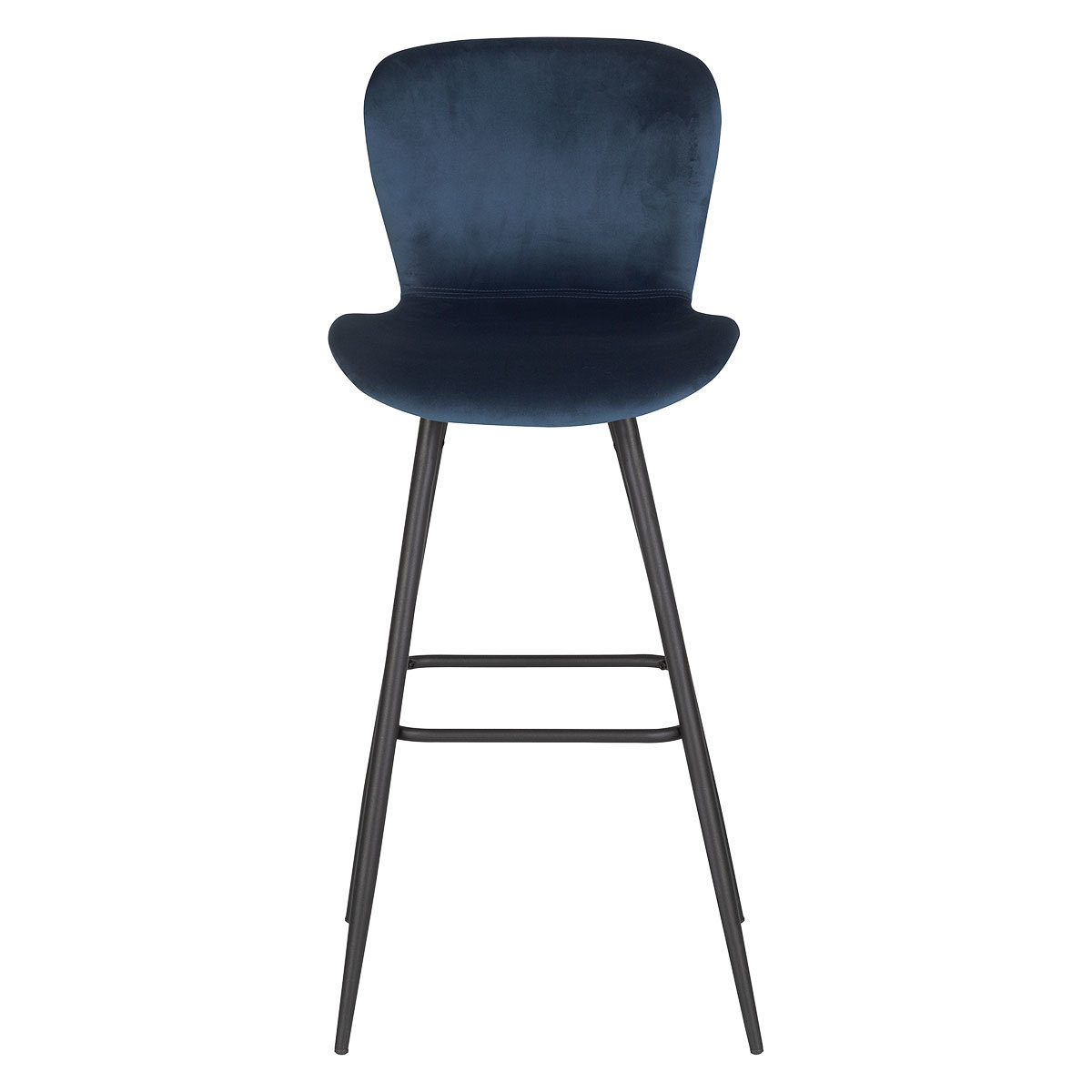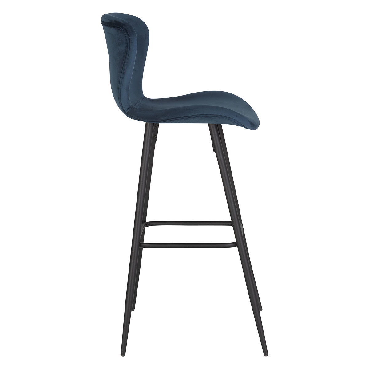 Update your space in style with the Etta blue velvet bar stool with metal legs. Upholstered in durable, soft to touch velvet with a slightly scooped seat and curved back, this bar stool has been designed with comfort in mind. Perfect for a dining room or kitchen island, its finished with elegant black metal legs and a cross bar to rest your feet on. Part of the Etta range, the bar stool also comes in a brown PU leather finish.