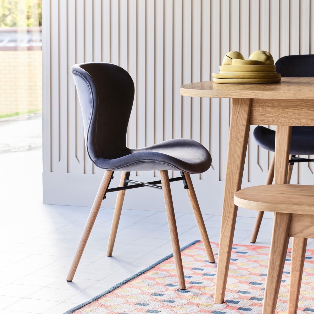 The Etta grey velvet upholstered dining chair with wooden legs has a slightly scooped seat with a curved back and rounded edges for comfort. The dining chair is the perfect complement to the Etta extending dining table and other oak designs in our collection. The Etta range includes a sideboard and bench, and the chairs are available in a wide choice of colours, materials and finishes. Part of the Etta collection. Chair: 2 chairs supplied. Size H82.5, W48, D56cm. Velvet frame with rubberwood legs. Velvet seat pad. Self-assembly - 1 person recommended. Individual chair weight 4.45kg. Wipe clean with a soft cloth. Package Dimensions: Chair package size: H49, W58, D52cm. General information:Manufacturer's 1 year guarantee.