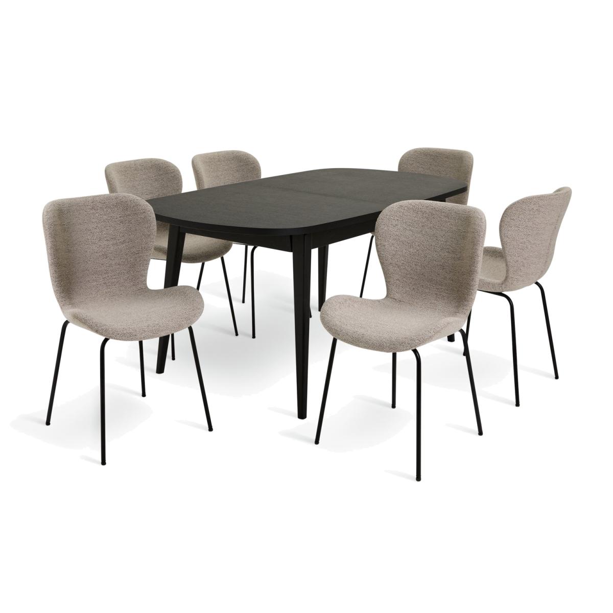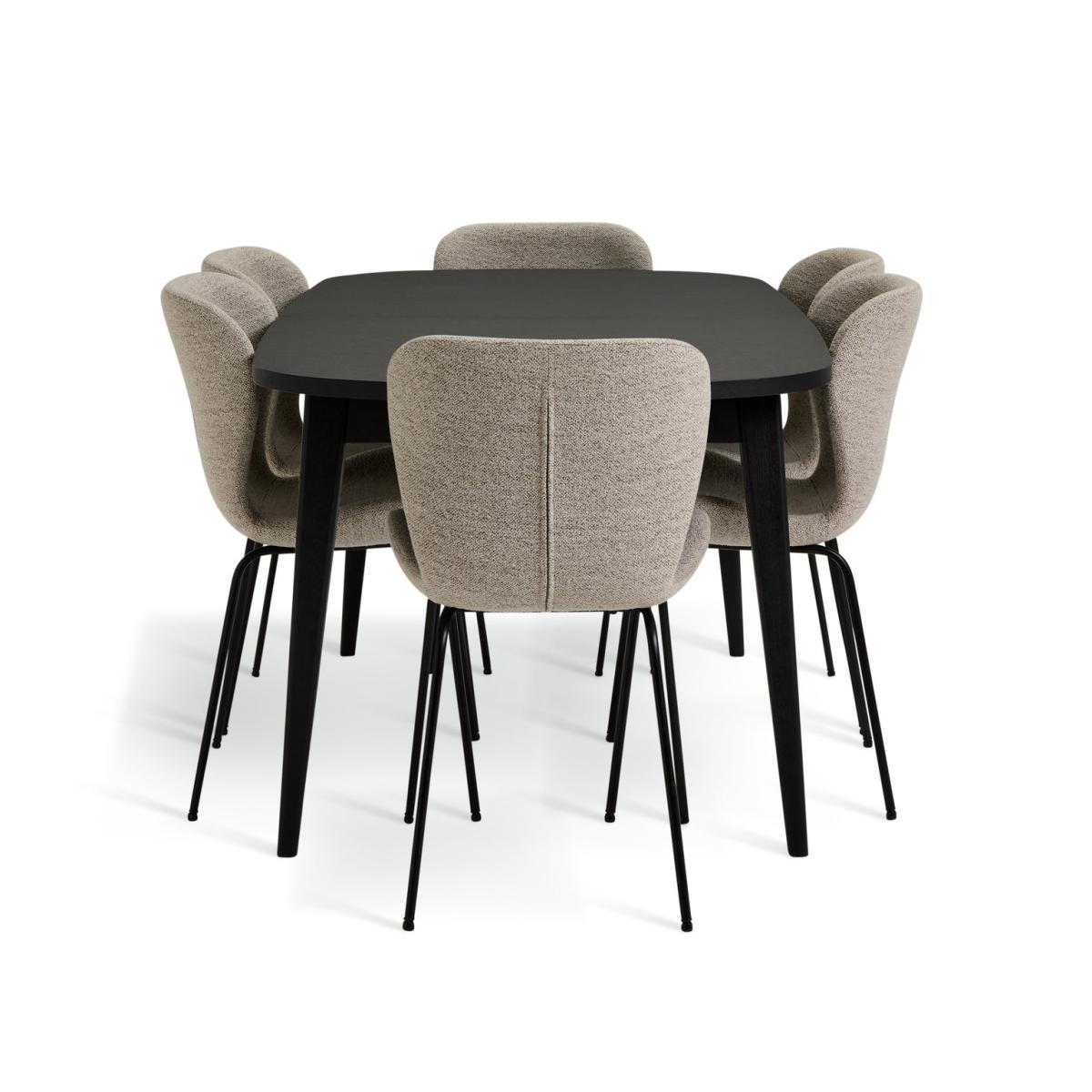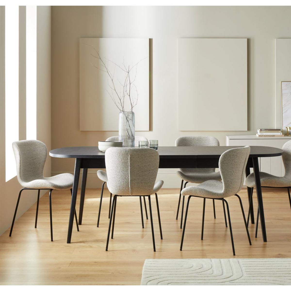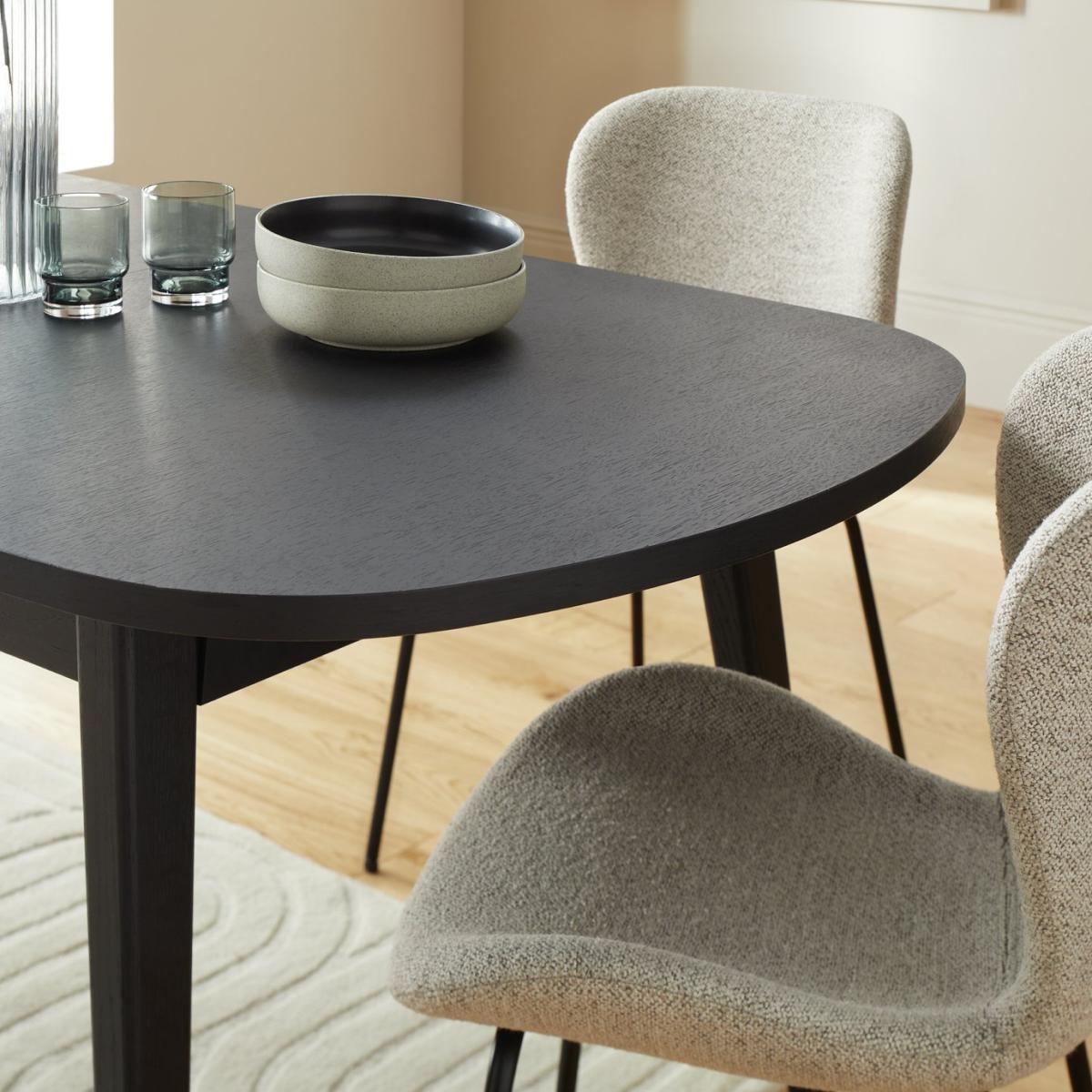 A sophisticated looking dining set that can handle a crowd. Our extendable dining table has a smart black veneer top that shows off the natural wood grain, supported by smartly splayed legs. Equally impressive are the 6 Etta chairs that come with it. In woven fabric with black metal legs the gently scooped seats, curved backs and rounded edges are designed for comfort. This winning combo is wine and dine ready. This dining table comes in a 160cm length and can easily be extended easily to 215cm using the hidden centre leaf. Part of the Etta collection. Table: Table size H75, W90, L160cm. Size of table extended L215cm. Integral table extension. Removable table extension piece. Centre leaf extension type. Real wood veneer table with solid wood legs. Wood veneer table top finish. Self-assembly - 2 people recommended. Chair: Includes 6 chairs. Size of each chair H82.5, W48, D55cm. Seat height 46.5cm. Metal frame with metal legs. Fabric seat pad. Self-assembly. Maximum user weight per chair 110kg. Individual chair weight 10.6kg. Package Dimensions: Table package 1 size H12, W171, D97cm. Individual chair package size H52, W67, D49cm. General information: Manufacturer's 1 year guarantee. Wipe clean or lightly vacuum. FSC certified meaning the materials used for this product are responsibly sourced.