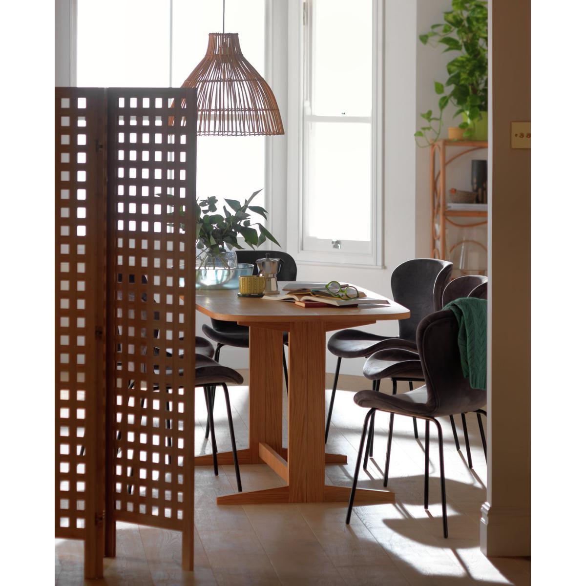 I really like this table for its clean, timeless look and practicality. The solid wood ensures durability, making it perfect for everyday family meals or hosting friends. Its extendable feature offers flexibility for larger gatherings without compromising on space when not in use. The minimal design pairs well with a variety of interior styles-from Scandi and modern to rustic or even more eclectic schemes. For styling tips, consider pairing it with simple, understated chairs or mixing in textured fabrics for visual interest. Navy chairs add a subtle colour pop that works well in both classic and contemporary interiors, especially when paired with neutral or pastel palettes. This set provides both function and style, making it a versatile choice for any dining room.
