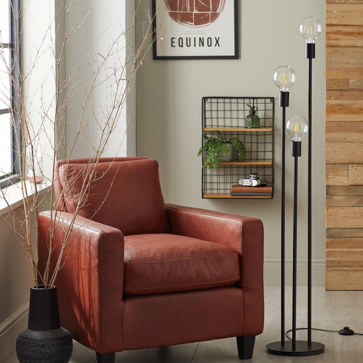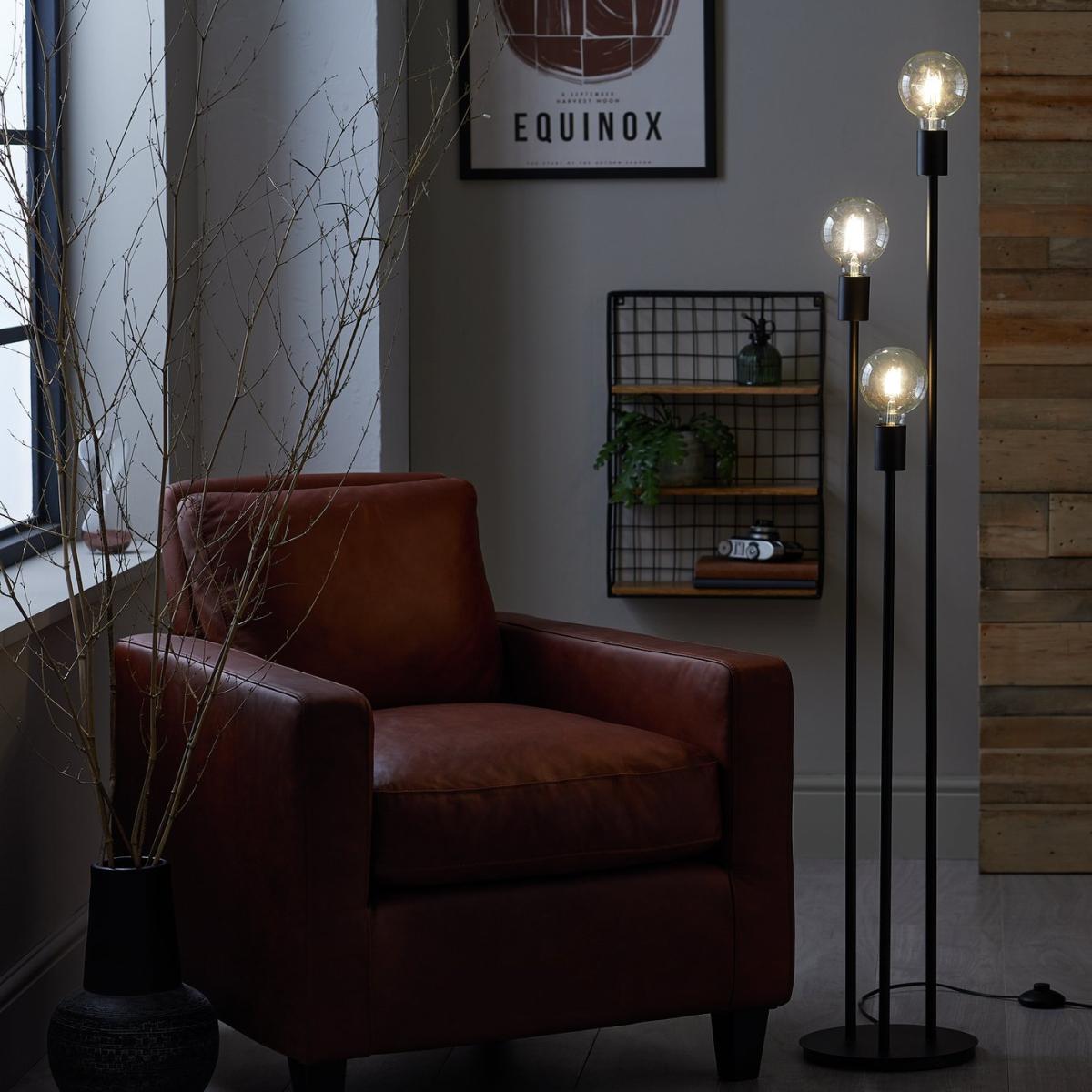 Well lit. That's the result of placing our 3-light floor lamp strategically in your room. With its Edison light bulbs and triple base stem, it's an industrial style softened beautifully by light. Perfect to illuminate the space close to a reading chair or sofa. Simply toe-tap the inline floor switch to turn on and off. Dimensions: Size H139, Diameter 25cm. Diameter of base 25cm. Cord length 1.8m. Bulb Information: Bulb required 3 x globe E27 edison screw LED (included). 6 watts. General Information: Foot switch. IP 20 - not suitable for bathroom use. Self-assembly. This lighting product is a class 2 fitting. Weight 5kg. Manufacturer's 1 year guarantee.