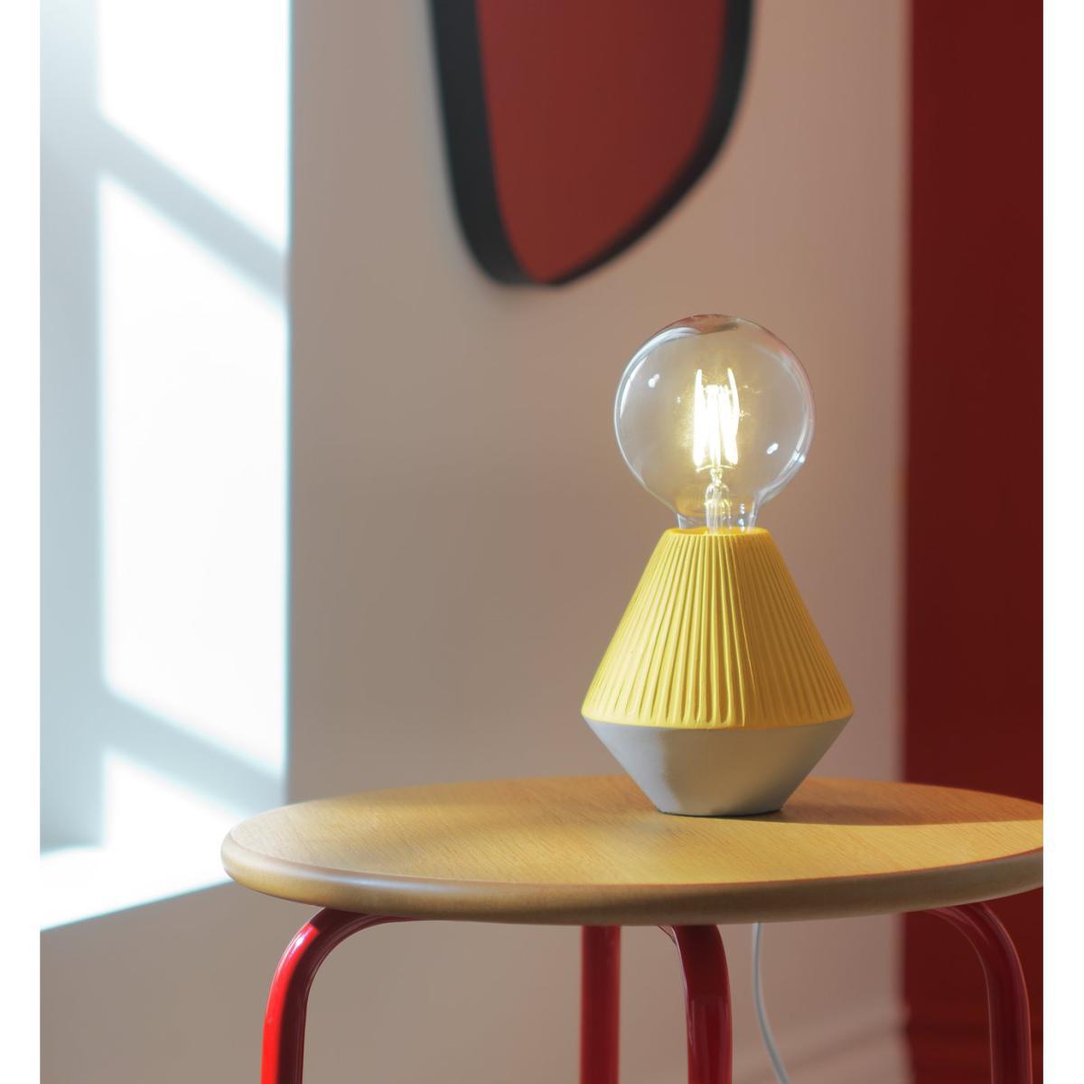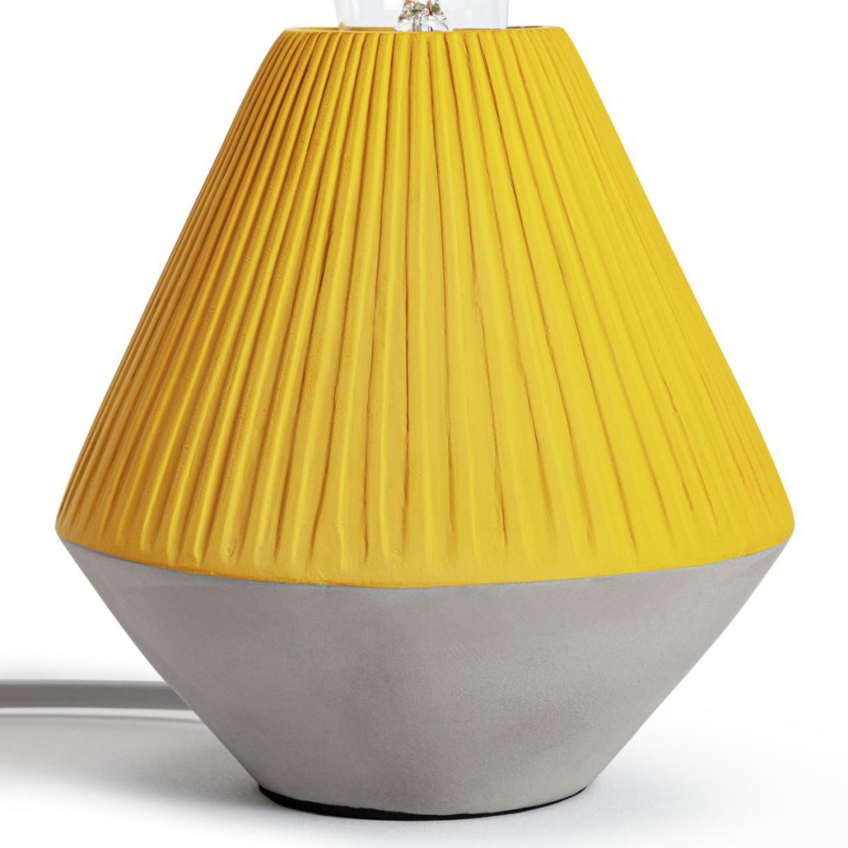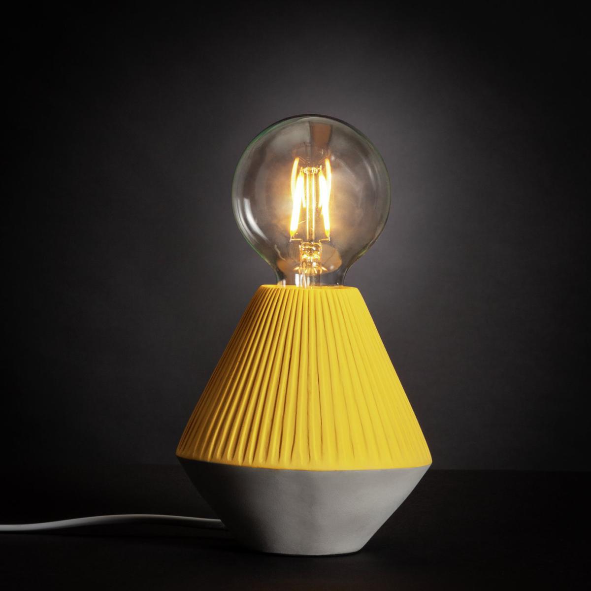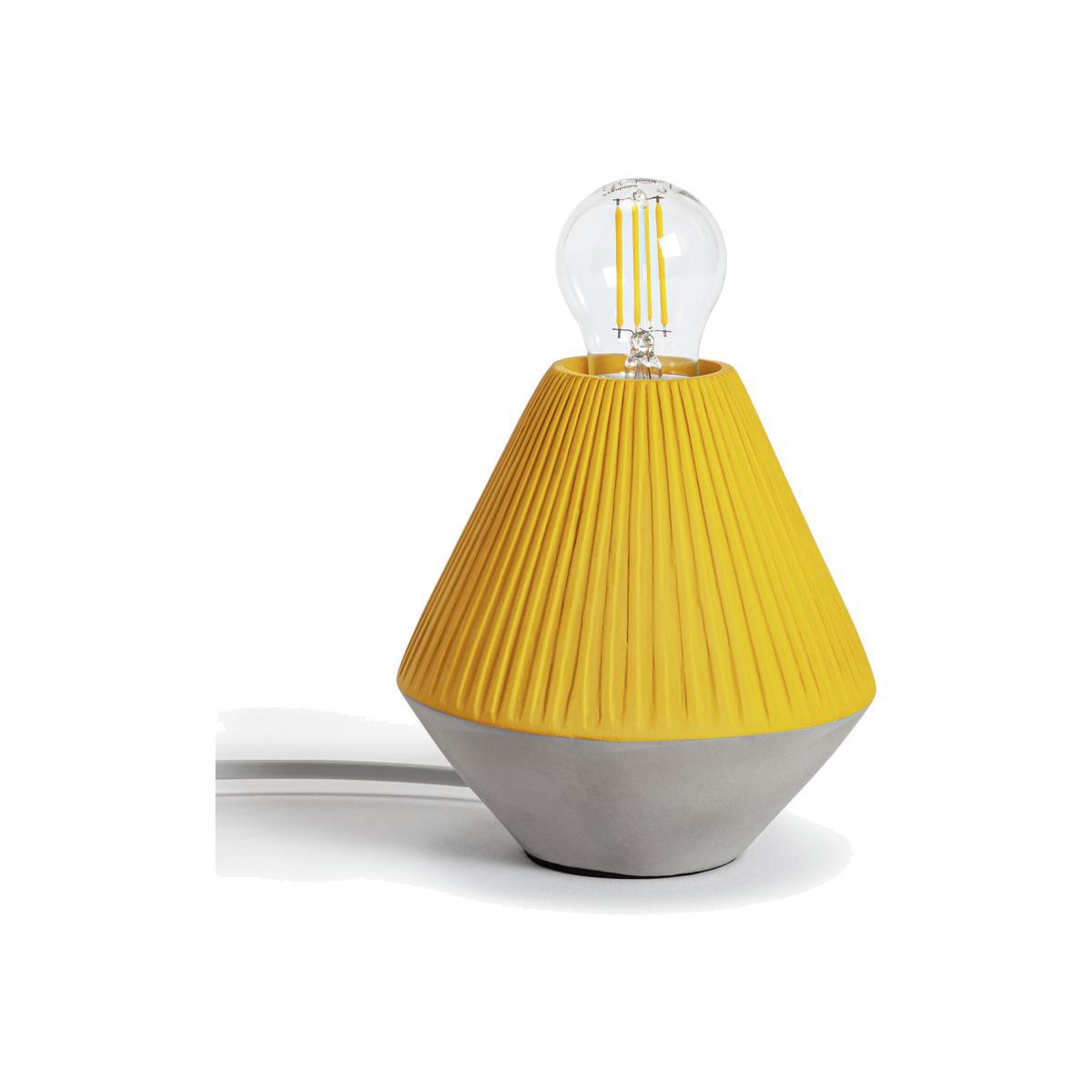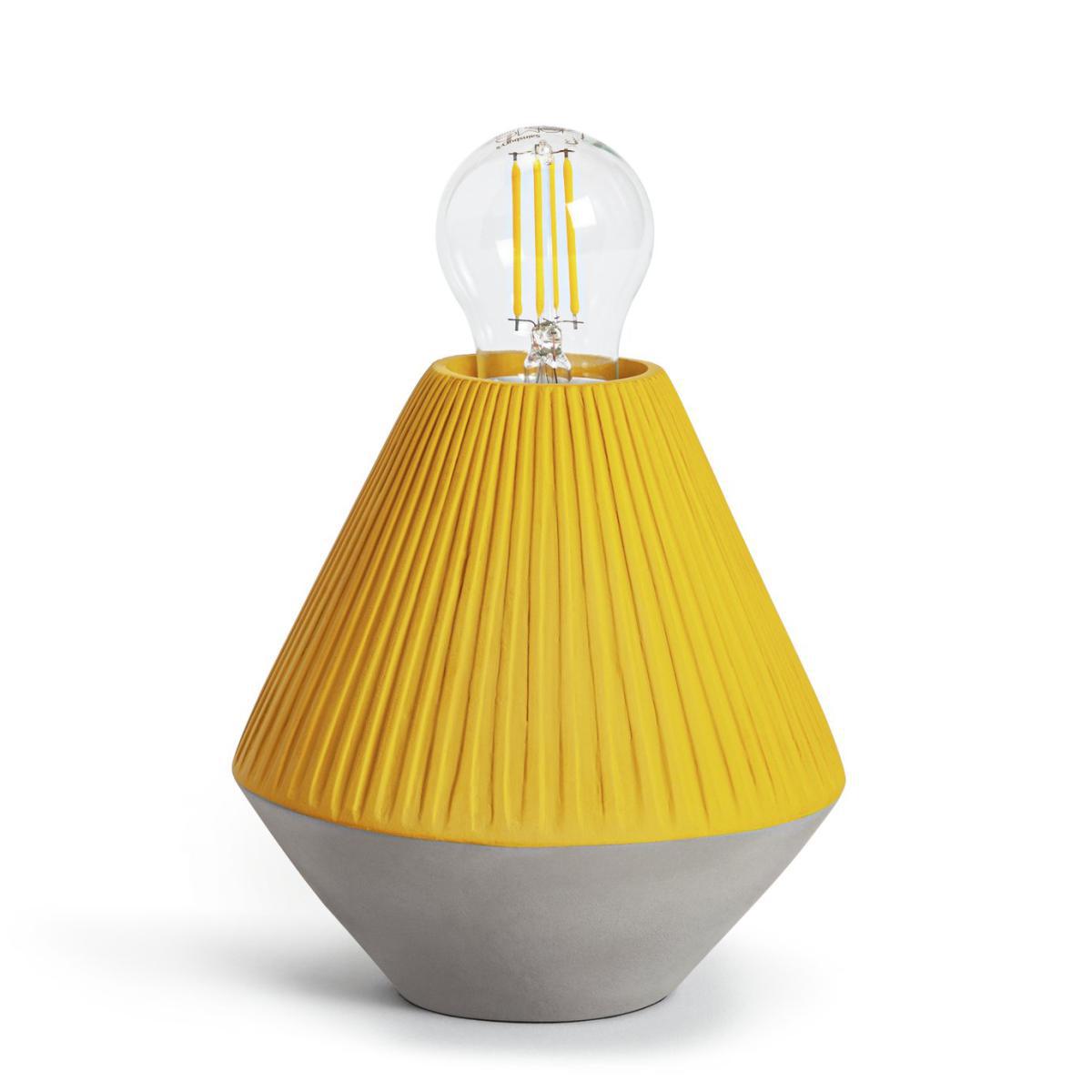 See the light. This table lamp is very industrial chic. Adds a bright splash of colour to any surface. The oversize bulb above a shade in mustard yellow, turns design upside down. A real standout piece. A smooth sleek, grey base complements the textured top, so tactile you'll want to touch it. Pop the lamp up on a Rayner table to complete the minimalist effect.