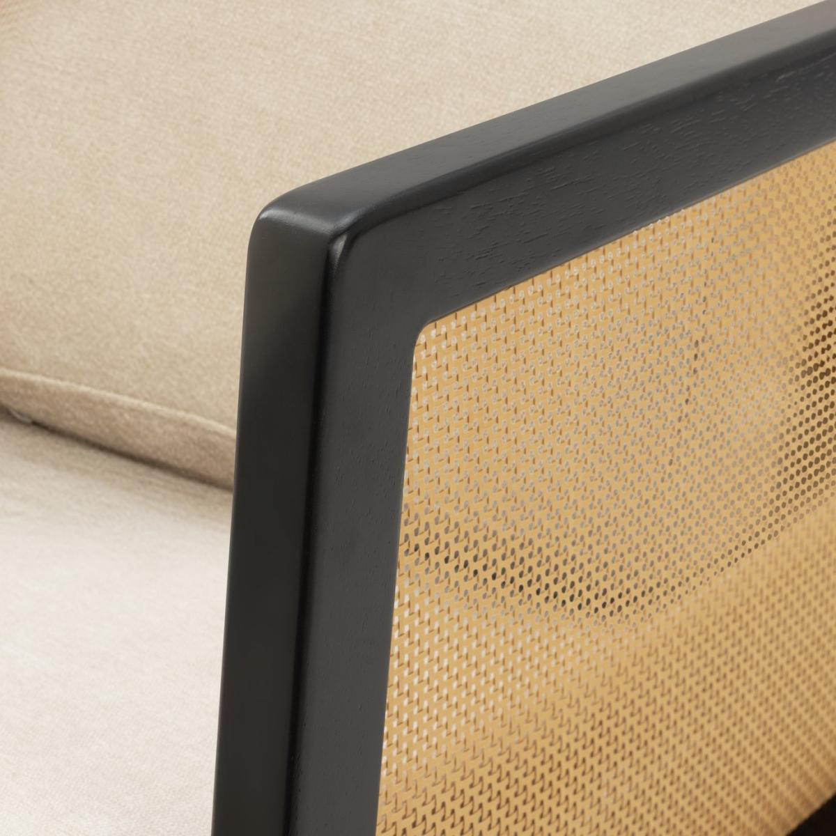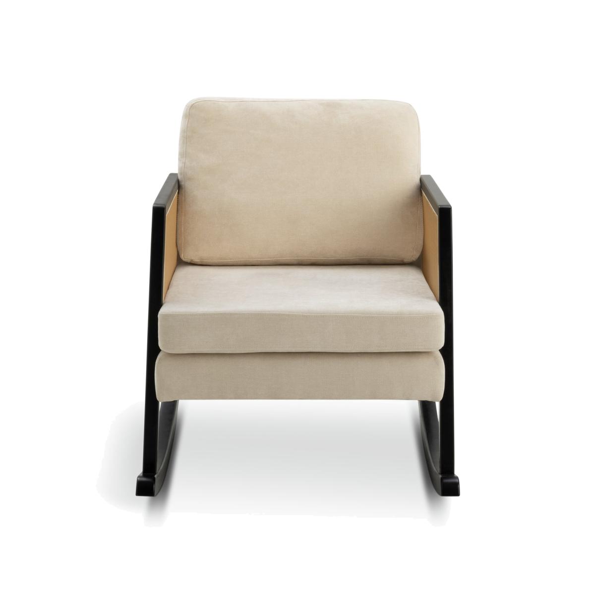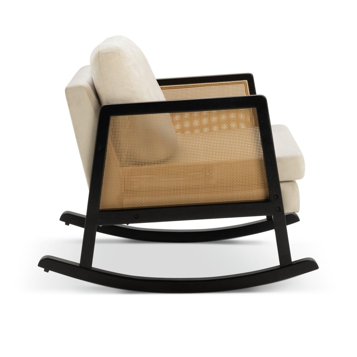Heavy on contrast loaded with style. This distinctive rocking chair is a retro relaxer. Upholstered in rich cream fabric with a black wooden frame elevated by rattan detailing. A looker indeed. Have a seat and rock that mid-century style. Fibre filled cushions make this a dream to sink into. Grab a book and settle down, you've a comfy spot for hours on end. Material: Made from 100% polyester. Wooden feet. Fixed seat with foam filling. Removable cushion(s) with fibre filling. Dimensions: Size H82, W67, D93cm. Floor to seat height: 48cm. Depth of seat: 60cm. Height of seat back: 69cm. Width of seating area between arms: 60cm. Height of arm rest: 67cm. Weight 15.8kg. Dust or wipe with a damp cloth only. Minimal assembly - just add feet. Maximum individual user weight 110kg. Packaged dimensions: Package size H48, W75, D66cm. FSC certified meaning the materials used for this product are responsibly sourced. General information: Manufacturer's 2 year frame guarantee.
