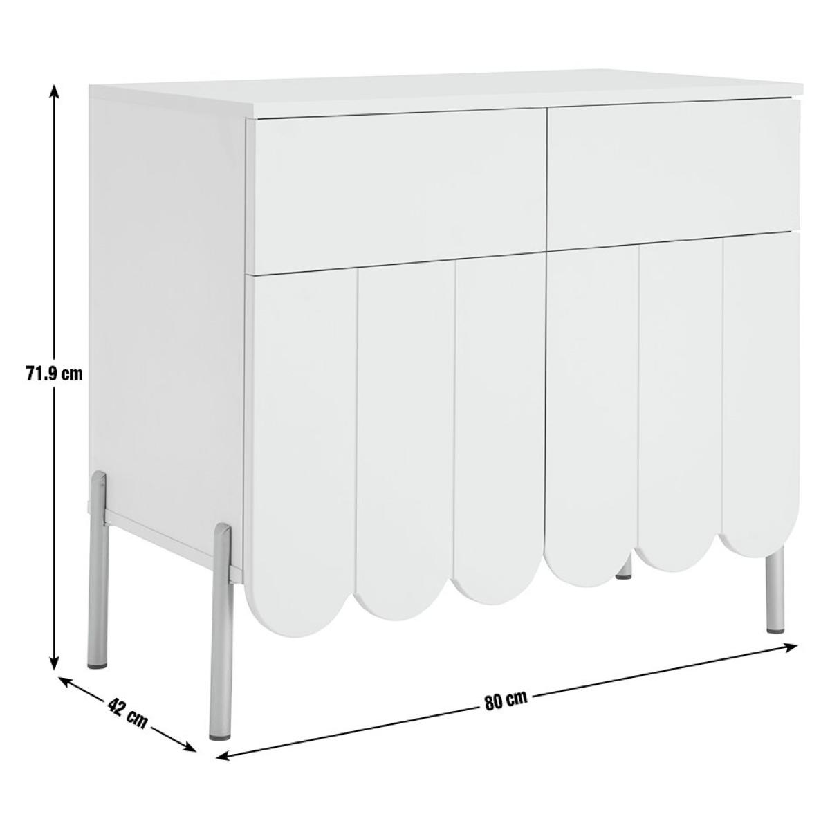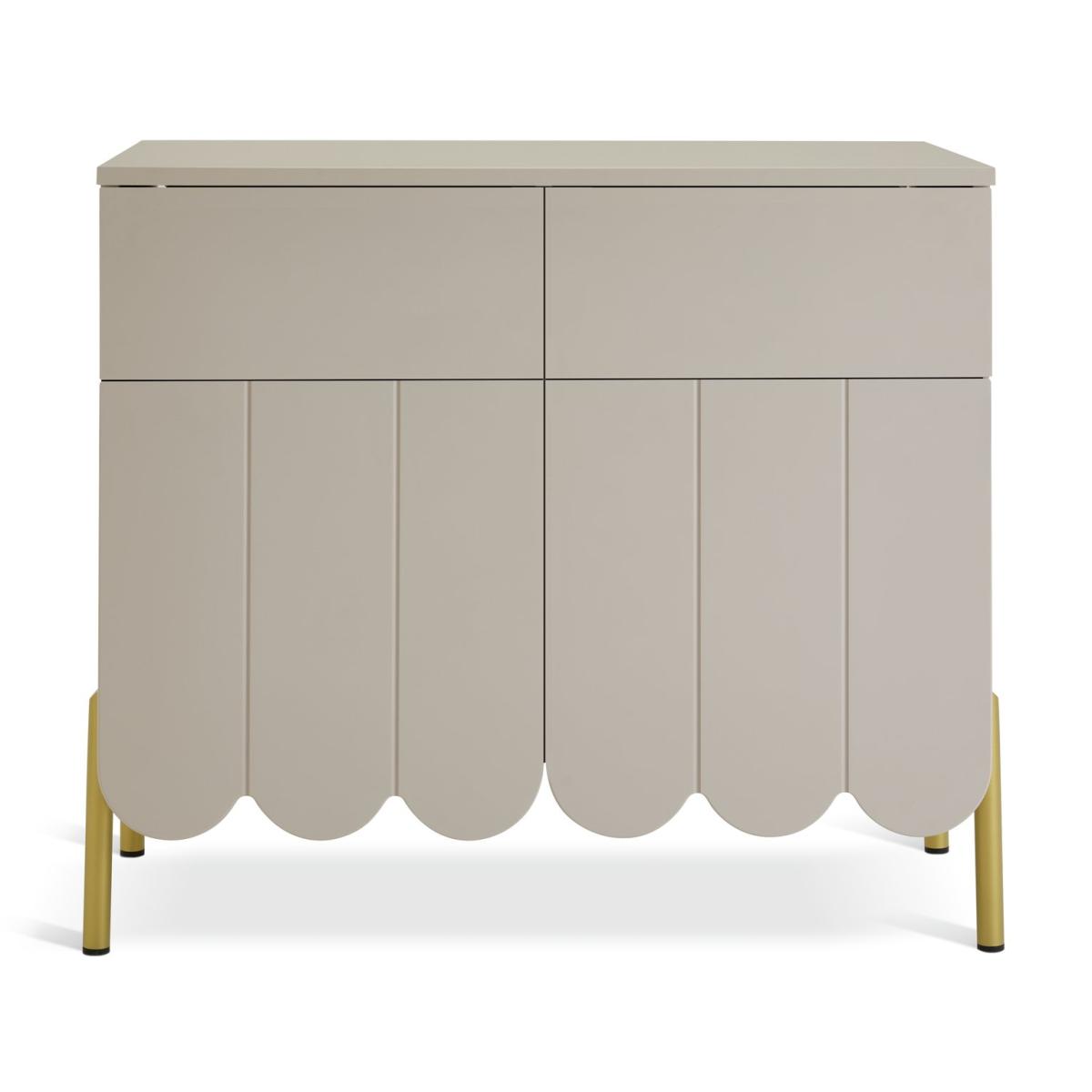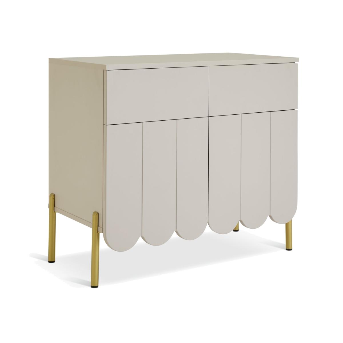 Stylish statement sideboard? Yes please. Fala's all about distinctive, standout features. From the neutral lacquered finish to the elegant, scalloped panelling, it's a decor-elevating piece of furniture. Finished with 2 roomy cupboards and 2 deep easy glide drawers, while golden feet add the final flourish. Part of the Fala collection. Made from particleboard with a laquered finish. Size H 71.9, W 80, D42cm. 2 drawers with metal runners. 2 doors. Weight 23.5kg. Self-assembly - 1 person recommended. Maximum load weight 20kg. If this product is over 60cm high it must be securely attached to the wall to prevent overturning. General information: Manufacturer's 2 year guarantee. FSC certified meaning the materials used for this product are responsibly sourced.