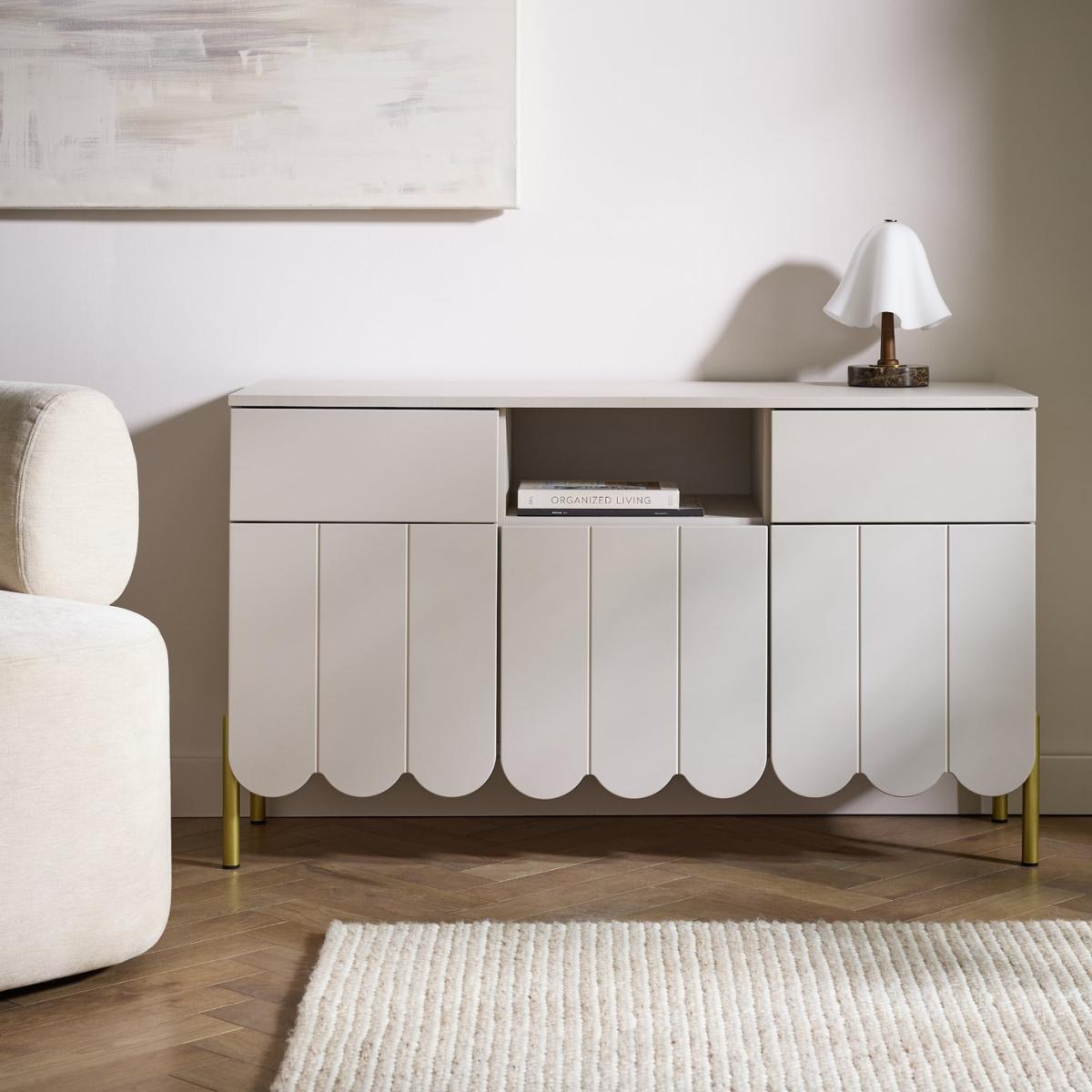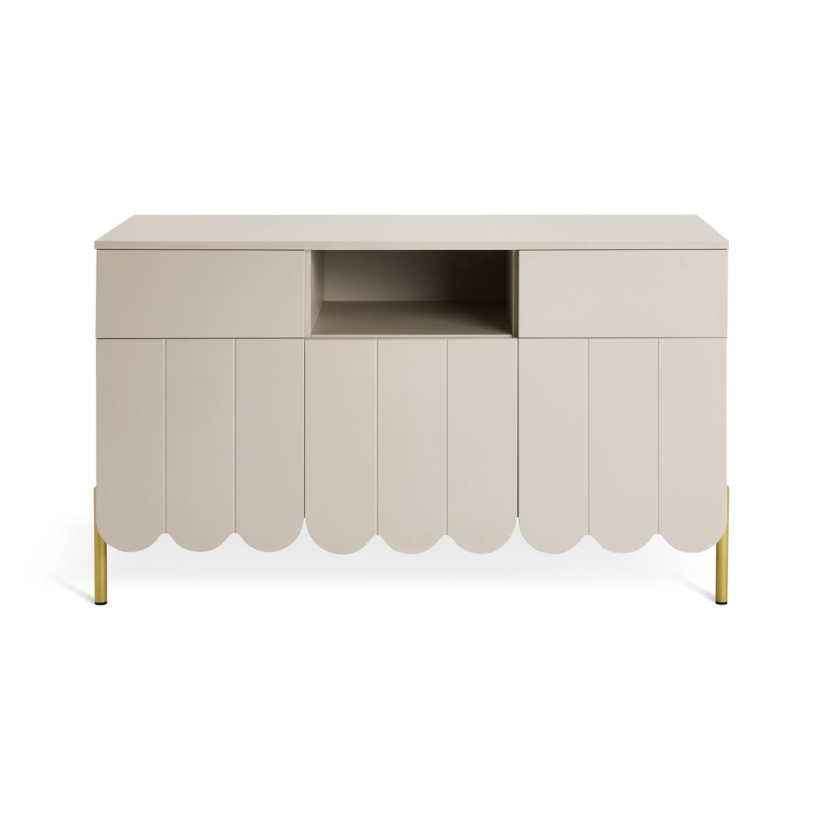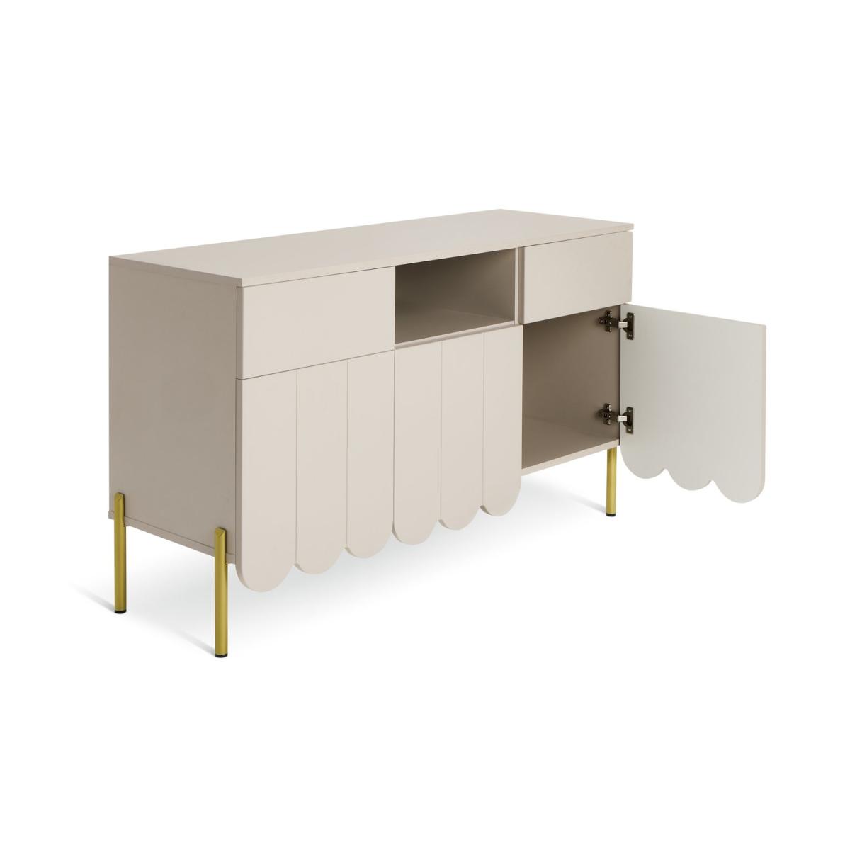 Stylish statement sideboard? Yes please. Fala's all about distinctive, standout features. From the neutral lacquered finish to the elegant, scalloped panelling, it's a decor-elevating piece of furniture. Finished with 3 roomy cupboards and 2 deep easy glide drawers, while golden feet add the final flourish. Part of the Fala collection. Made from particleboard and MDF with a foil finished chipboard finish. Size H 71.2, W 120, D42cm. Includes Bluetooth speakers. 2 drawers with metal runners. 3 doors. Weight 38kg. Self-assembly - 1 person recommended. Maximum load weight 15kg. If this product is over 60cm high it must be securely attached to the wall to prevent overturning. Package Dimensions: Package 1 dimensions: H12, W77.3, D43.1cm. Package 1 weight: 18.5kg. Package 2 dimensions: H6.9, W129.3, D45.2cm. Package 2 weight: 21.5kg. Manufacturer's 2 year guarantee.