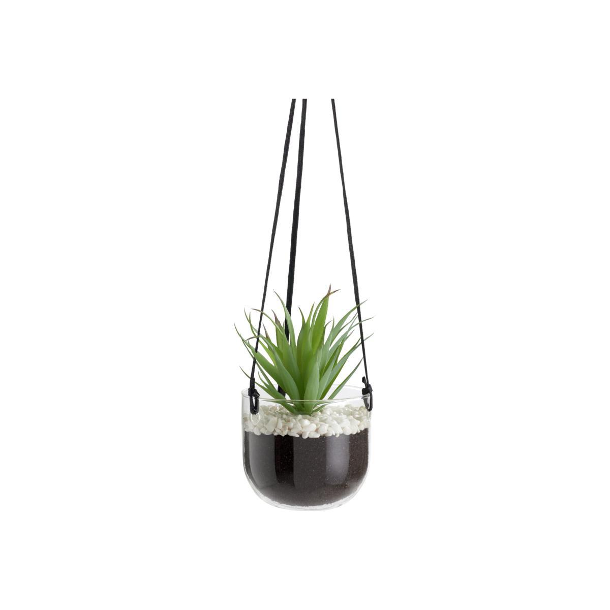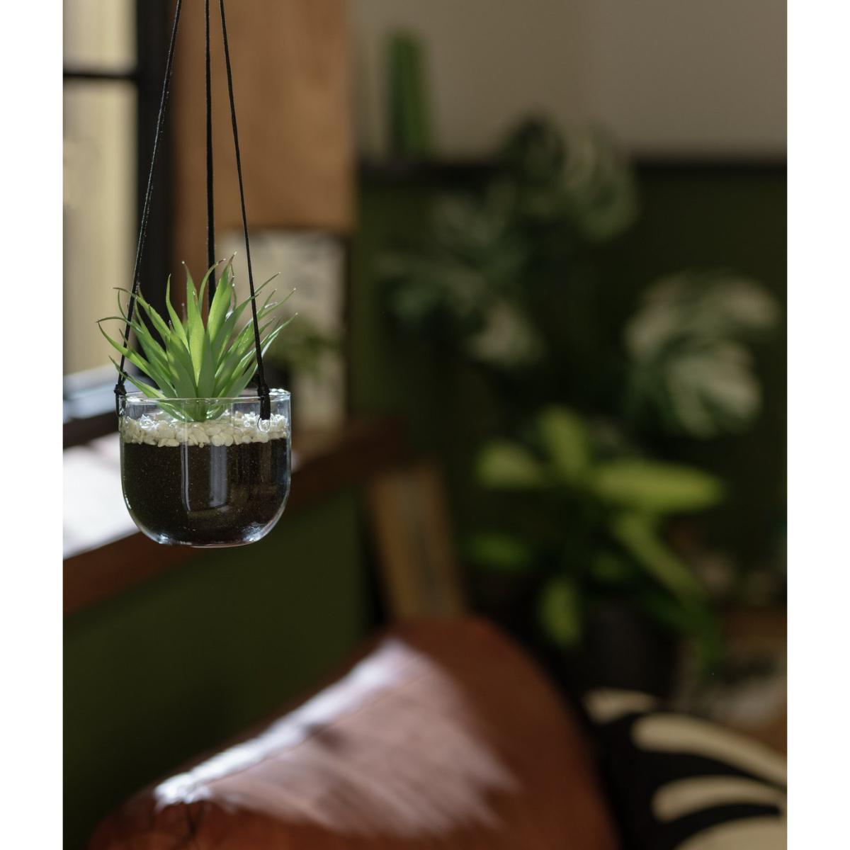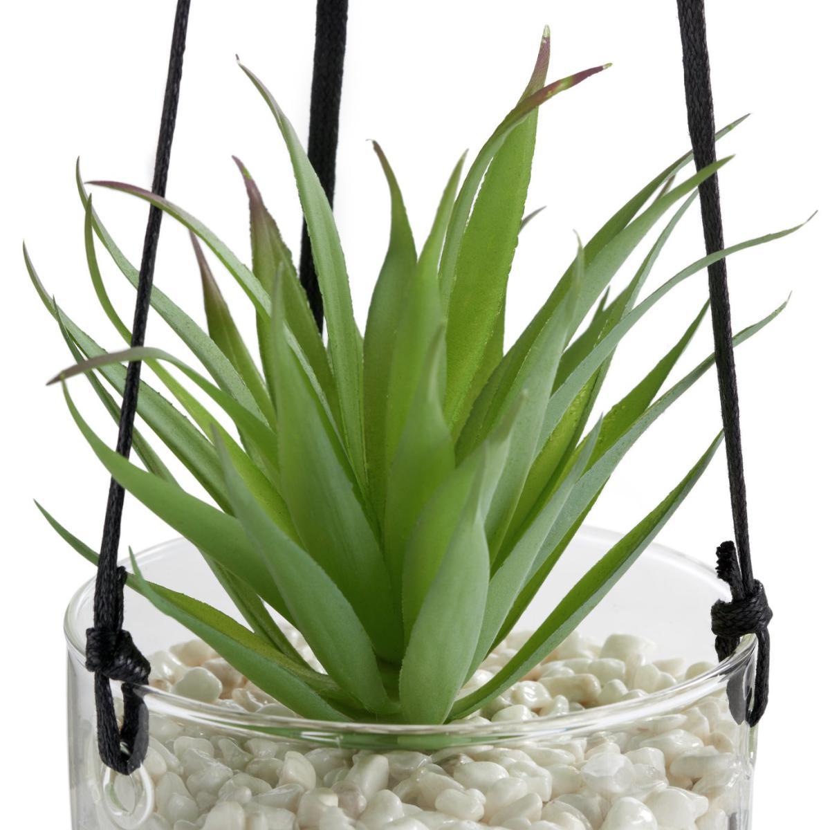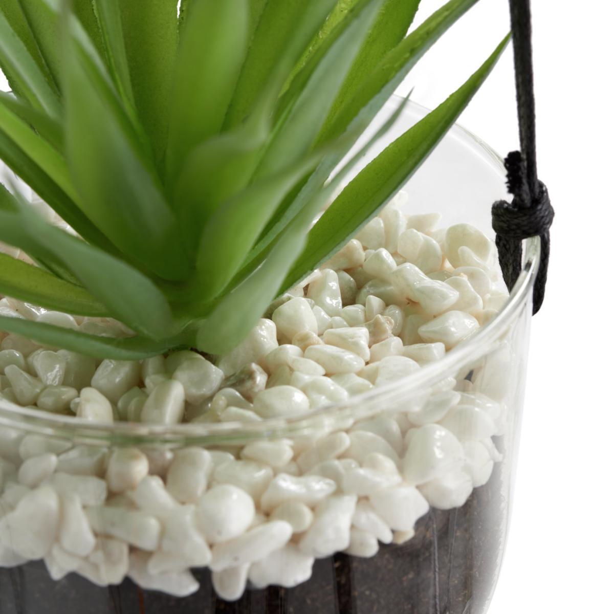 Sensational suspended succulent. Here's a hot looking faux plant that loves to hang out at home. Encased in glass and sitting on a bed of white pebbles and faux earth, this pretty plant lends a layered, organic look. Long tapered fleshy green leaves look just like the real thing. Very convincing, very cool. Pop the strong black cord over a hook or rail and there you have it. Instant high end botanical style.