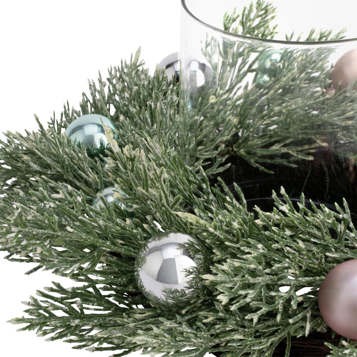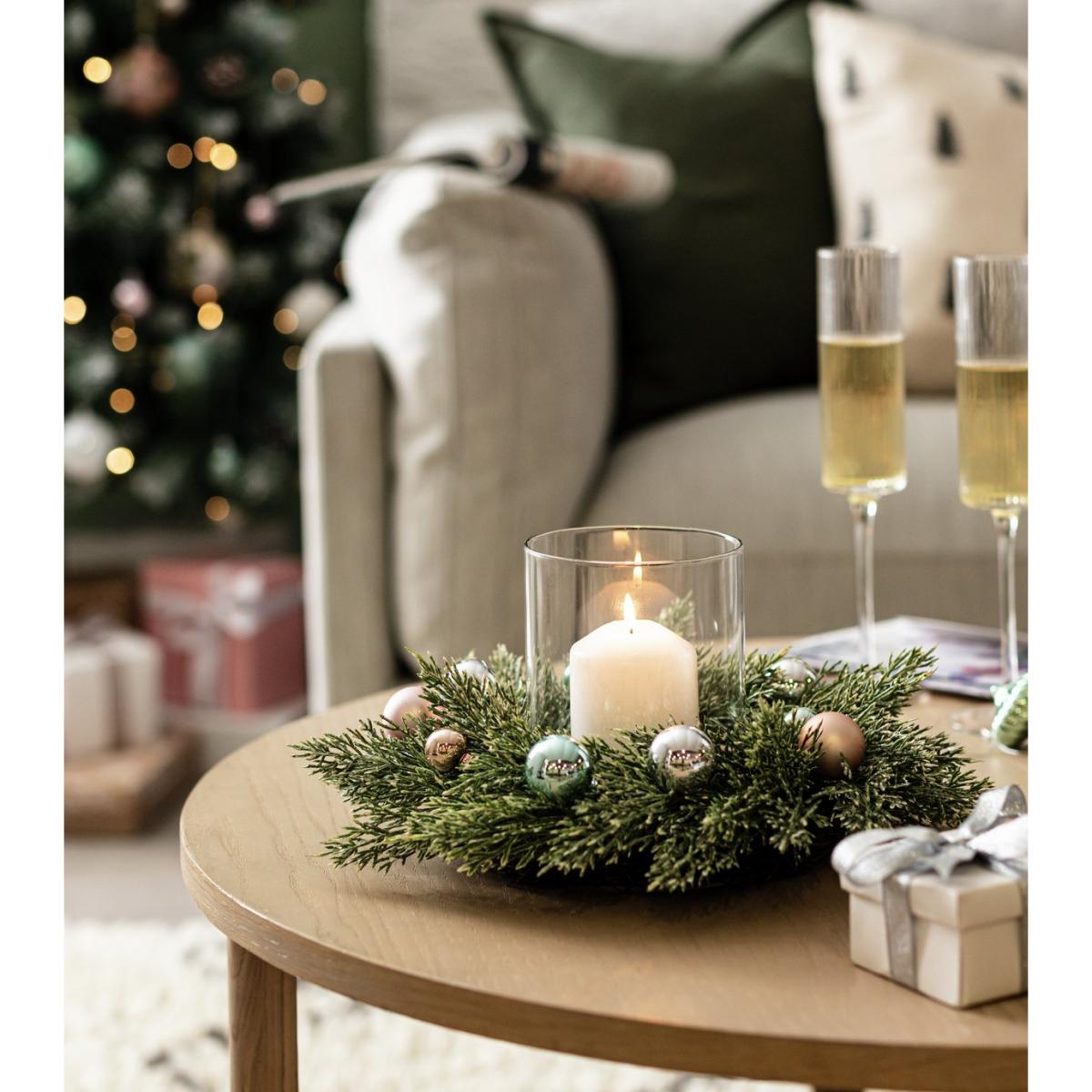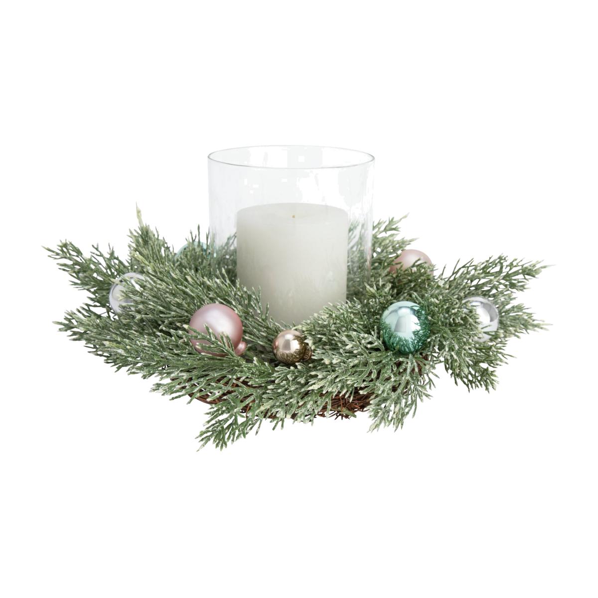 Dine in style. Our faux floral candle holder with baubles is a real treat. Designed to look frosted and real with a scattering of pastel decorations it's elegant and seasonal. With a glass centre, simply pop in your candle colour of choice to match the Christmas table. Or with a large table, space 2 or 3 of these artificial festive foliage decs down the centre line. Just light the candles and see the whole scene flicker and sparkle. Lovely.