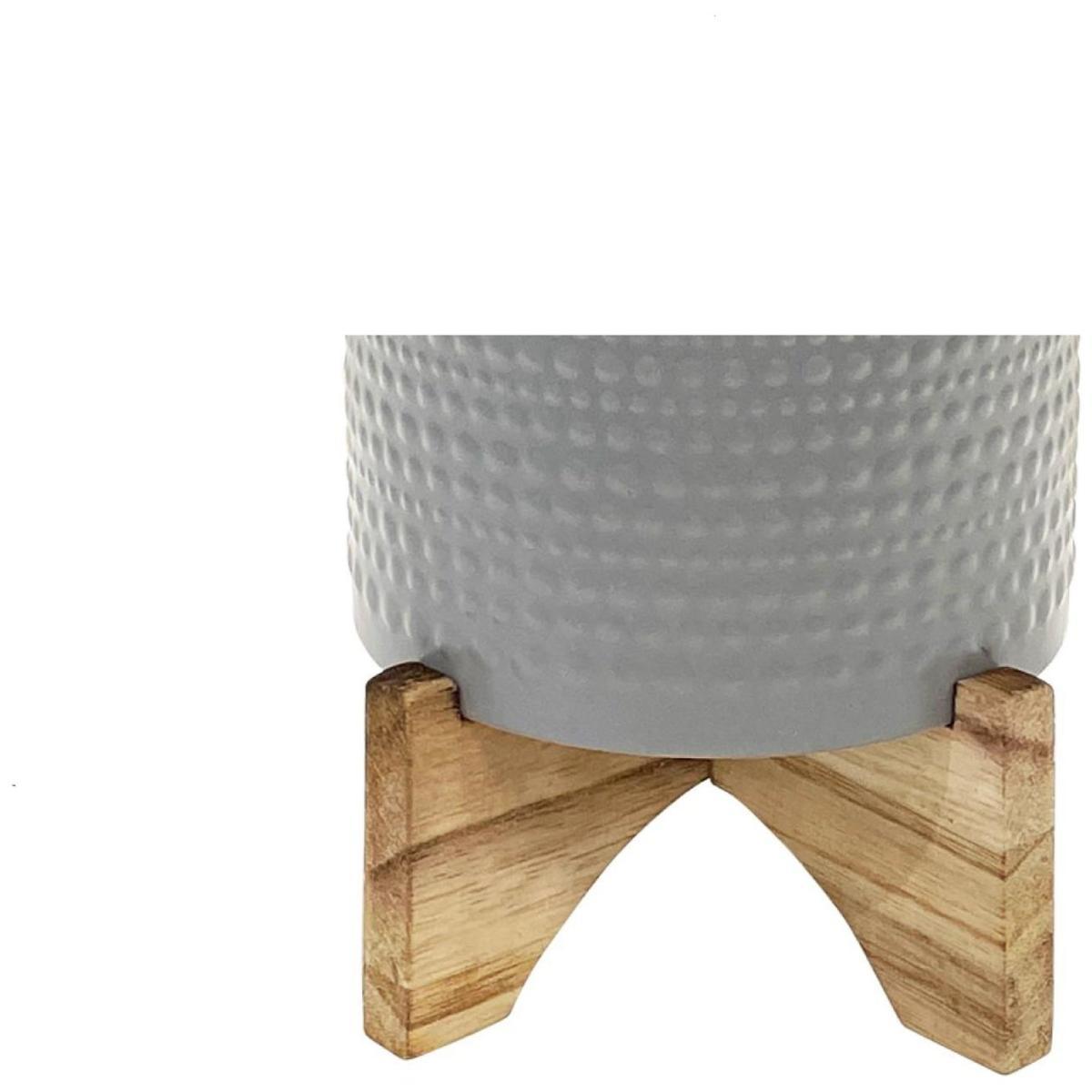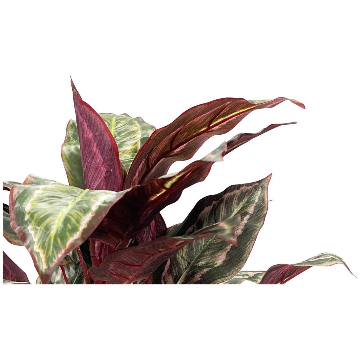 A big, botanical beauty. Our lush faux plant and stand brings fresh energy to your space. With colourful, detailed leaves and deep red stems, it looks just like the real deal. Standing proud on a natural wooden base, this textured grey planter looks good with natural and neutral decor. The best bit? There's no need for water, sunlight or pruning. That's a re-leaf.