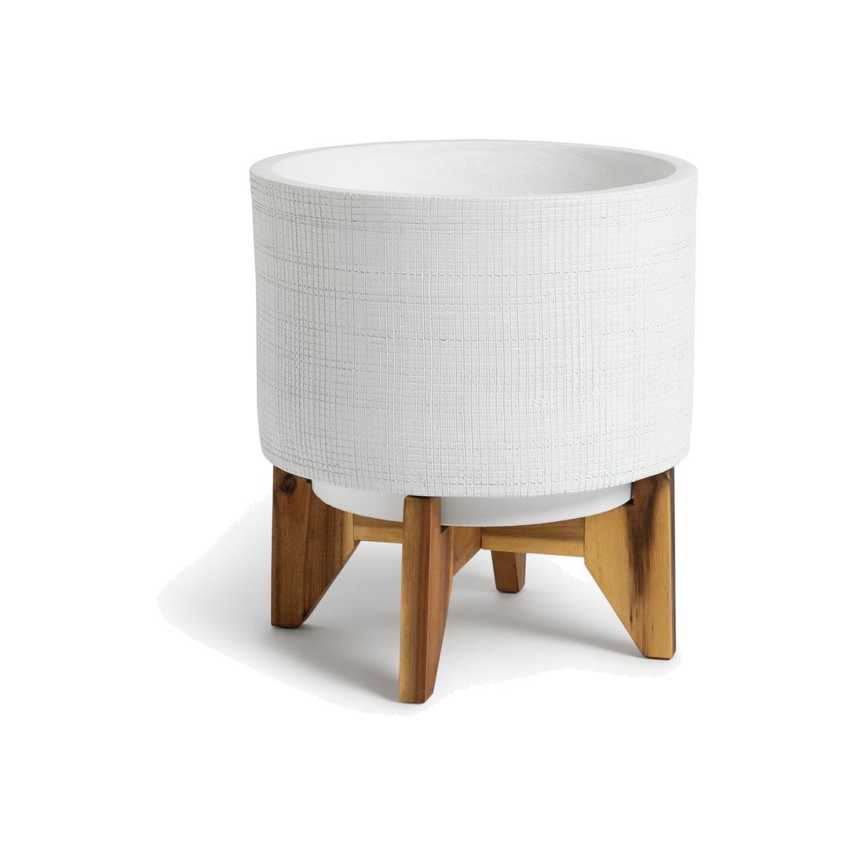 A naturally handsome spot for your faux leafy friend. Any plant will shine in this embossed ceramic planter. The cool white cylindrical pot has a tactile checked design and contrasts beautifully against the warm stained wooden legs. And standing at over a foot high it makes quite an impression. The perfect perch to show off a fab fern or a blooming beauty. Get potting. Realistic faux plants are a fuss free way to embrace the botanical trend. Pop one in your planter and you have an instant feature that's ever lasting and ever luscious. This cylindrical pot with wooden stand leg include diameter 30cm & height 34cm and the dimensions for pot include diameter 30cm and height 23cm.