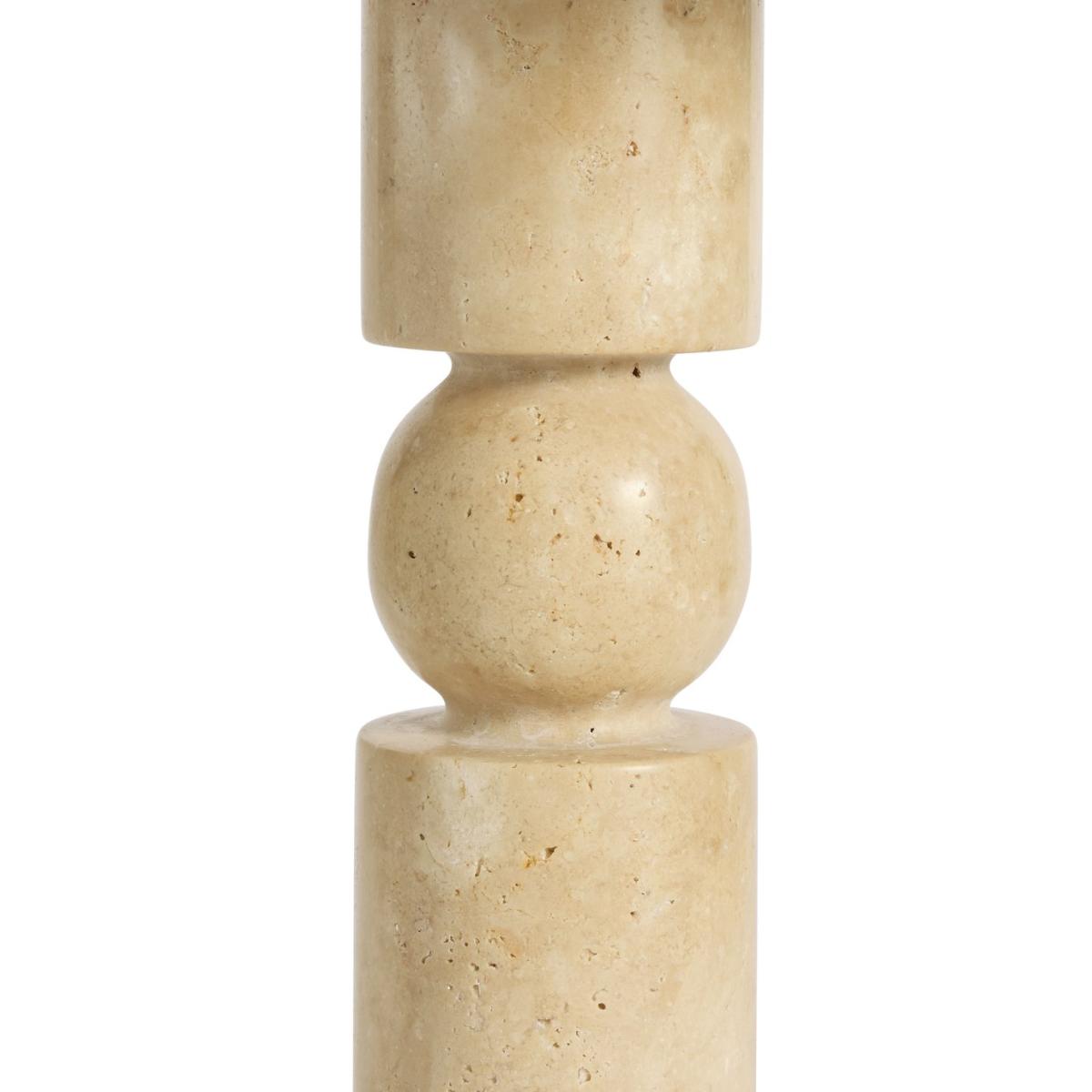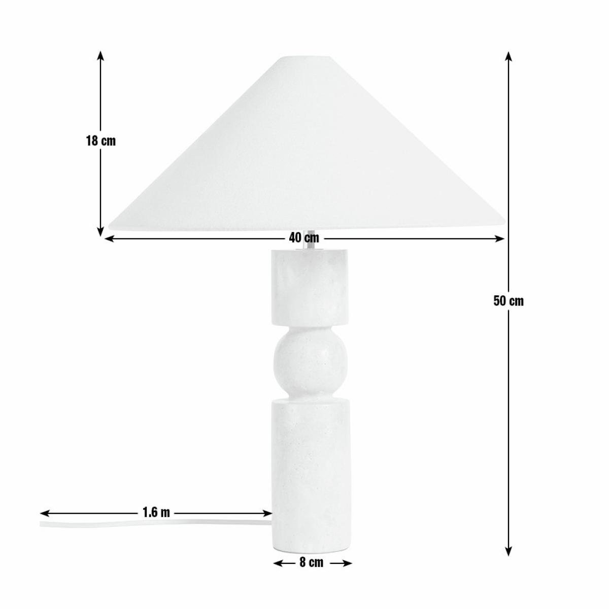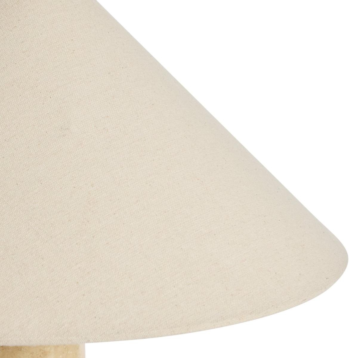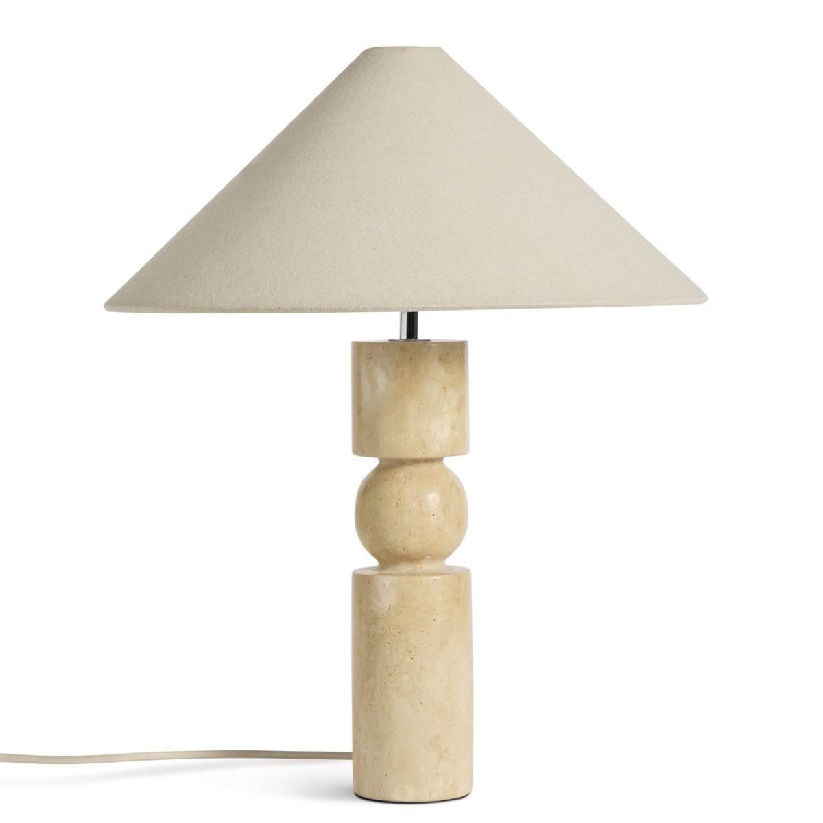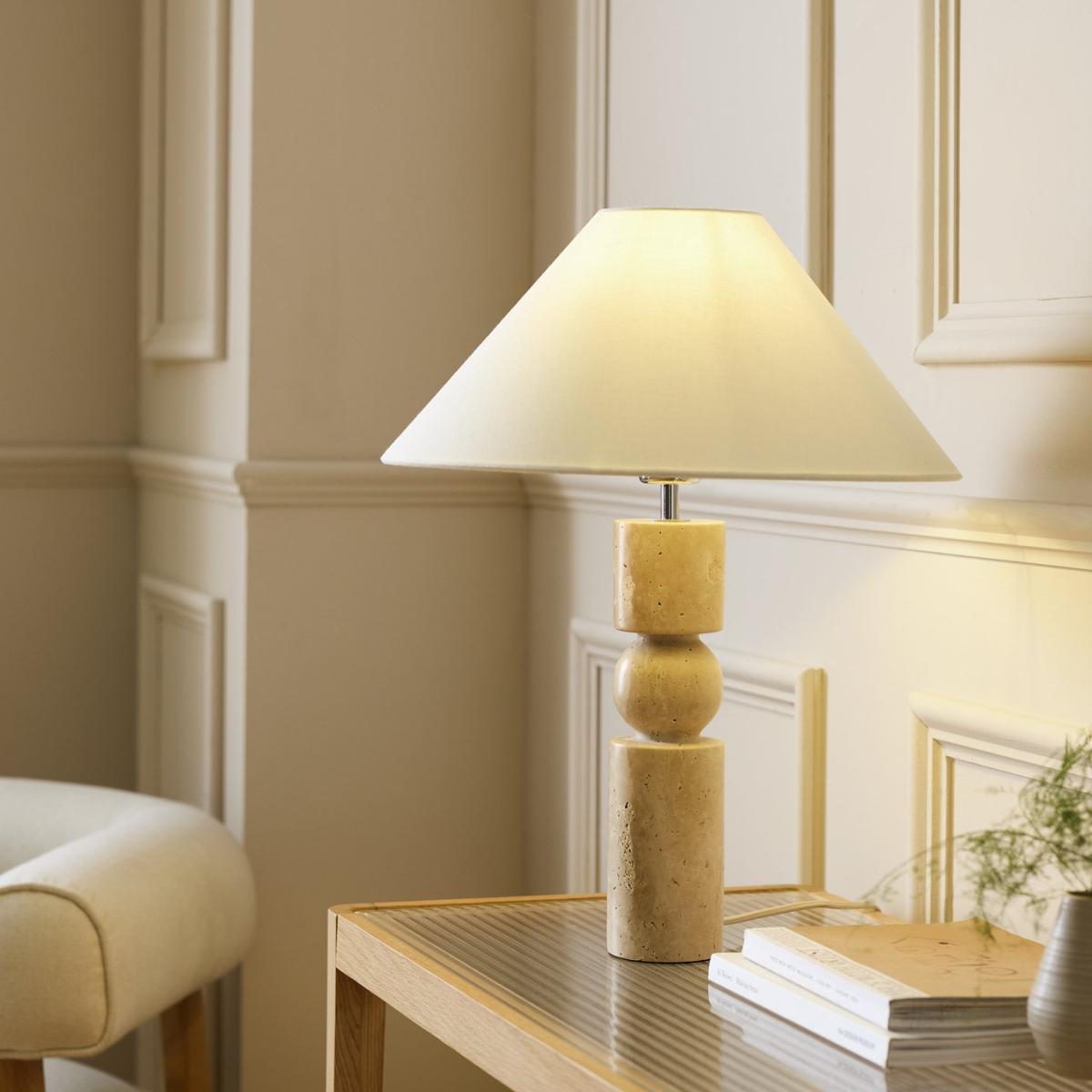 A sculptural delight. Set on a carved faux travertine base, this artisanal table lamp has a natural stone-like finish. The calm cream cotton shade gently diffuses light to create a relaxed ambience. Simply flick on the in-line switch and admire its beauty. Dimensions: Overall size H50, W40, D40 cm. Diameter 40cm. Shade size H18, D40cm. Diameter of base 8cm. Cord length 1.6m. Bulb Information: Bulbs required 1 x candle E27 edison screw LED bulb(s)(not included). Recommended maximum wattage: 10 watts. Alternative Bulb Required: 1. LED bulb only. General Information: Shade colour: natural. Base colour: natural. Shade material: cotton. Base material: stoneware. Product features: smart speaker compatible. In-line switch. IP rating 20. Minimal assembly. Product is mains powered plug in. This lighting product is a class 2 fitting. Manufacturer's 1 year guarantee.