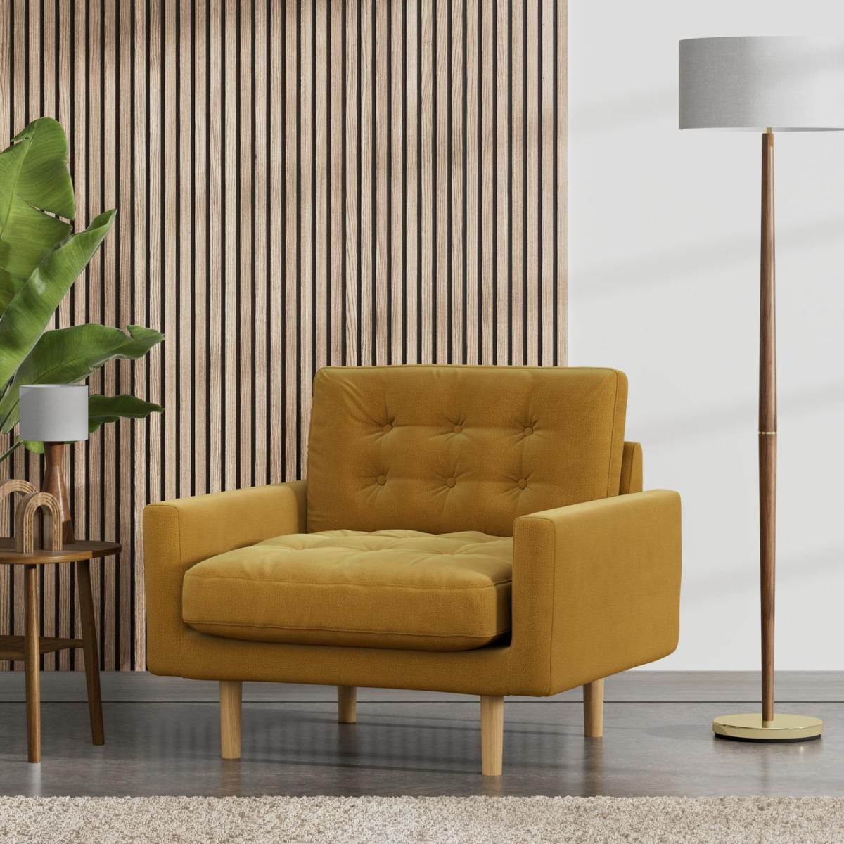 When it's made for you, you know you'll love it. The very popular Fenner armchair brings mid-century styling, combining hand buttoned deep sit soft seats and back cushions with a neat box frame shape. Upholstered in a velvety sheen chenille, the Fenner takes on a rich, soft, textured look. This sofa is finished with classically, slender tapered legs. Offering a more supportive seat, Fenners cushions use high density foam, further wrapped in a thick quilted fibre wrap to create the perfect balance of support, durability and recovery. Handmade to order in the UK. The Fenner uses quality materials and traditional techniques for furniture thats unique to you. Available in a choice of sizes and fabrics including Aquaclean technology protection built into the yarn, which is easy to clean with just water. Part of the Fenner collection. Material: Made from 100% polyester. Wooden feet. Removable seat with fibre filling. Removable cushion(s) with fibre filling. Dimensions: Size H85, W94, D87cm. Floor to seat height: 47cm. Depth of seat: 59.5cm. Height of seat back: 66cm. Width of seating area between arms: 74cm. Height of arm rest: 53cm. Weight: 19kg. Packaged dimensions: Package size H90, W99, D93cm. General information: FSC certified meaning the materials used for this product are responsibly sourced. We do more than deliver your product, we unpack, set it up and take away the packaging. Manufactured in the UK using components sourced globally. Professional clean only. Plump cushions regularly to maintain shape. Manufacturer's 15 year frame guarantee.