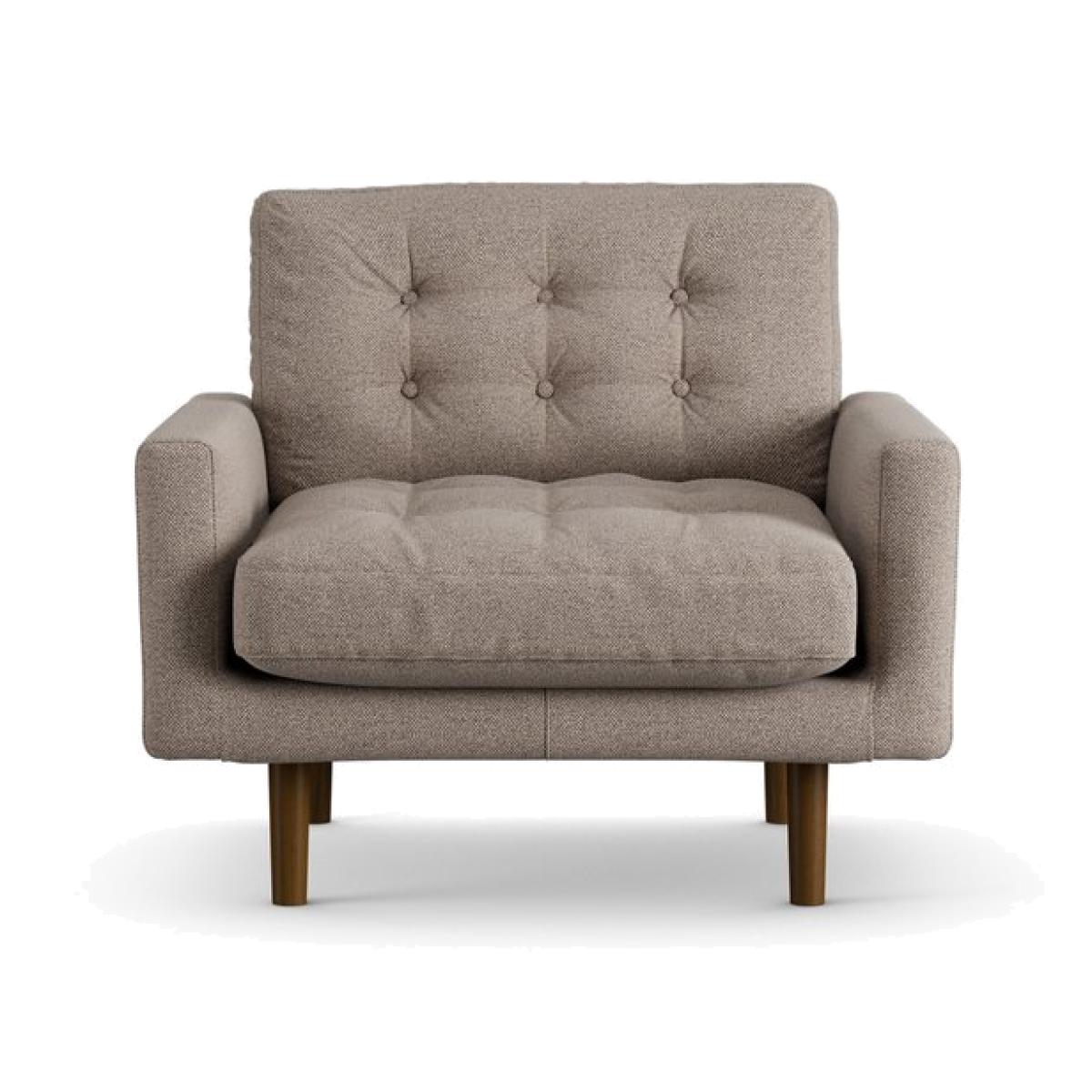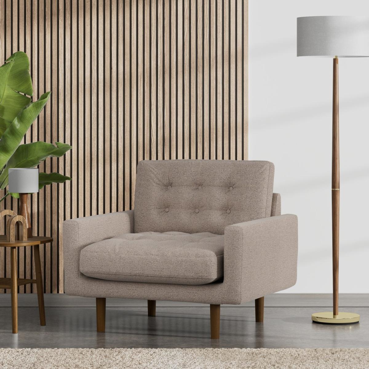 When it's made for you, you know you'll love it. The very popular Fenner armchair brings mid-century styling, combining hand buttoned deep sit soft seats and back cushions with a neat box frame shape. Upholstered in a textured weave, the Fenner takes on a soft, tactile feel. This sofa is finished with classically, slender tapered legs. Offering a more supportive seat, Fenners cushions use high density foam, further wrapped in a thick quilted fibre wrap to create the perfect balance of support, durability and recovery. Handmade to order in the UK. The Fenner uses quality materials and traditional techniques for furniture thats unique to you. Available in a choice of sizes and fabrics including Aquaclean technology protection built into the yarn, which is easy to clean with just water. Part of the Fenner collection. Material: Made from 100% polyester. Wooden feet. Removable seat with fibre filling. Removable cushion(s) with fibre filling. Dimensions: Size H85, W94, D87cm. Floor to seat height: 47cm. Depth of seat: 59.5cm. Height of seat back: 66cm. Width of seating area between arms: 74cm. Height of arm rest: 53cm. Weight: 19kg. Packaged dimensions: Package size H90, W99, D93cm. General information: FSC certified meaning the materials used for this product are responsibly sourced. We do more than deliver your product, we unpack, set it up and take away the packaging. Manufactured in the UK using components sourced globally. Professional clean only. Plump cushions regularly to maintain shape. Manufacturer's 15 year frame guarantee.