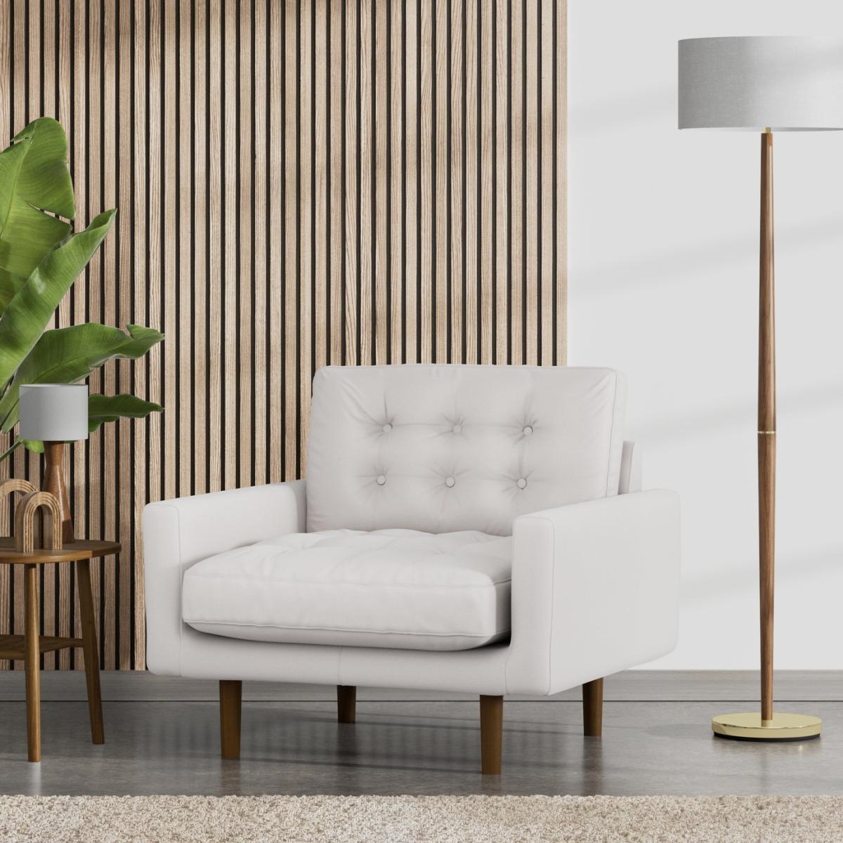 I love this armchair for its versatile neutral tone that works well in both contemporary and traditional interiors. The natural fabric adds a soft, inviting touch, while the dark legs provide a grounding element, making it easy to pair with colour-rich or muted palettes. It’s a great choice for cosy corners, living rooms, or even bedrooms where a relaxed, stylish seat is needed. For styling, consider layering with textured cushions or throws to add personality, and pair with a side table or a statement floor lamp to create a welcoming reading nook. Its compact size makes it particularly practical for smaller spaces or as an accent piece in a larger scheme.