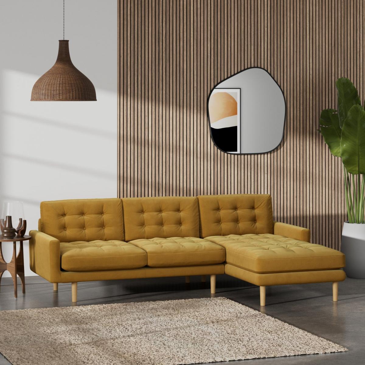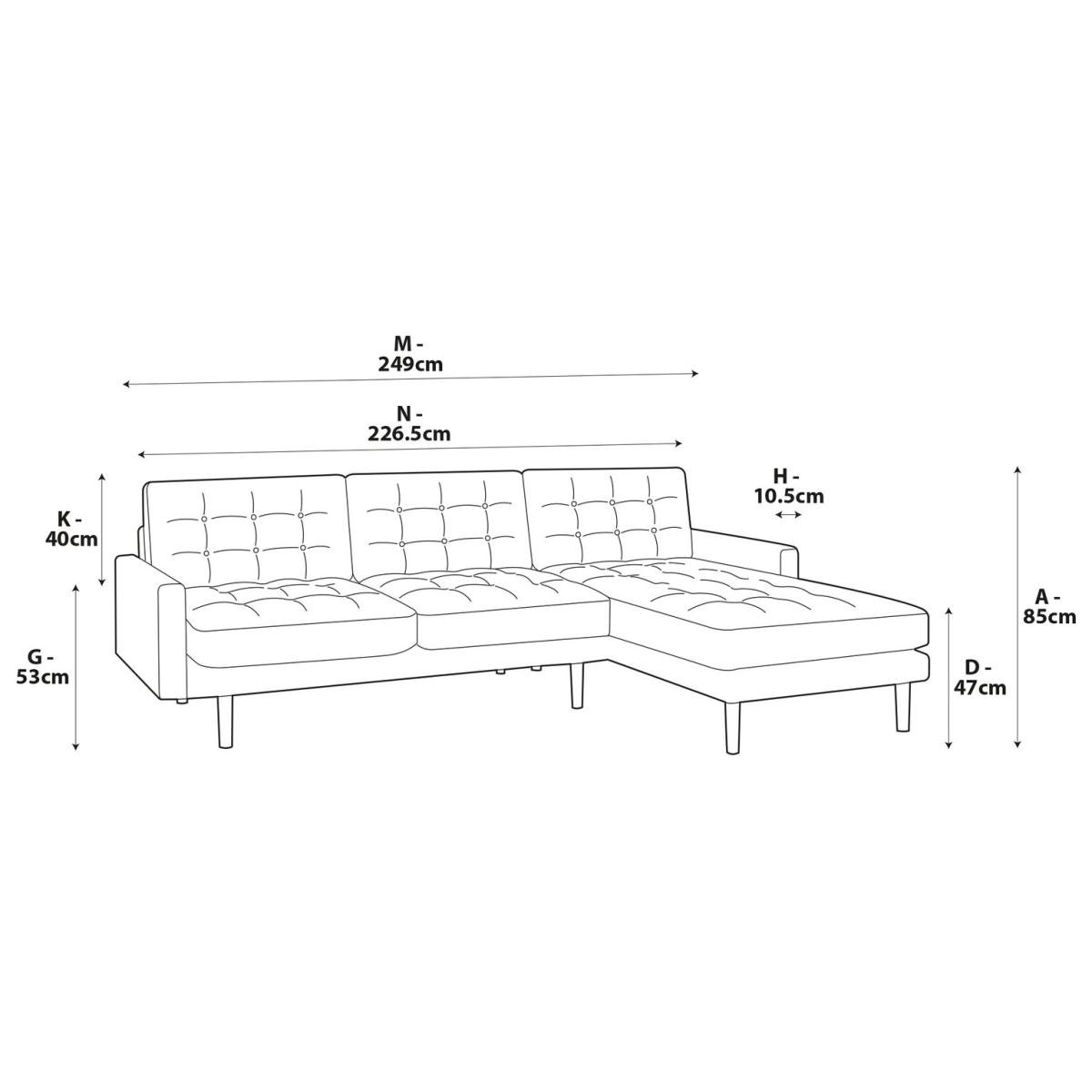 When it's made for you, you know you'll love it. The very popular Fenner 4-seater right hand chaise brings mid-century styling, combining hand buttoned deep sit soft seats and back cushions with a neat box frame shape. Upholstered in a velvety sheen chenille, the Fenner takes on a rich, soft, textured look. This sofa is finished with classically, slender tapered legs. Offering a more supportive seat, Fenner's cushions use high density foam, further wrapped in a thick quilted fibre wrap to create the perfect balance of support, durability and recovery. Handmade to order in the UK. The Fenner uses quality materials and traditional techniques for furniture that's unique to you. Available in a choice of sizes and fabrics including Aquaclean technology protection built into the yarn, which is easy to clean with just water. Part of the Fenner collection. Right hand corner. Material: Made from 100% polyester. Wooden feet. Removable seats with fibre filling. Removable cushion(s) with fibre filling. Free fabric swatch available on this line. Dimensions: Size H85, longer width 249,. Floor to seat height: 47cm. Depth of seat: 59.5cm. Height of seat back: 40cm. Longer seating area width between arms: 226.5cm. Height of arm rest: 53cm. Weight: 66kg. Packaged dimensions: Package size H90, W174, D93cm. Second package size H90, W91, D169cm. General information: FSC certified meaning the materials used for this product are responsibly sourced. Your seat cushions may feel a little firm on delivery, they are brand new and will soften with regular use over the next few months. We do more than deliver your product, we unpack, set it up and take away the packaging. Manufactured in the UK using components sourced globally. Professional clean only. Manufacturer's 15 year frame guarantee.