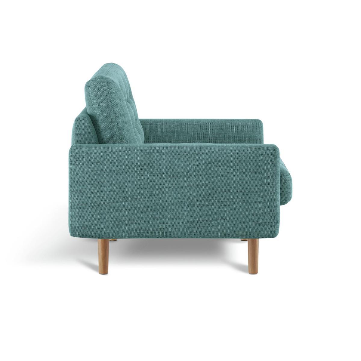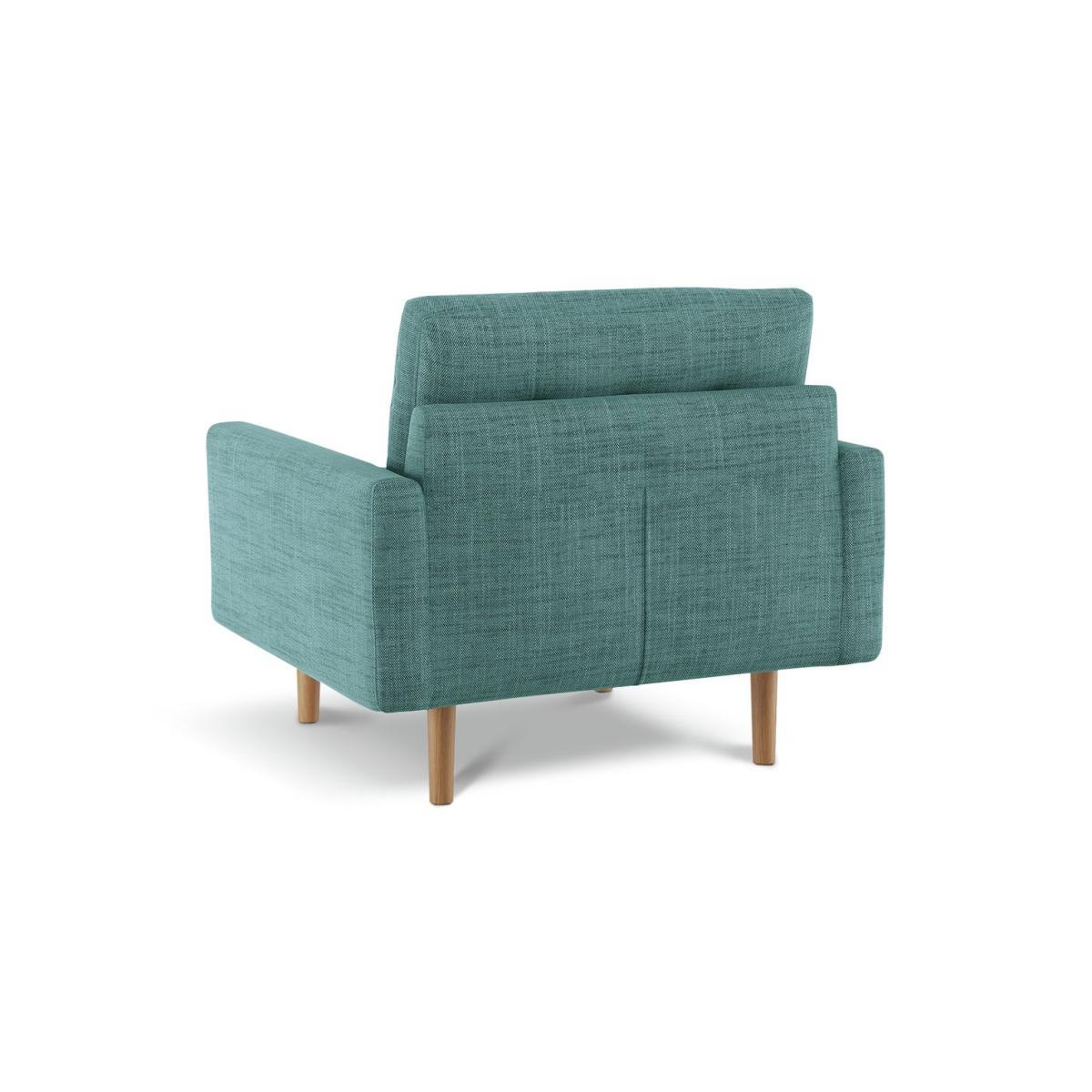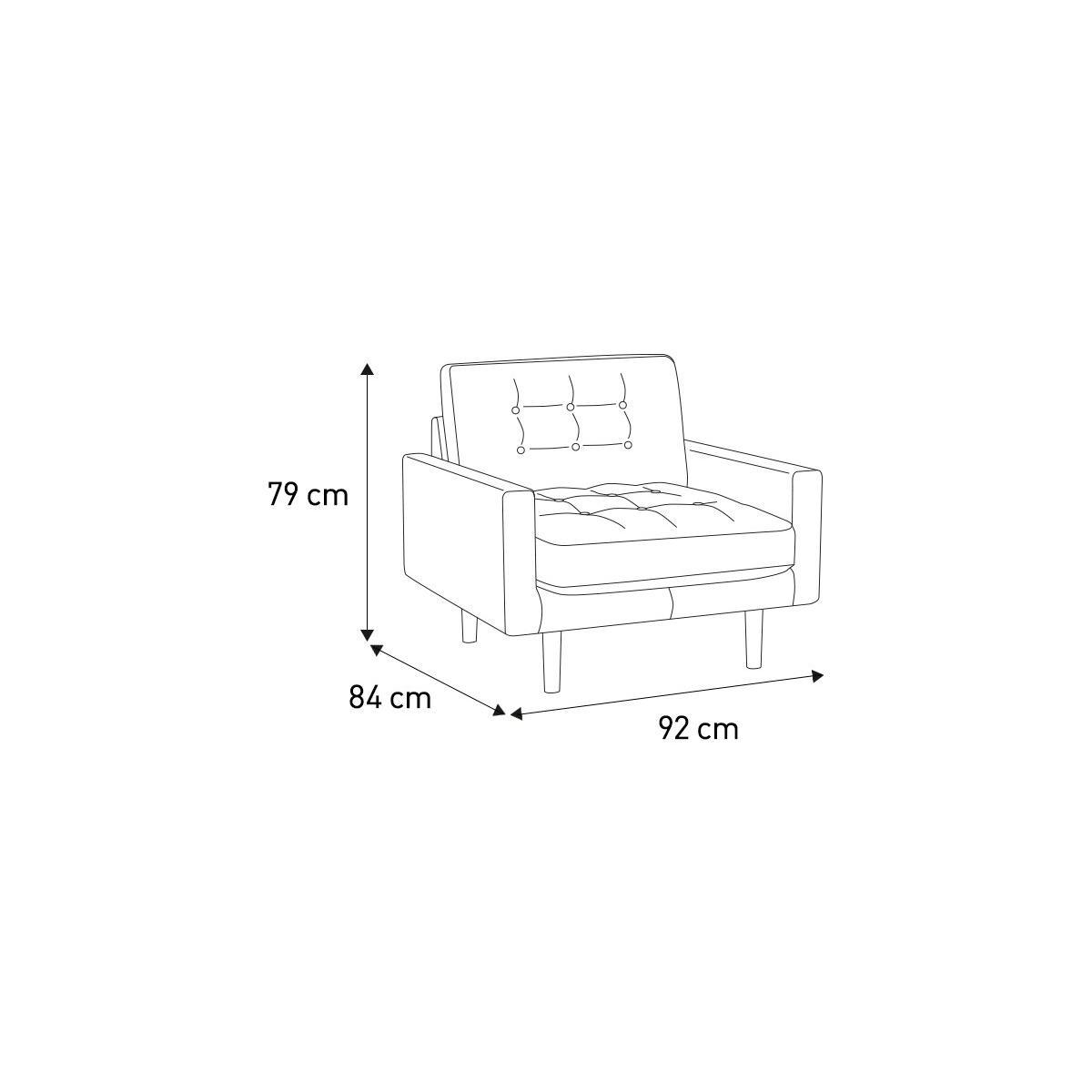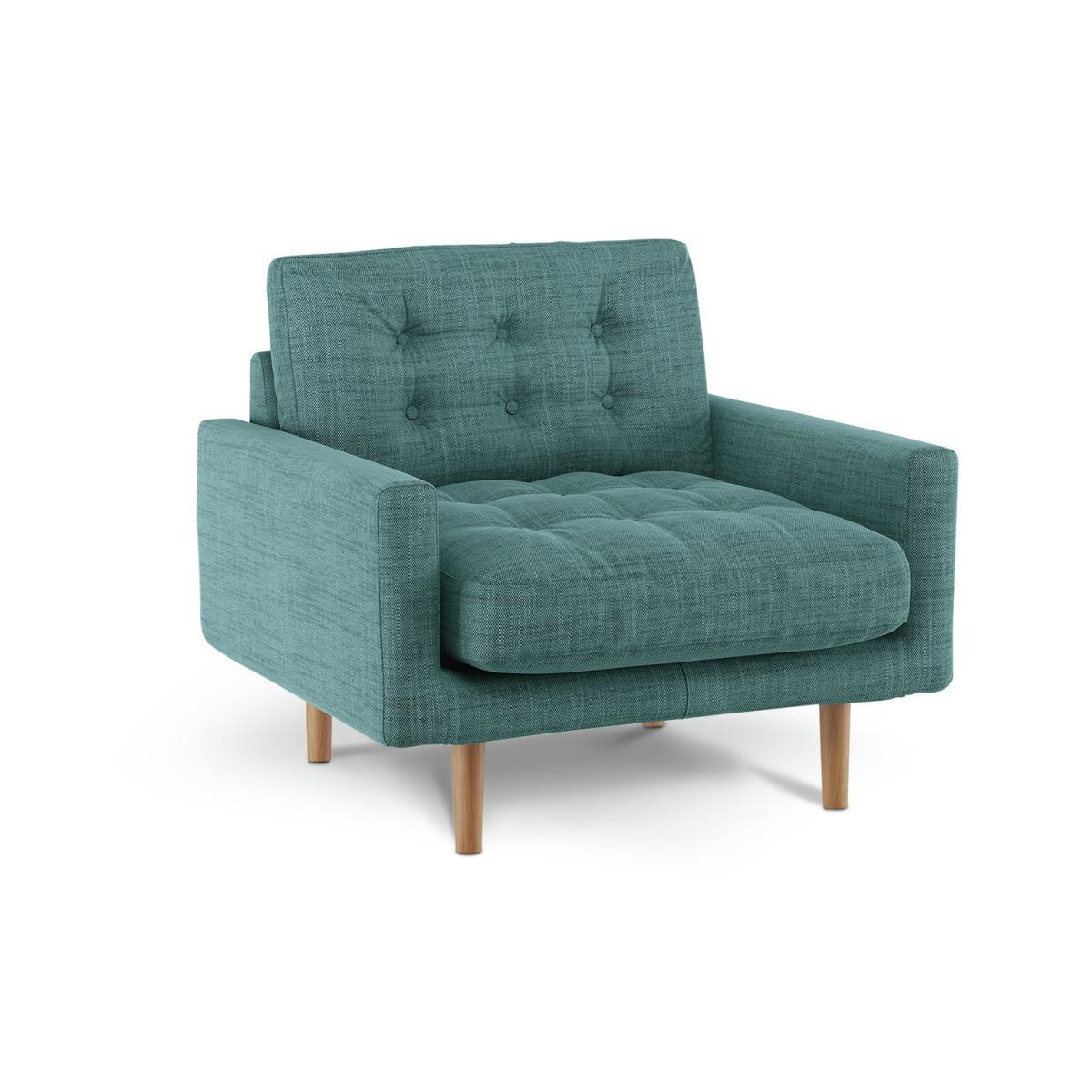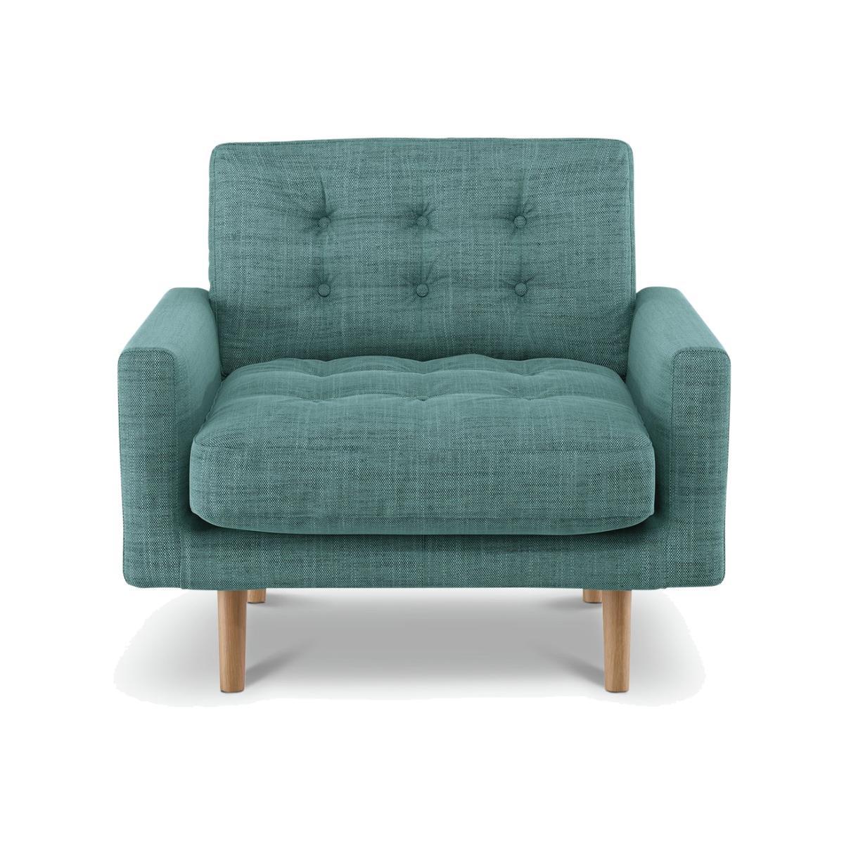 Made in Italy, the Fenner teal fabric armchair has slender cushioned arms and soft, feather-wrapped fibre seat and back cushions. The sumptuous armchair combines a classic box frame with loose covers for a softer look and has button detailing on its cushions, which acquire a relaxed, comfortably lived-in look over time. Exclusive to Habitat, the armchair's deep seat and thin frame create a large seating area; available in a choice of fabrics, colours, sizes and configurations, the design offers luxe for less. Material:Made from 100% polyester. Wooden feet. Fixed seat with foam and fibre with feather topper filling. Fixed cushion(s) with feather and fibre filling. Dimensions: Size H79, W92, D84cm. Floor to seat height: 39cm. Depth of seat: 63cm. Height of seat back: 40cm. Height of arm rest: 22cm. Packaged dimensions:Package size H55, W95, D95cm. General information:Plump cushions regularly to maintain shape. Self-assembly - just add feet. Maximum individual user weight 120kg. Manufacturer's 1 year guarantee.