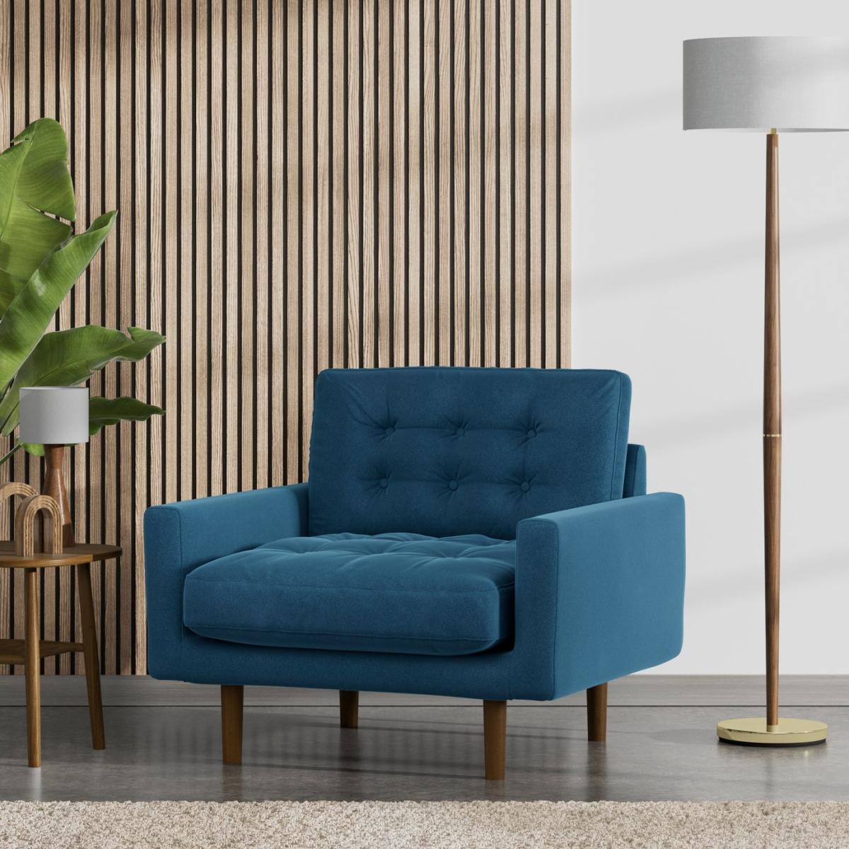I love this armchair for its rich ink blue velvet that brings a luxurious touch to any space. Its bold colour works particularly well in modern or eclectic interiors, offering a chic focal point, but it can also soften a neutral scheme with its plush texture. The dark legs give it a slightly mid-century feel, making it versatile for both contemporary and retro-inspired rooms. Practical styling tips include pairing it with metallic accessories or patterned cushions for visual interest, and placing it in a corner or against a wall to maximise space. It’s an excellent choice for adding comfort and colour to living rooms, bedrooms, or even a stylish reading nook.
