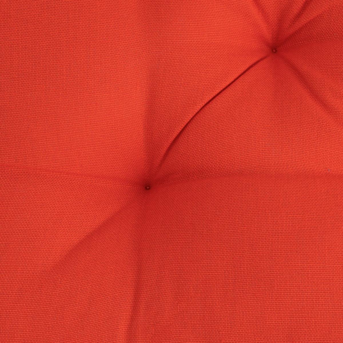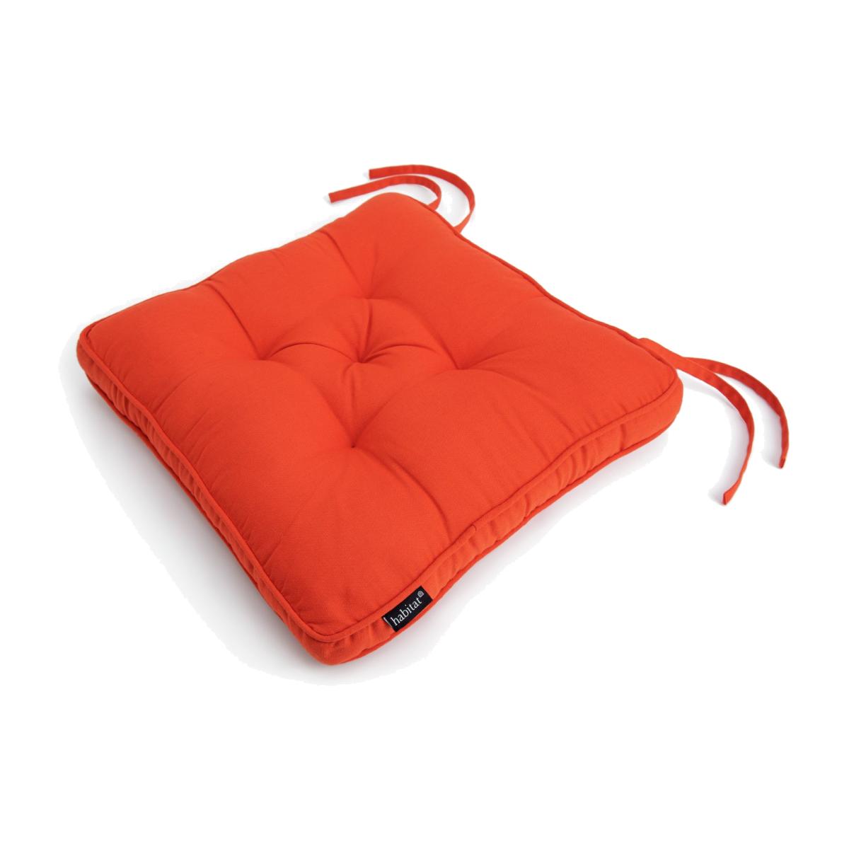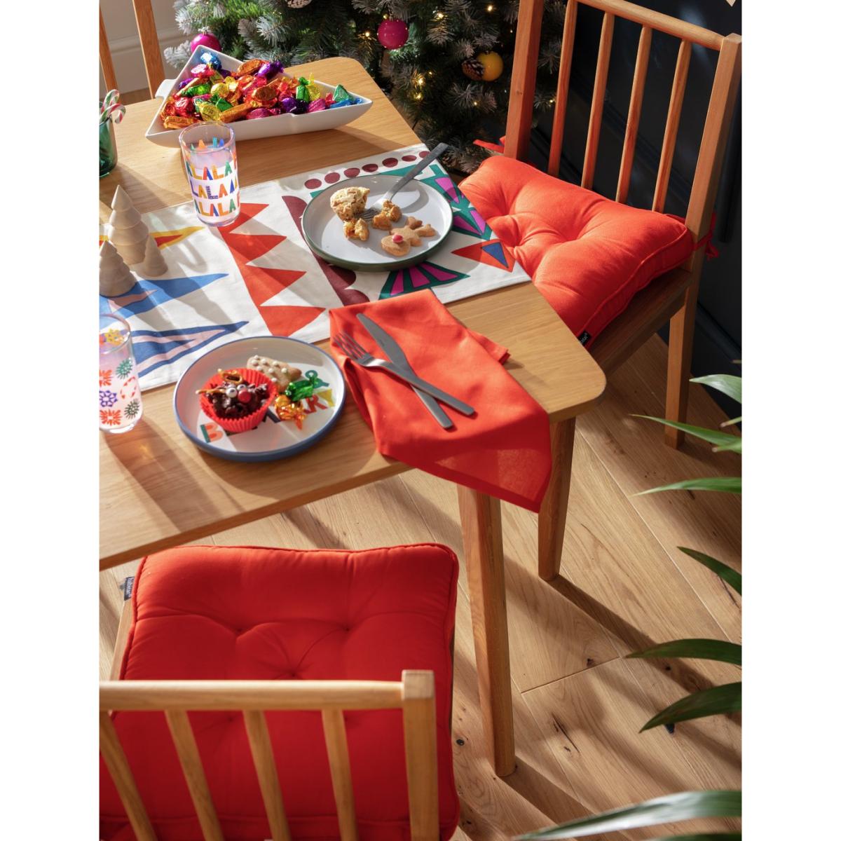 Festive and fabulous. Our pair of vibrant red seat cushions are comfy, bright and just right. Simply pop them onto your dining chairs for an instant uplift. Tufting and piping complete the well-upholstered look. With matching red ties you can fix them in place in a jiffy. Jolly nice. Made from cotton and plumply stuffed with a recycled polyester filling. Cotton cover. Recycled Polyester filling. Secured by ties. Size L40, W40cm. Wipe clean. Manufacturer's 1 year guarantee.