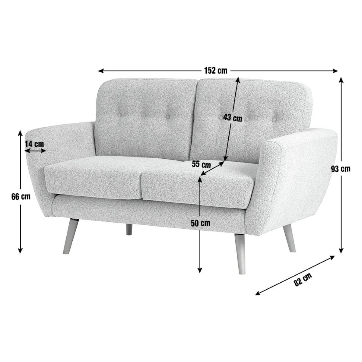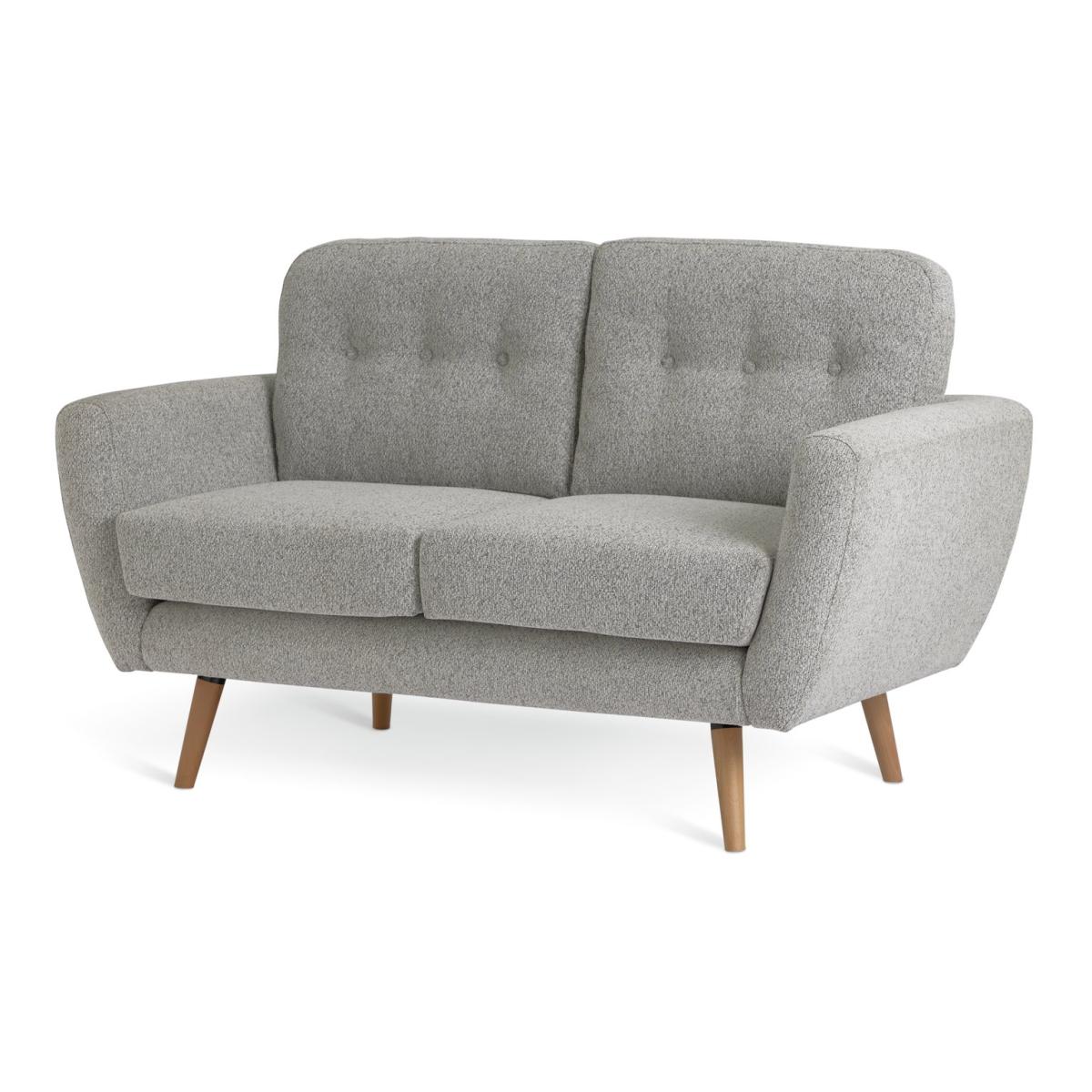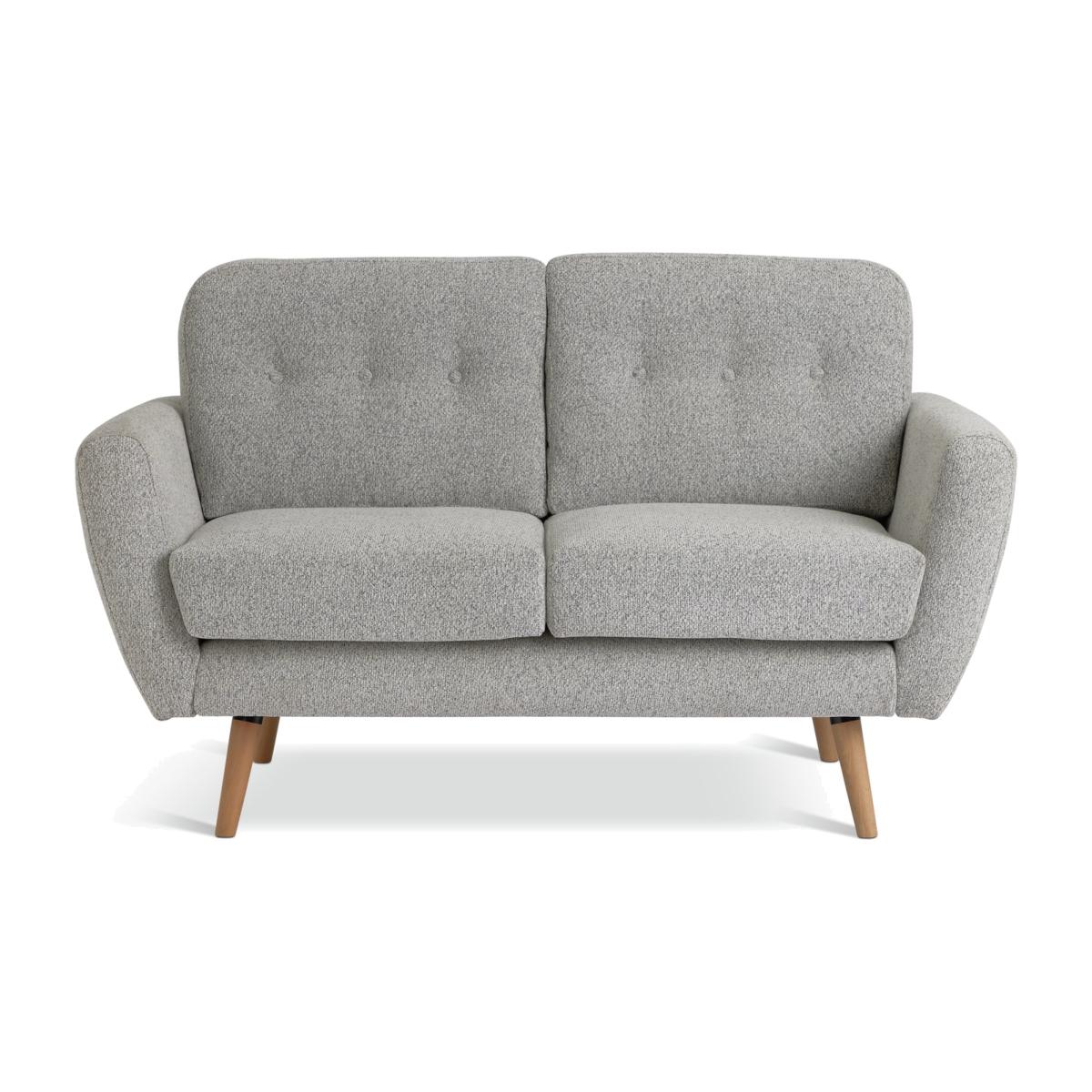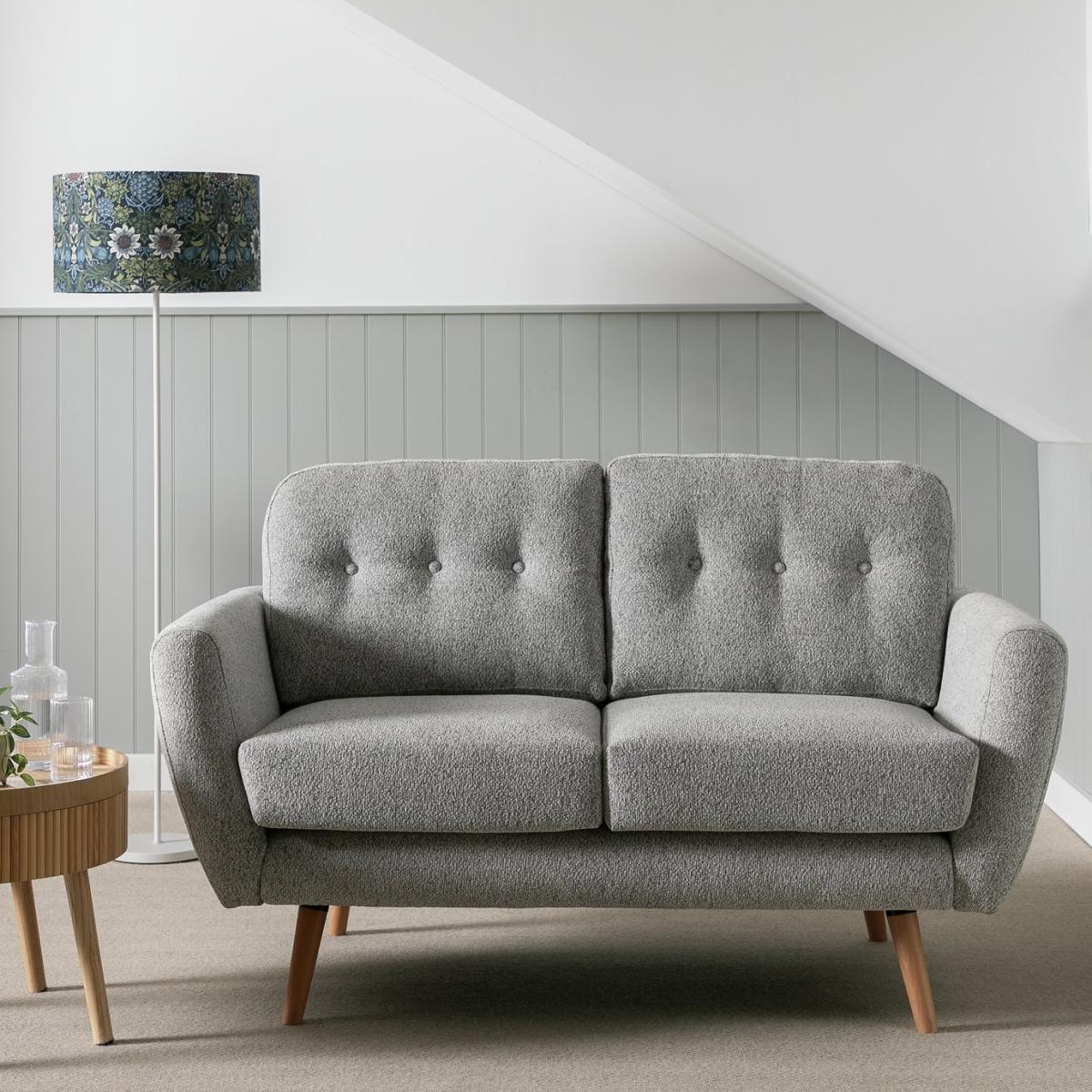 Our comfy compact 2-seater sofa packs a punch. It's Skandi style with retro roots. We're loving the subtle curves, button-back detailing, slim arms and splayed wooden legs. And couldn't you just sink into that deep pocket sprung foam seat? It also comes packed in a box, making it easy to reach you and easier to assemble. Part of the Finney collection. Material: Made from 100% polyester. Wooden feet - light wood. Medium firm seat cushions. Fixed seats with foam fibre wrap filling. Removable cushion(s) with fibre filling. Free fabric swatch available on this line. Dimensions: Size H93, W152, D82cm. Floor to seat height: 50cm. Depth of seat: 55cm. Height of seat back: 43cm. Width of seating area between arms: 117cm. Height of arm rest: 66cm. Weight: 40kg. Packaged dimensions: Package size H36, W122, D78cm. Second package size H49, W77, D58cm. General information: FSC certified meaning the materials used for this product are responsibly sourced. Professional clean only. Plump cushions regularly to maintain shape. Fully assembled. Maximum individual user weight: 180kg. Manufacturer's 2 Year (1 year fabric) guarantee.