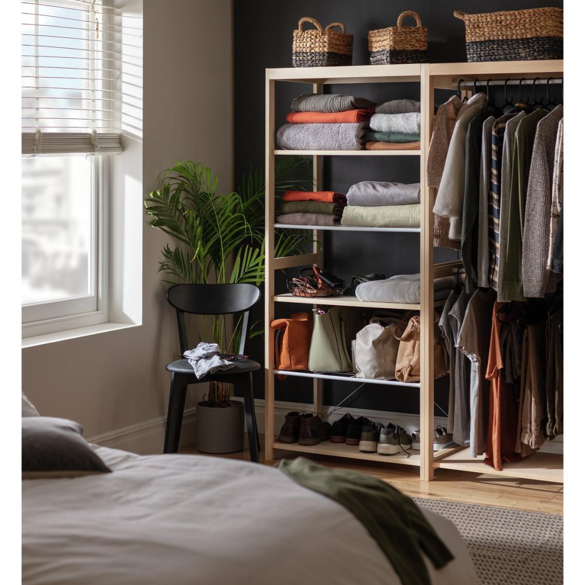 I love this open wardrobe for its clean, versatile look and practical functionality. The pine finish adds warmth, making it suitable for both contemporary and rustic interiors, especially in bedrooms or dressing rooms where a natural, understated aesthetic is desired. Its open design encourages organisation and easy access, perfect for showcasing your favourite clothes and accessories. To style it effectively, consider colour-coordinating folded textiles on the shelves and keeping hangers uniform for a neat appearance. It works particularly well in minimal or Scandinavian-inspired spaces, but can also add a touch of simplicity to more eclectic interiors. Practical tip: adding a small rug underneath can define the space and soften the look.