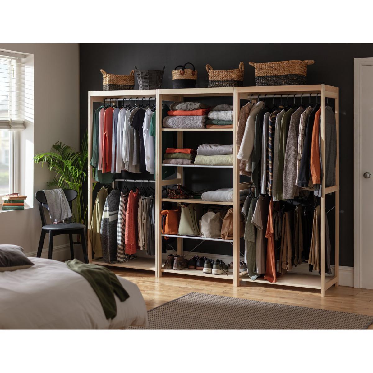I love this Habitat Flicka triple rail wardrobe set because of its clean, natural pine finish, which works well in both modern and Scandinavian-style interiors. It offers versatile storage with multiple hanging rails and open shelves, making it practical for organising everything from everyday outfits to seasonal pieces. Perfect for bedrooms with limited closet space, it can be styled with baskets or decorative boxes on top for a personalised touch. When styling, keep the rails looking tidy by grouping similar garments and using colour coordination for a streamlined look. It’s a flexible storage solution that adds warmth and functionality to your room without overwhelming the space.
