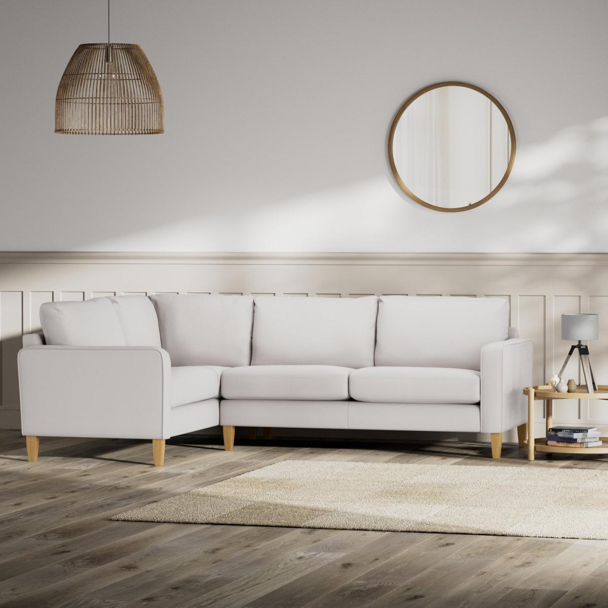 When it's made for you, you know you'll love it. More seat, less arm, more style, less fuss. The clean lines of the Flint corner sofa are neat and compact. The supportive, firm seats and plump back cushions are made for relaxing. Upholstered in a contemporary Aquaclean Chenille, the Flint has a smooth but tonal look. With piping detailing for a tailored finish. Offering a more supportive seat, the Flint's cushions use high density foam core wrapped in fibre wadding to create the perfect balance of support, durability and recovery. Hand made to order in the UK, the Flint uses quality materials and traditional techniques for furniture that's unique to you. Available in a choice of sizes and fabrics including Aquaclean technology protection built into the yarn, which is easy to clean with just water. Part of the Flint collection. Left hand corner. Material: Made from 100% polyester. Wooden feet. Removable seats with foam fibre wrap filling. Removable cushion(s) with foam fibre wrap filling. Dimensions: Size H89, longer width 254, shorter width 174,. Floor to seat height: 49cm. Depth of seat: 81cm. Height of seat back: 47cm. Shorter seating area width between arms: 127cm. Longer seating area width between arms: 226.5cm. Height of arm rest: 65cm. Weight: 74kg. Packaged dimensions: Package size H94, W169, D95cm. Second package size H94, W179, D95cm. General information: FSC certified meaning the materials used for this product are responsibly sourced. Your seat cushions may feel a little firm on delivery, they are brand new and will soften with regular use over the next few months. We do more than deliver your product, we unpack, set it up and take away the packaging. Manufactured in the UK using components sourced globally. Professional clean only. Plump cushions regularly to maintain shape. Manufacturer's 15 year frame guarantee.