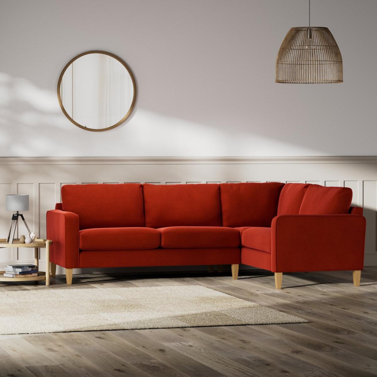 When it's made for you, you know you'll love it. More seat, less arm, more style, less fuss. The clean lines of the Flint corner sofa are neat and compact. The supportive, firm seats and plump back cushions are made for relaxing. Upholstered in a contemporary Velvet, the Flint has a smooth but tonal look. With piping detailing for a tailored finish. Offering a more supportive seat, the Flint's cushions use high density foam core wrapped in fibre wadding to create the perfect balance of support, durability and recovery. Hand made to order in the UK, the Flint uses quality materials and traditional techniques for furniture that's unique to you. Available in a choice of sizes and fabrics including Aquaclean technology protection built into the yarn, which is easy to clean with just water. Part of the Flint collection. Right hand corner. Material: Made from 100% recycled polyester. Wooden feet. Removable seats with foam fibre wrap filling. Removable cushion(s) with foam fibre wrap filling. Dimensions: Size H89, longer width 254, shorter width 174,. Floor to seat height: 49cm. Depth of seat: 81cm. Height of seat back: 47cm. Shorter seating area width between arms: 127cm. Longer seating area width between arms: 226.5cm. Height of arm rest: 65cm. Weight: 74kg. Packaged dimensions: Package size H94, W169, D95cm. Second package size H94, W179, D95cm. General information: FSC certified meaning the materials used for this product are responsibly sourced. Your seat cushions may feel a little firm on delivery, they are brand new and will soften with regular use over the next few months. We do more than deliver your product, we unpack, set it up and take away the packaging. Manufactured in the UK using components sourced globally. Professional clean only. Plump cushions regularly to maintain shape. Manufacturer's 15 year frame guarantee.