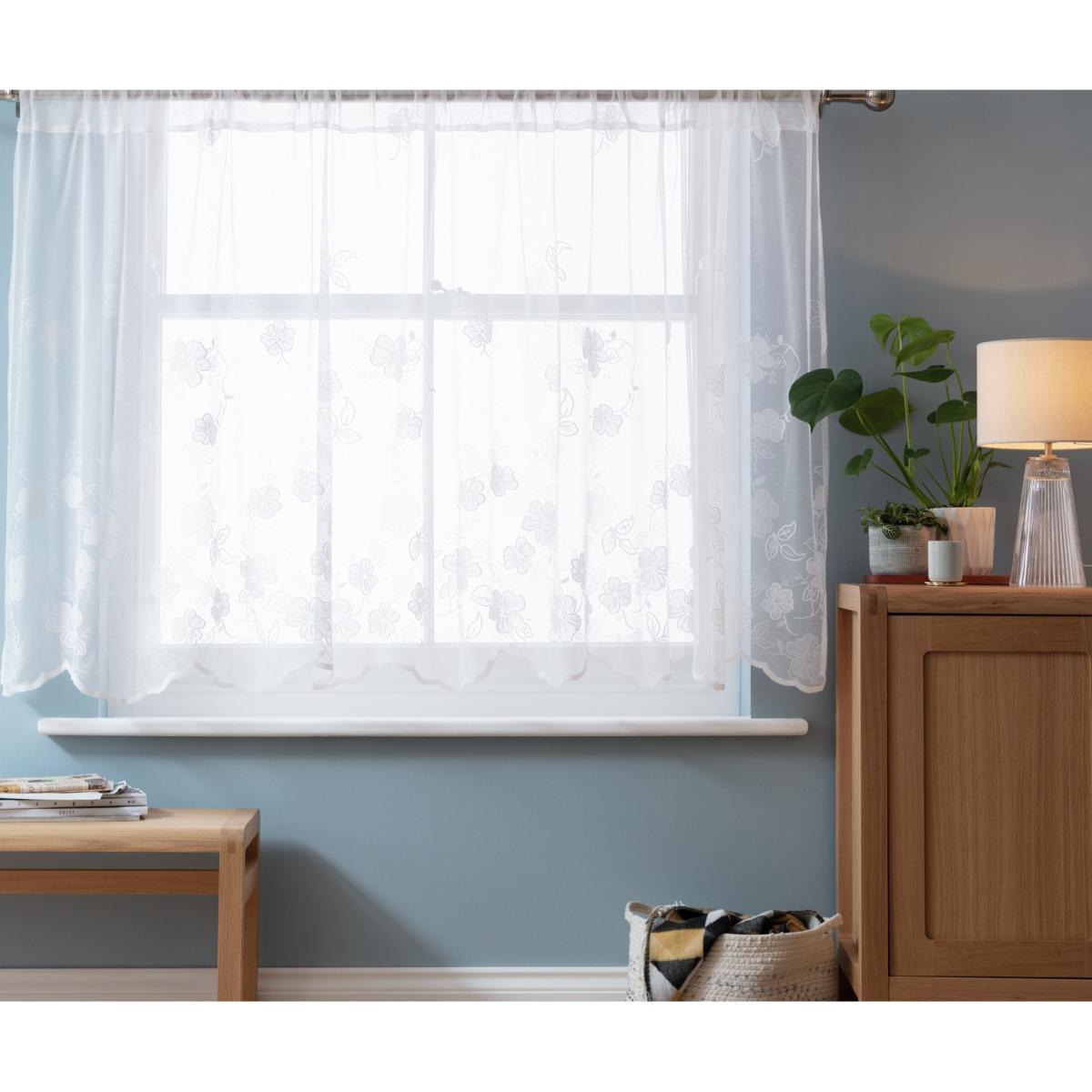 Sheer delight. Keep things bright and airy with this handy net curtain. It features a scalloped hem and fun floral design that protects privacy while allowing natural light to filter through. And it couldn't be easier to hang. You can slide it onto your curtain rod or pole in seconds.