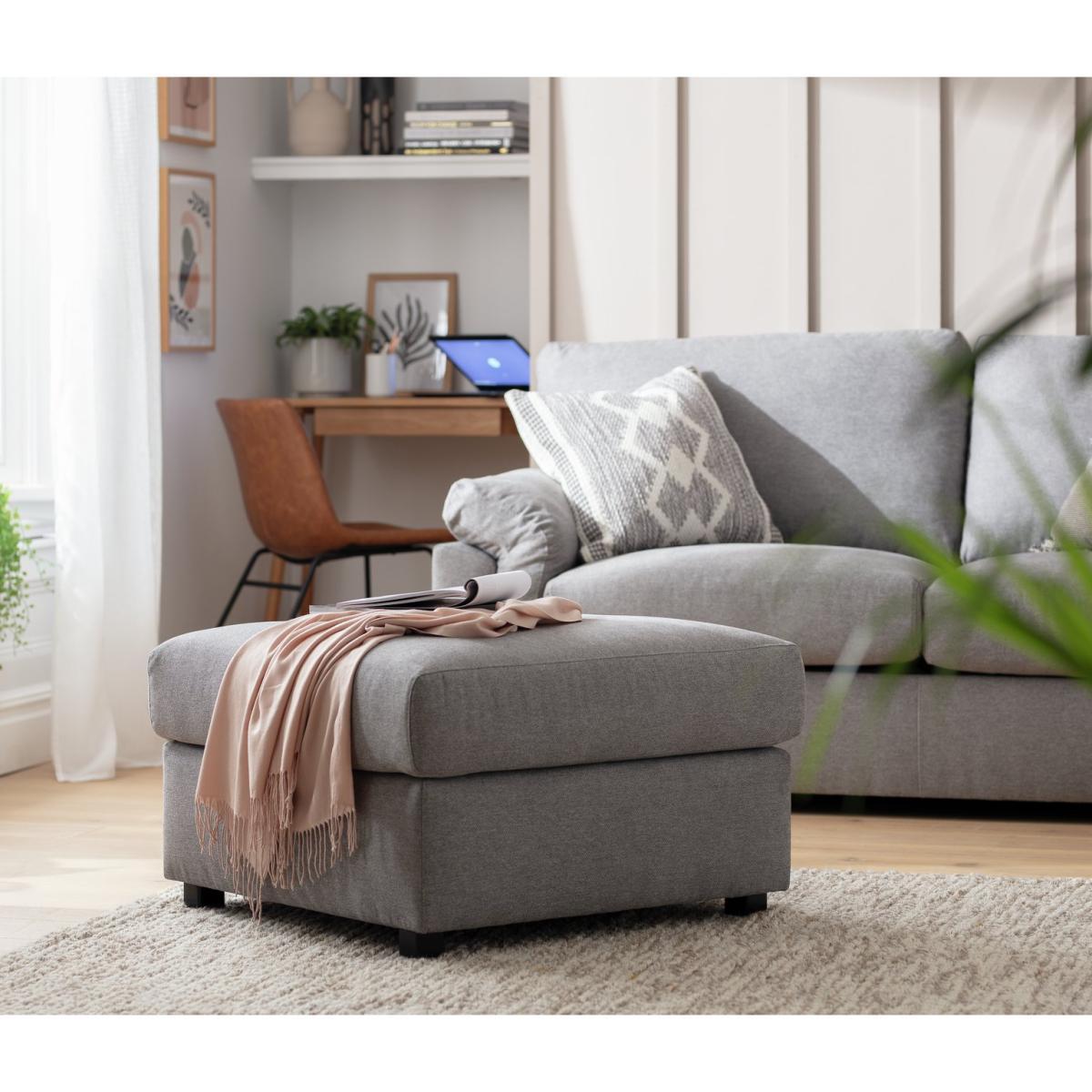 Kettle on, feet up. Handmade with a soft grey fabric finish, the Florence footstool was made for stretching out and relaxing. A fixed firm foam cushion provides support, while chunky dark wooden feet complete this contemporary piece. Luxe lounging? You know it.