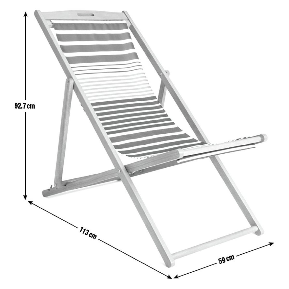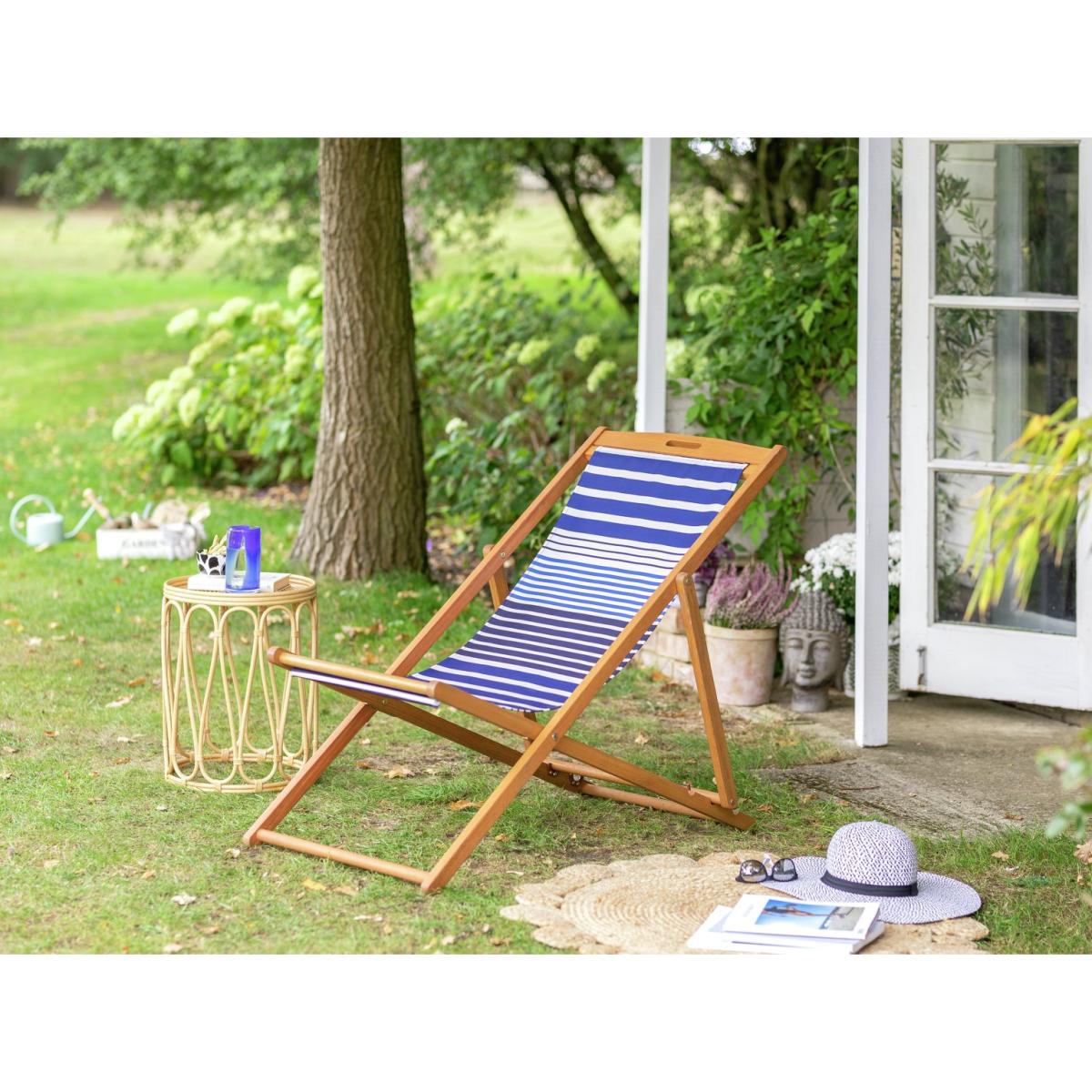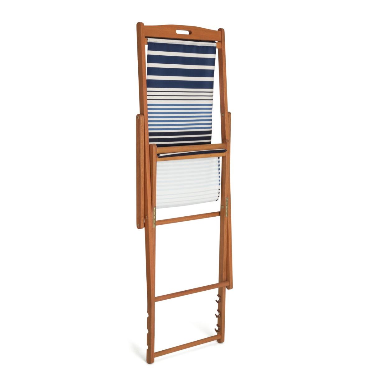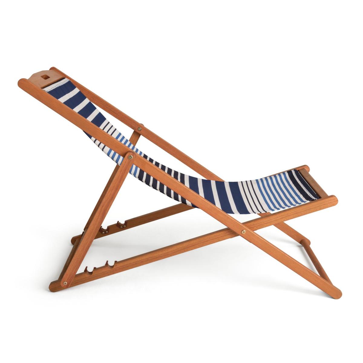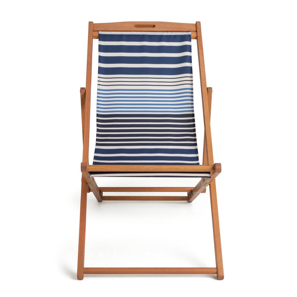Kick back and relax. Designed with classically nautical stripes, this naturally gorgeous weather resistant wooden deckchair is made for traditional chilling. You can read, rest and repeat whenever you wish. It has 3 different reclining positions, including flat out for some serious sun soaking. And if the weather turns, simply fold your chair away. A comfy companion for the garden, the beach and beyond. Solid wood frame. Chair seat and back made from polyester. 3 reclining positions. Multi-position recliner. Reclines to flat position. Folds for storage. Dimensions: Size H92.7, W59, D113cm. Weight 5kg. Seat height from ground 36cm. Seating area size W44.5,. Maximum user weight 160kg. Folded size H134, W59, D4cm. Package Dimensions: Package 1 dimensions: H145.5, W61, D7cm. Package 1 weight:6.7kg. General information: Fully assembled - 1 person required. Store inside when not in use. Cover or store inside in winter months to prolong life of product. Cushion not included. FSC certified meaning the materials used for this product are responsibly sourced. Manufacturer's 1 year guarantee.