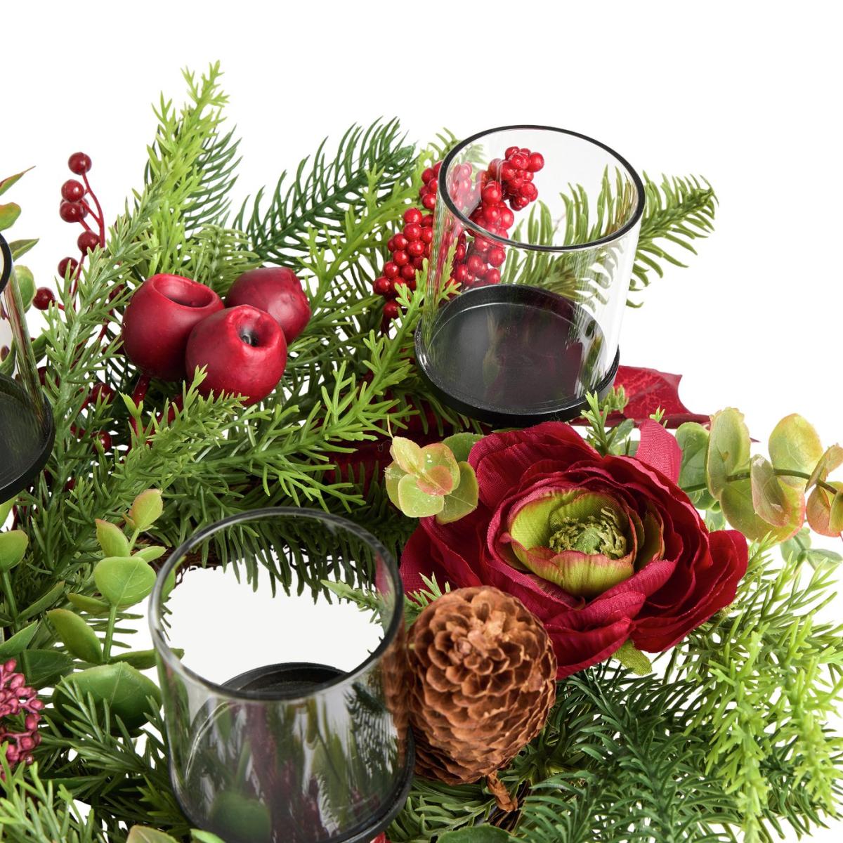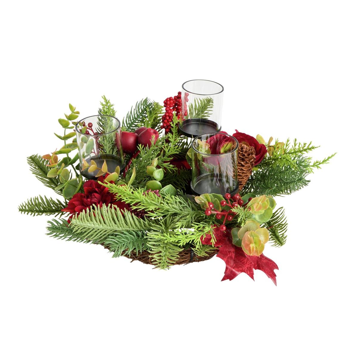 Your centrepiece sorted. Our lush green faux foliage candle holder is entwined with vibrant red berries and rustic pinecones. Three candle holders nestle inside. It's ready to adorn your dining table, mantelpiece or sideboard. No wilting, no watering, just instant seasonal style. Size H13, W33, D33cm. Diameter 7cm. Size (small) H5.5, W5, D5cm.