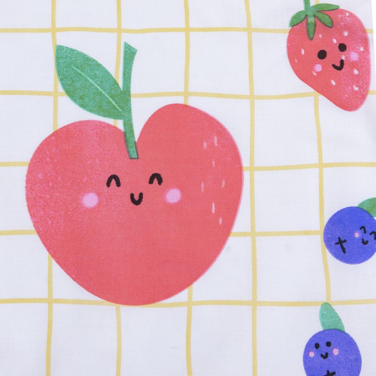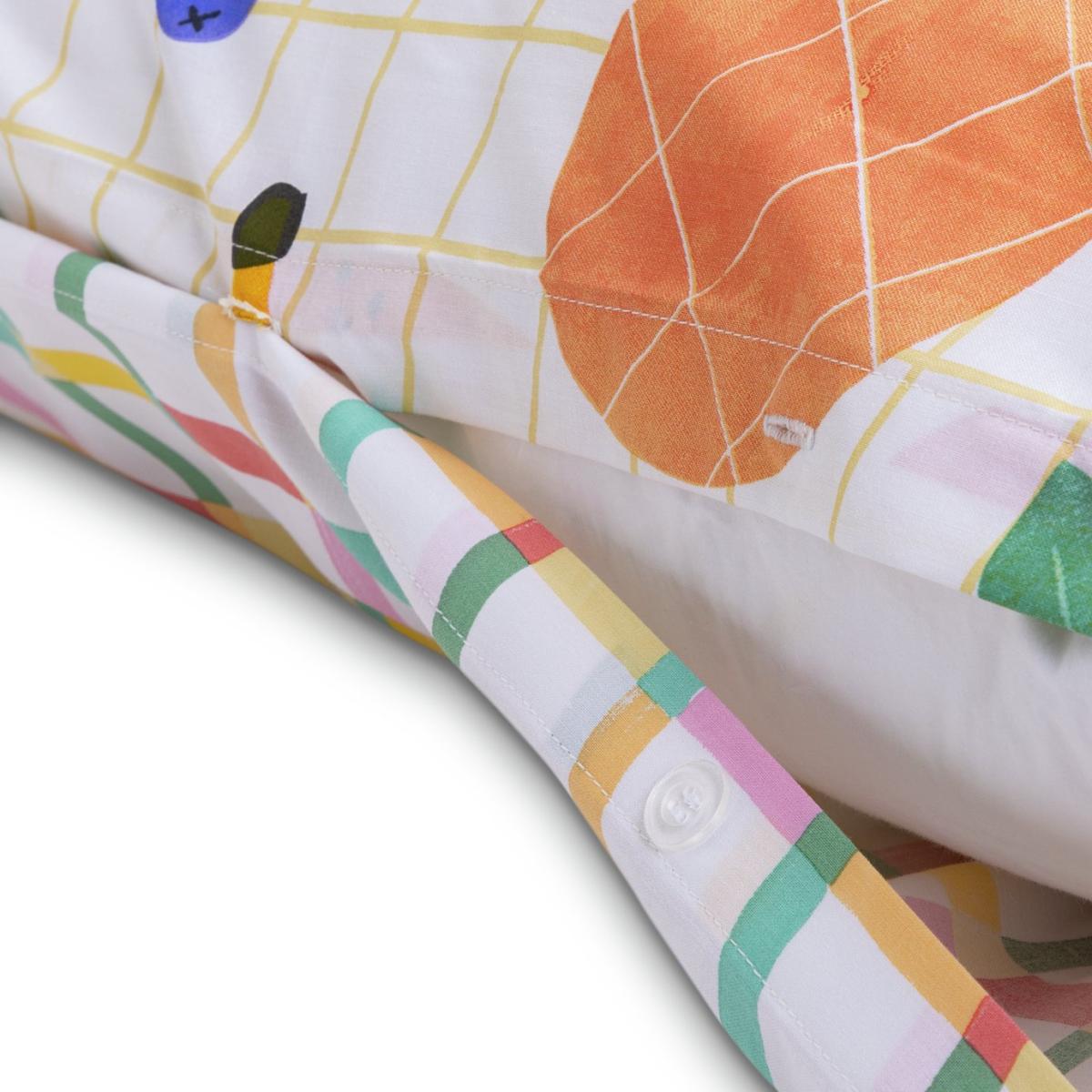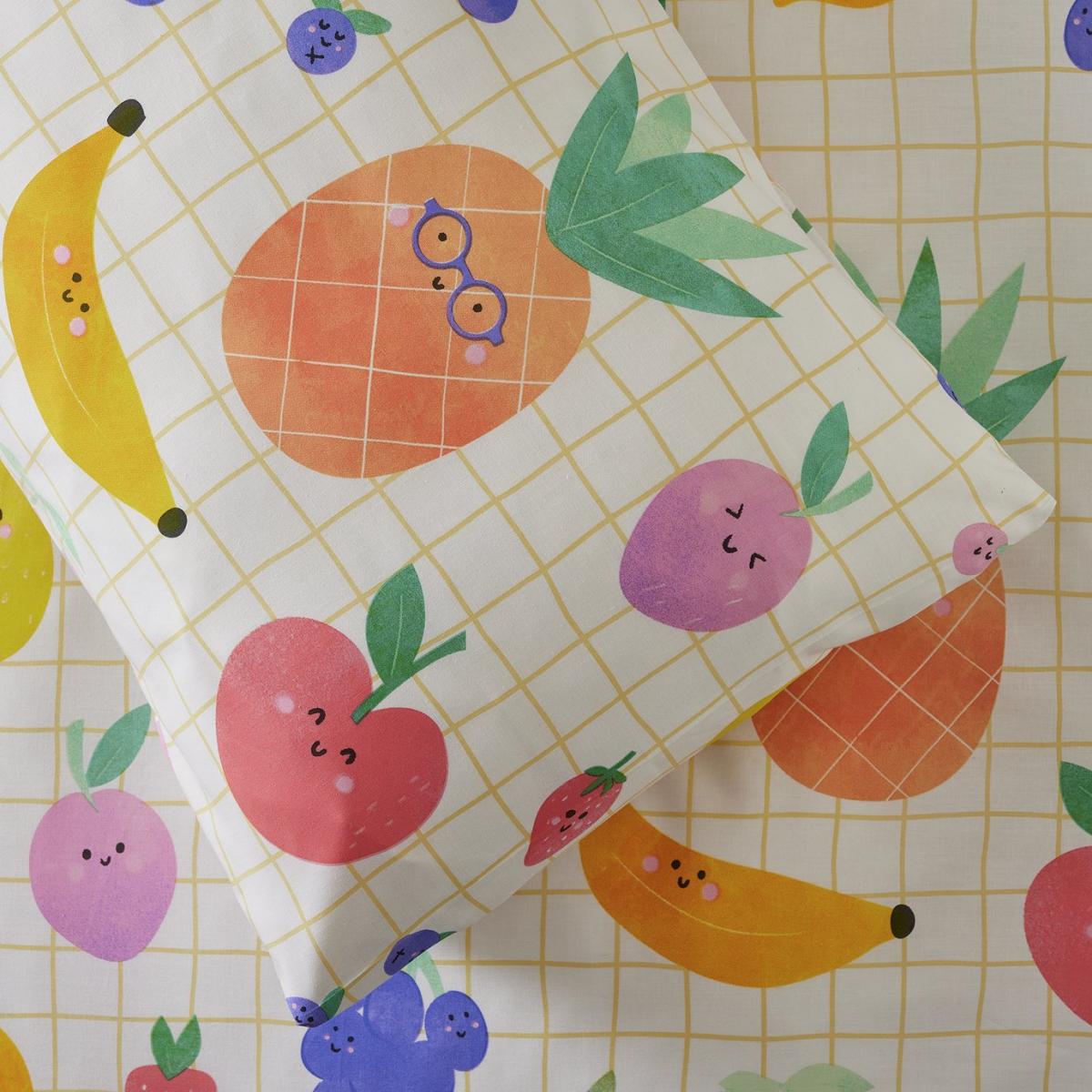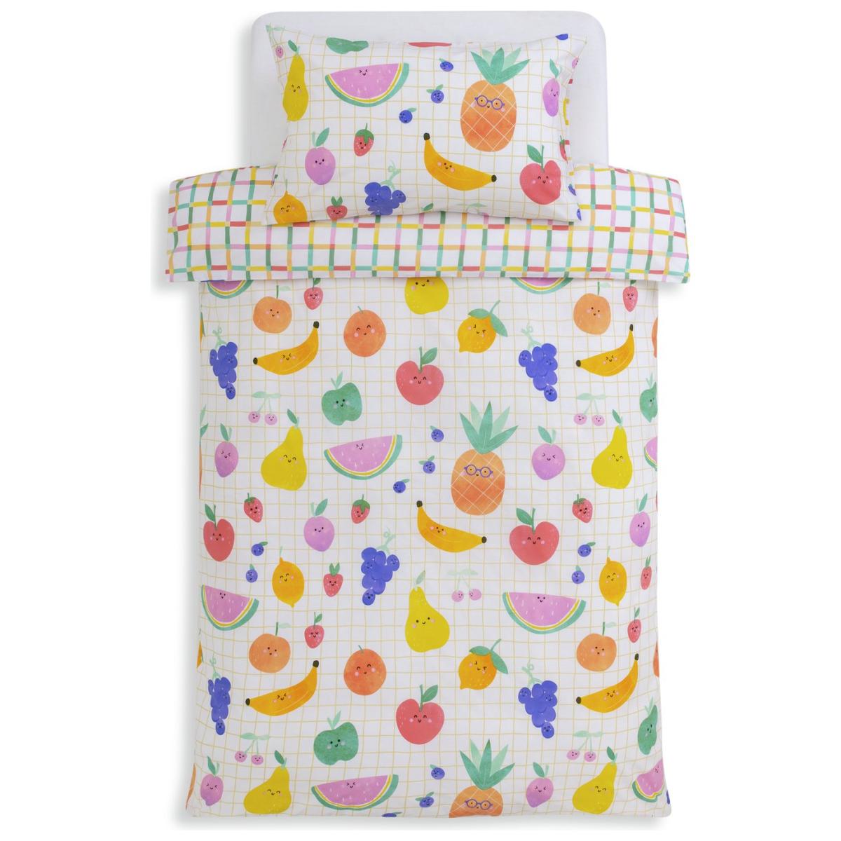Joyous and fun. Our toddler bedding set is packed with cheerful fruit characters to bring a delightful refresh to your kids' bedroom. Cheeky cherries, beaming bananas and grinning grapes feature in the playful pattern. When you're in the mood for a refresh, just flip it over to reveal a colourful check print. Set comprises of 1 duvet cover and 1 pillowcase. Multicoloured Fruits pattern. Fabric finish: percale. Size L150 x W120cm. Pillow case length 60cm, Width 40cm. Standard pillowcase (s). Reversible pillowcase (s). Reversible. Buttons for fastening. Machine washable at 40 C. Suitable for tumble drying. 100% polycotton. percale.