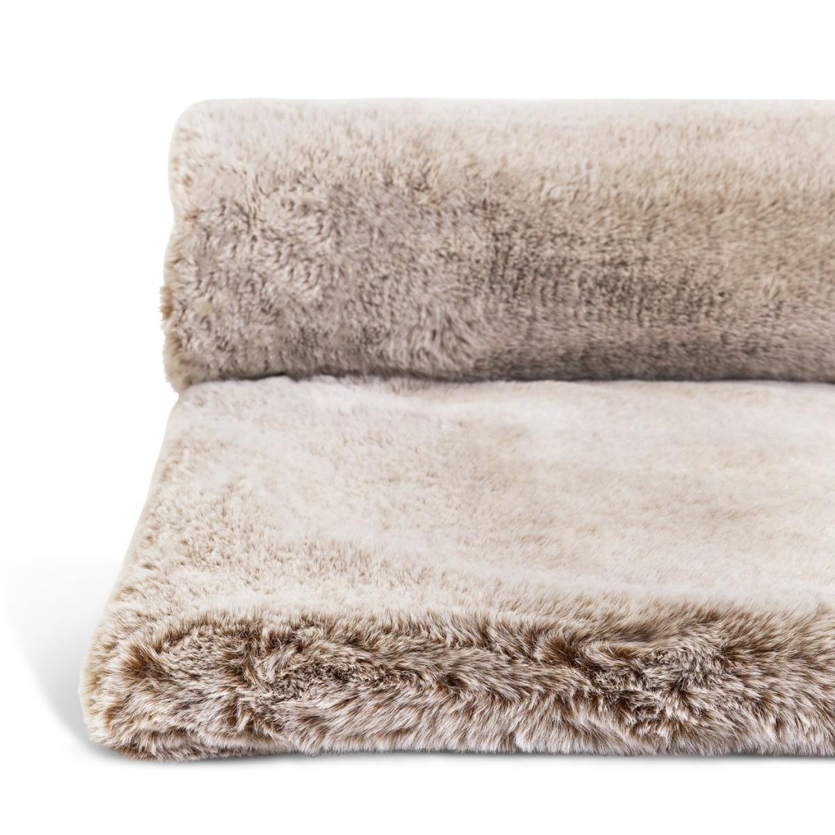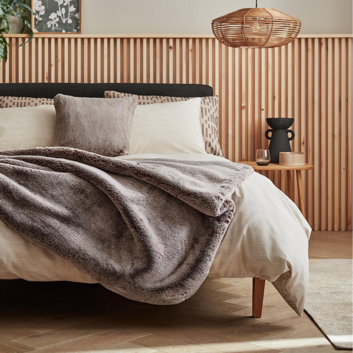 Our faux fur throw brings you the soft, deep feel of the real thing. Luxurious and inviting it will instantly give a sumptuous look to a room. Whether you use it to layer up a bed, or as your cuddle buddy on chilly nights. It's an interior game change. Features faux fur one side and a smooth reverse. Now how about spoiling yourself with some cushions to match? 100% polyester. Size L125, W150cm. Machine washable.