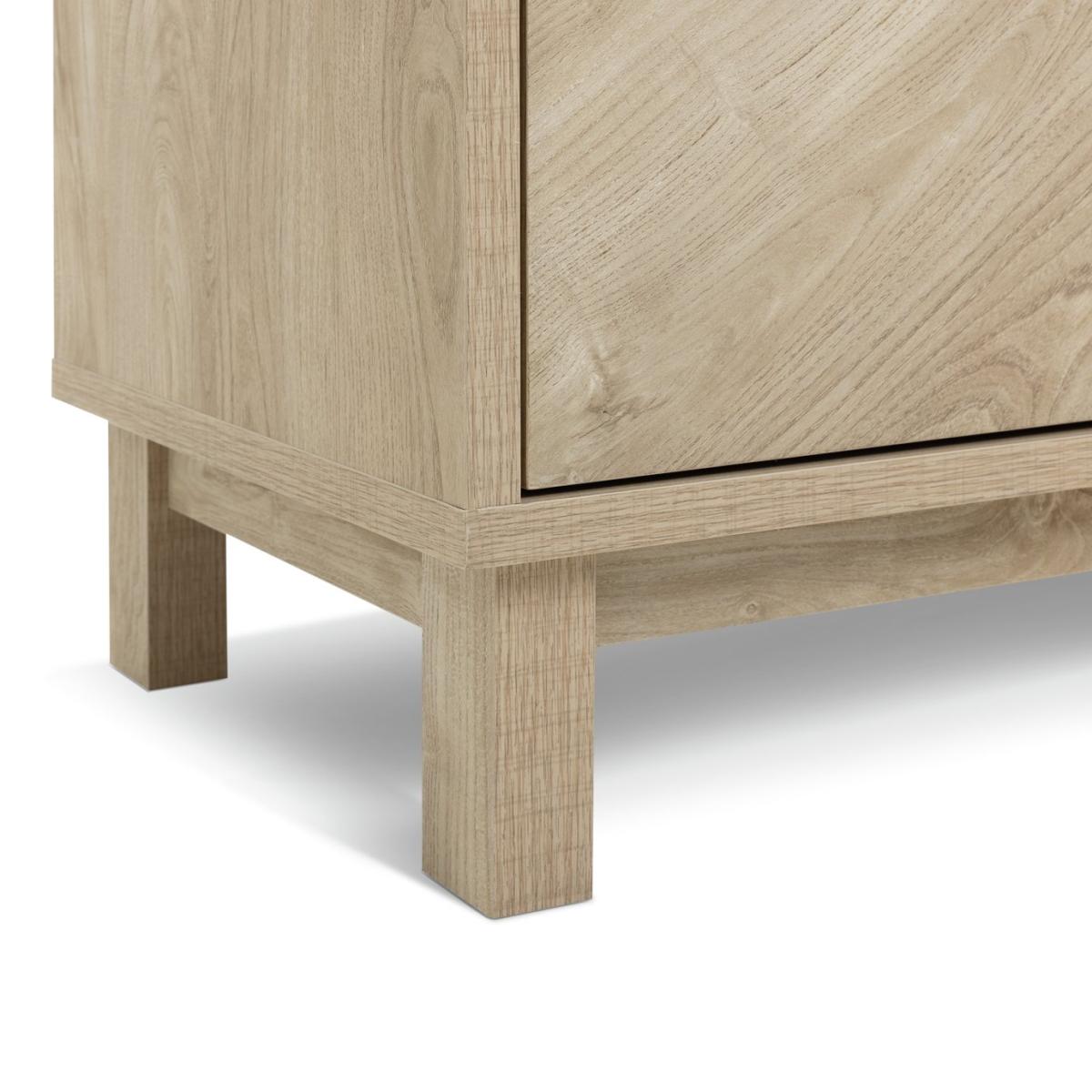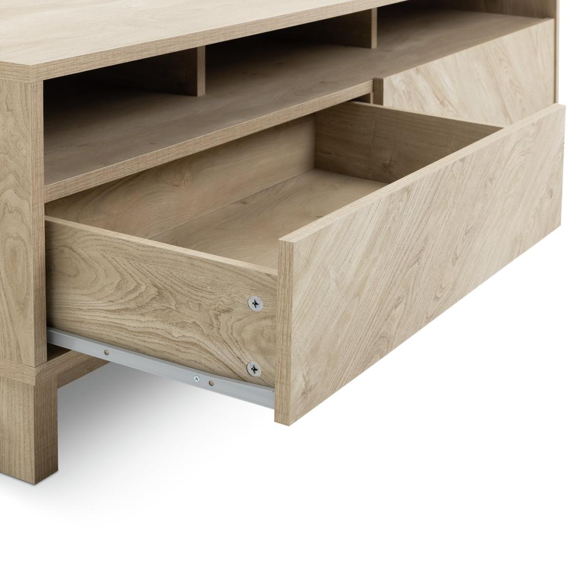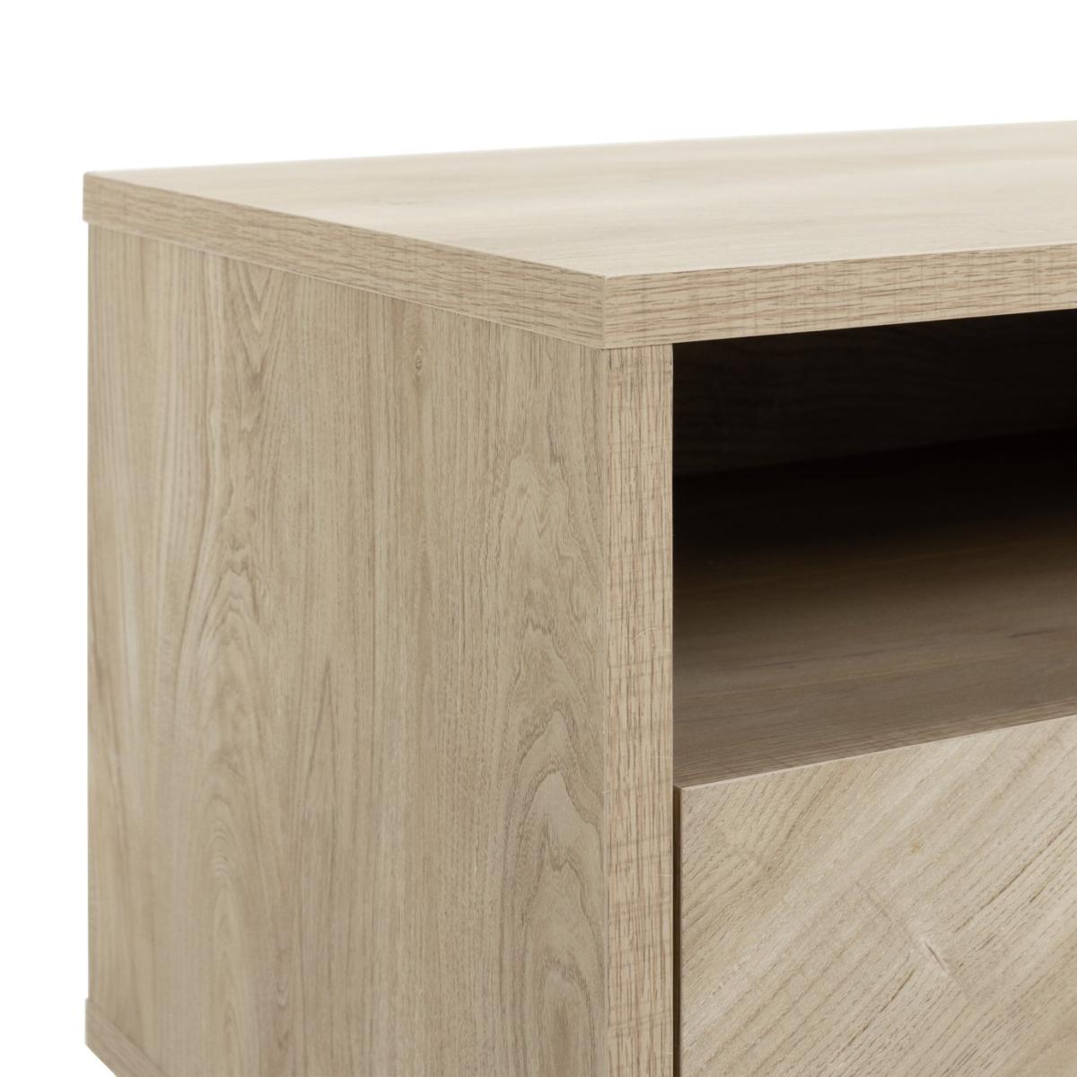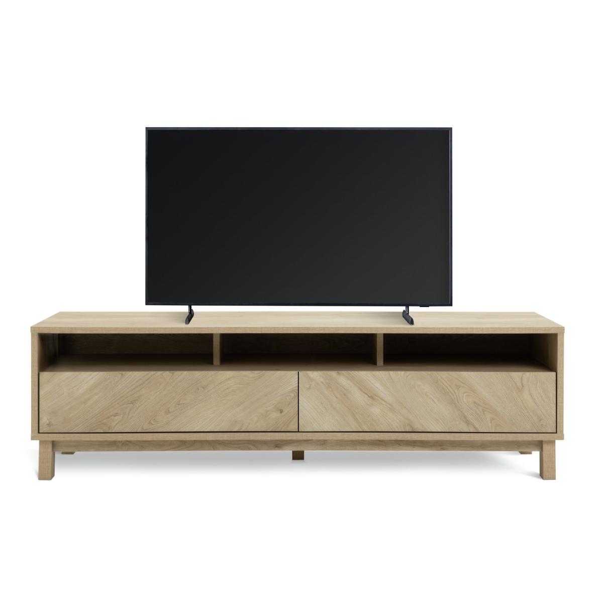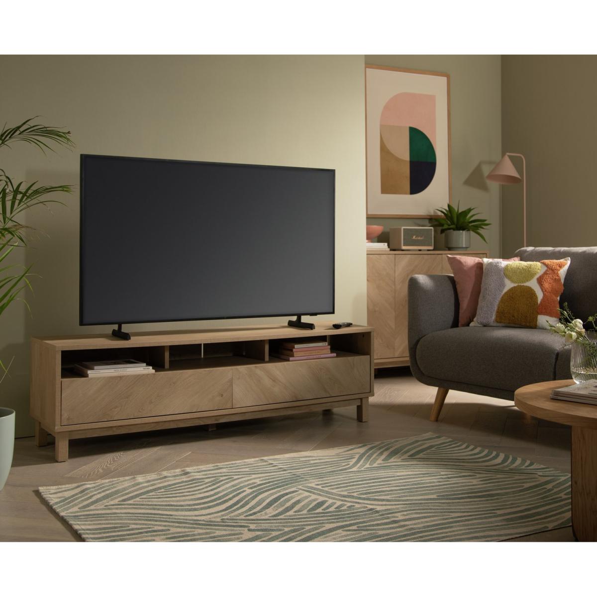 Show off the chevron. Here's a Scandi-style oak effect tv unit to draw in the compliments. Upscale smart but modern and minimal. Wide enough to hold a 65 inch screen. With 3 open shelves for your gaming and entertainment consoles and 2 large drawers. No wonder we're such fans of Fynn. Silent storage, the 2 drawers open smoothly on metal runners. Part of the Fynn collection. Made from MDF with a wood effect finish. Size H 45, W 150, D 39.7cm. Weight 38.5kg. 2 drawers with metal runners. 3 shelves. 3 media storage sections. Largest height of media equipment sections 11.8cm. Easy cable access. Suitable for screen sizes up to 65in. Maximum weight of TV 40kg. Self-assembly - 2 people recommended. Package Dimensions: Package 1 dimensions: H12.6, W175.1, D43.4cm. Package 1 weight: 46.7kg. General information: We are excited to be welcoming some of our favourite HOME products into the Habitat range. Your product may arrive in Habitat or HOME packaging.
