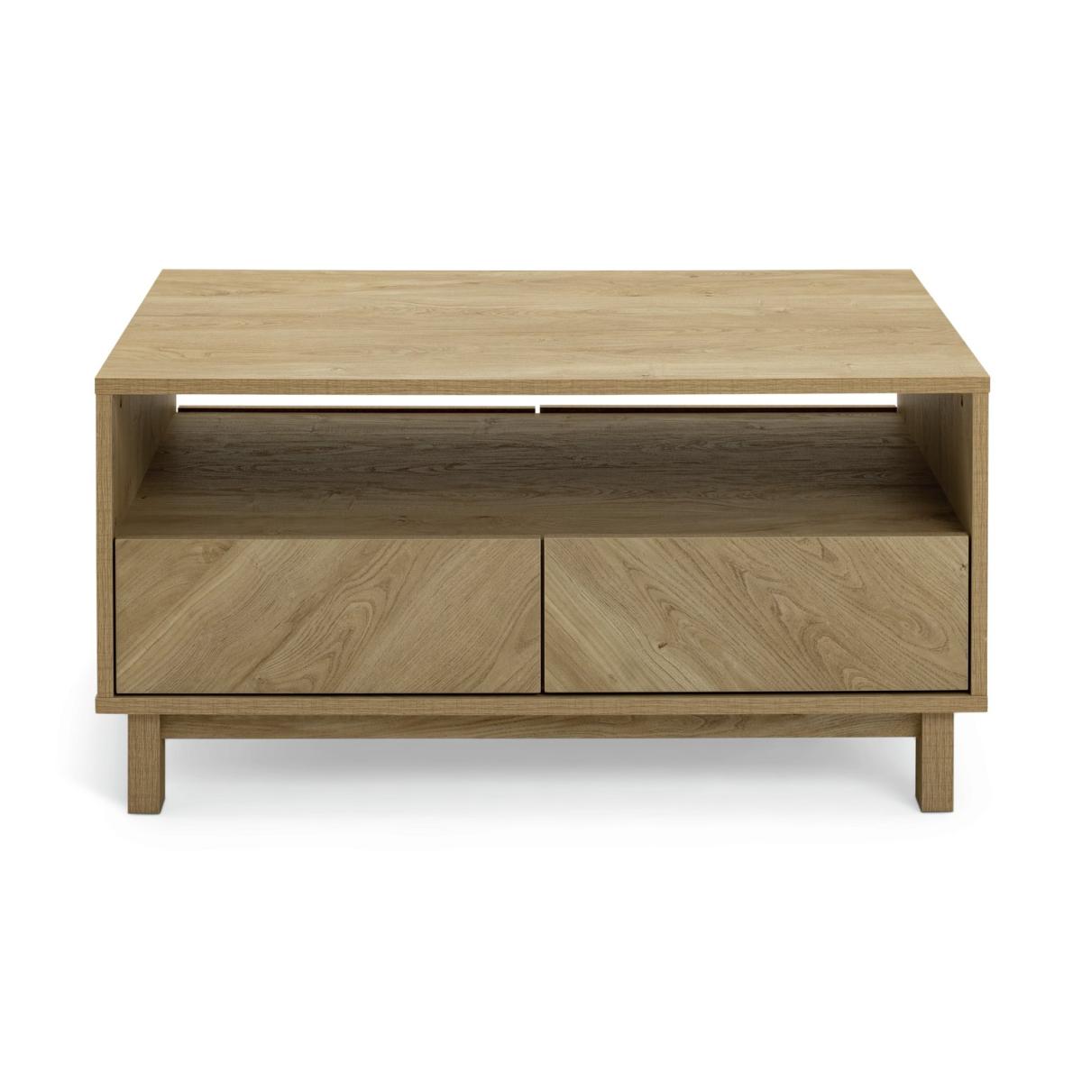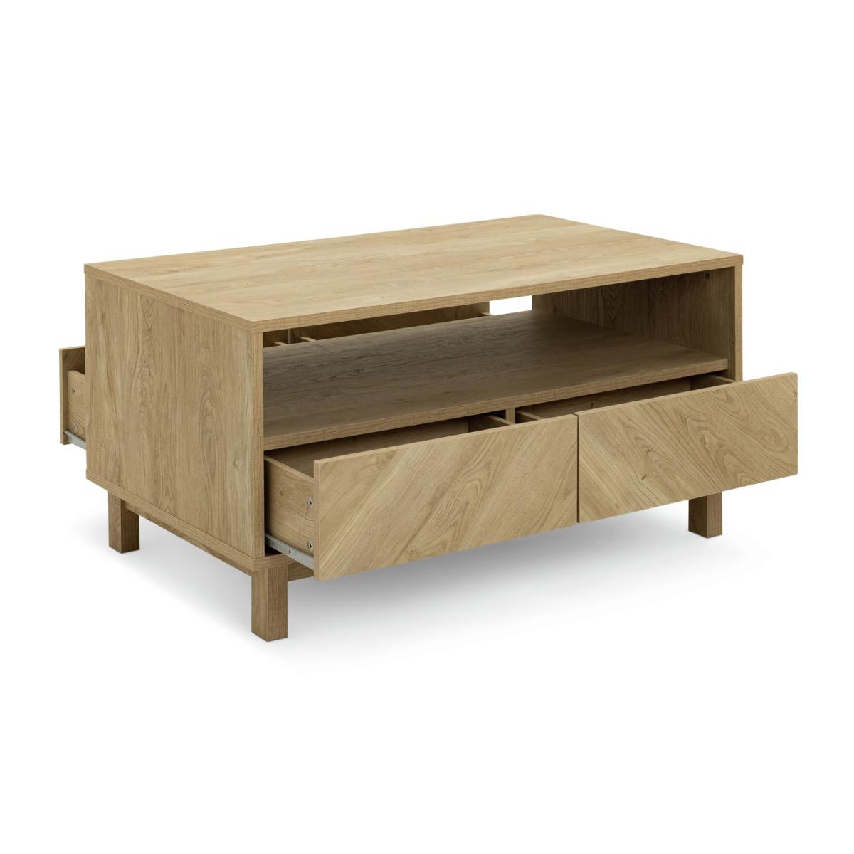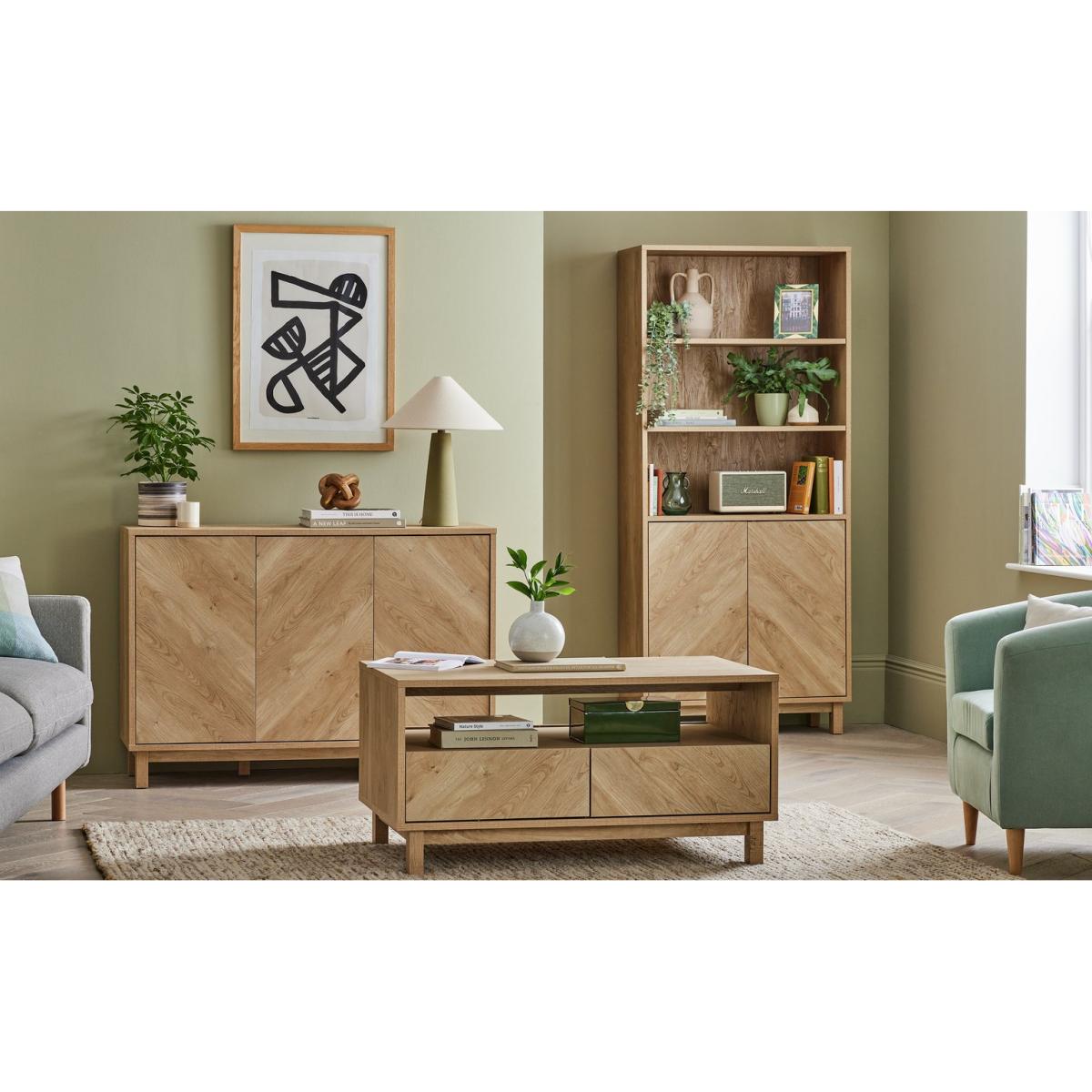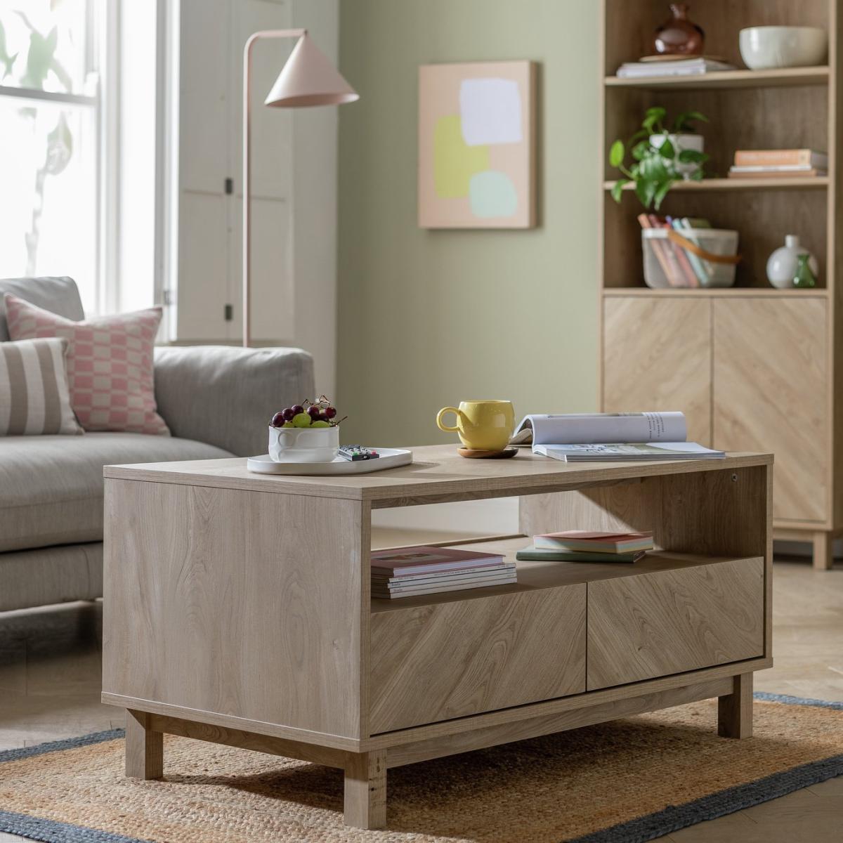 Show off the chevron. Here's a Skandi style oak effect coffee table to draw the compliments. Upscale smart but modern and minimal. There's a big open space that's ideal for keeping books or mags handy. Plus, the 4 smooth fronted drawers push open to reveal handy stash away space. No wonder we're such fans of Fynn. Part of the Fynn collection. Size H 50, W 100, D 59.6cm. Made from MDF with a wood effect finish. 4 drawers with metal runners. 1 undershelf. Weight 40.8kg. Self-assembly - 2 people recommended. Maximum load weight 18kg. Package Dimensions: Package 1 dimensions: H11.7, W110.9, D64.8cm. Package 1 weight: 42.9kg. General information: We are excited to be welcoming some of our favourite HOME products into the Habitat range. Your product may arrive in Habitat or HOME packaging. Manufacturer's 1 year guarantee.