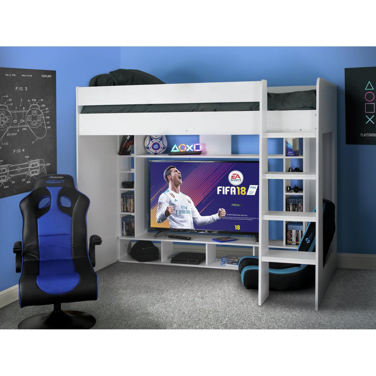 It's game on with this awesome gaming high sleeper. With built-in space for a 55 inch TV, storage for games and multiple consoles, and space to store up to two gaming rocker chairs, this bed is the ultimate bit of kit for your young gaming expert. Create a gaming centre in their room and reclaim your lounge! With wide double-layer steps reinforced with steel bars, the gaming highsleeper is designed with strength and stability in mind, and of course, maximum gaming pleasure.