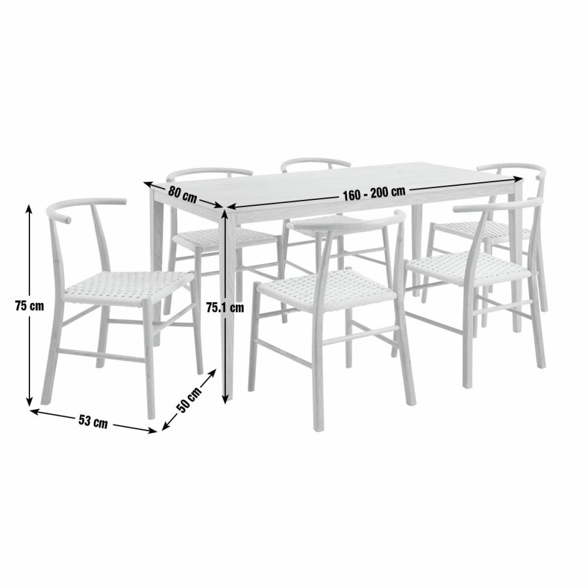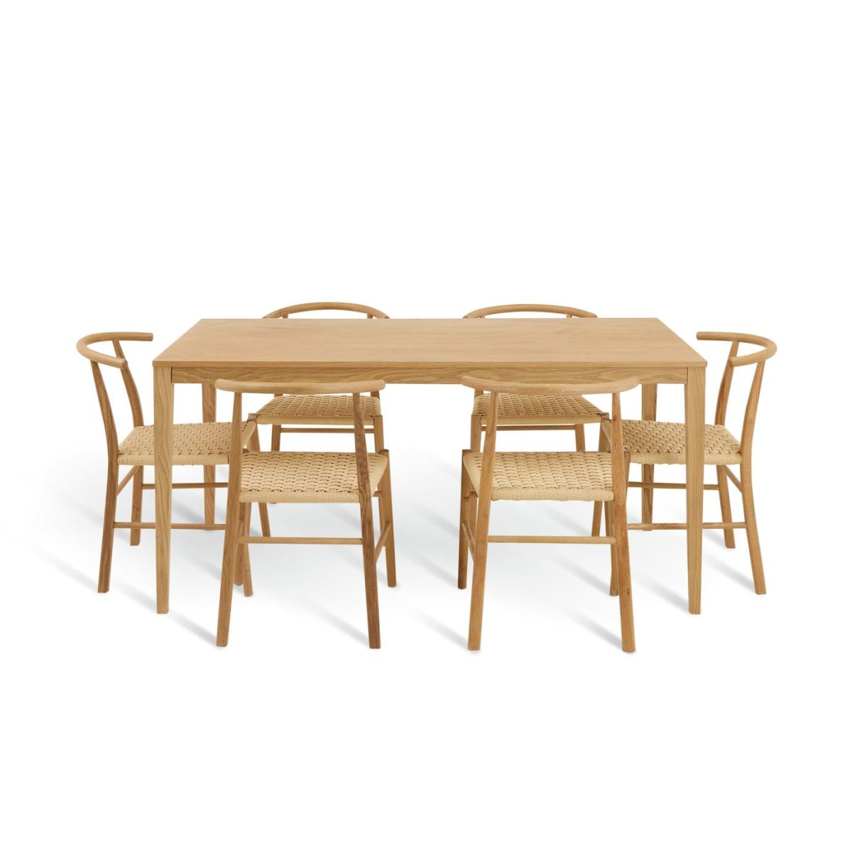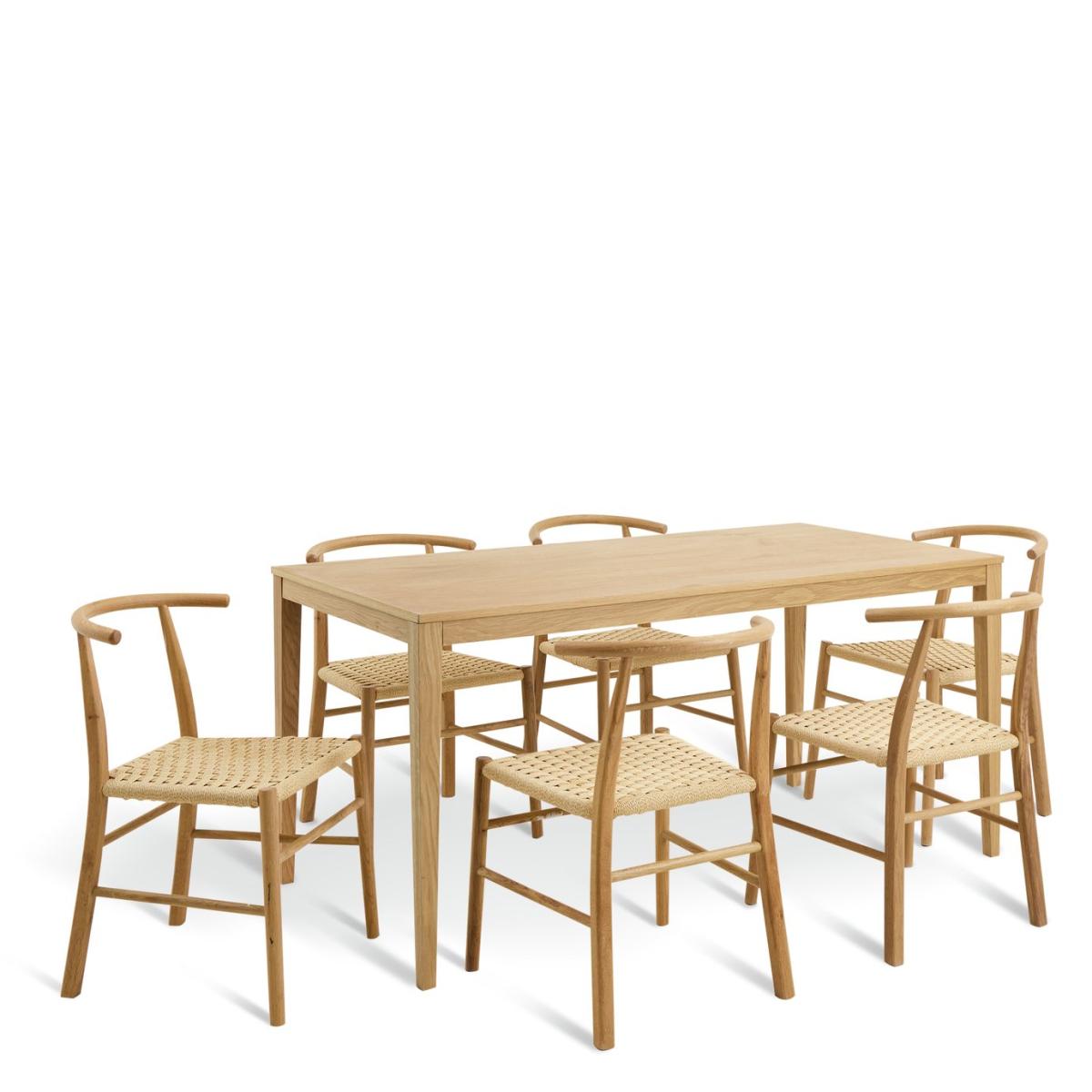 Naturally understated. Our Garcia dining set suits both minimalist and country kitchen styles. Set on solid wood legs, the oak veneer table top has an organic finish. Cleverly convenient. Just pop in the side leaf extension to switch it from a 6-seater to an 8-seater in a flash. Six Scottie chairs complete the look. Curved and comfy with a traditional wishbone design and paper rattan woven seats. Tasteful and timeless. Part of the Garcia collection. Table: Table size H75.1, W80, L160cm. Size of table extended L200cm. Integral table extension. Removable table extension piece. Real wood veneer table with solid wood legs. Oak table top finish. Self-assembly - 2 people recommended. Chair: Includes 6 chairs. Size of each chair H75, W50, D53cm. Seat height 44cm. Solid wood frame with oak legs. Rattan effect seat pad. Self-assembly. Maximum user weight per chair 100kg. Individual chair weight 3.8kg. Package Dimensions: Table package 1 size H9, W99.5, D169.5cm. Individual chair package size H56, W54, D79cm. General information: Manufacturer's 1 year guarantee. Do not wash.